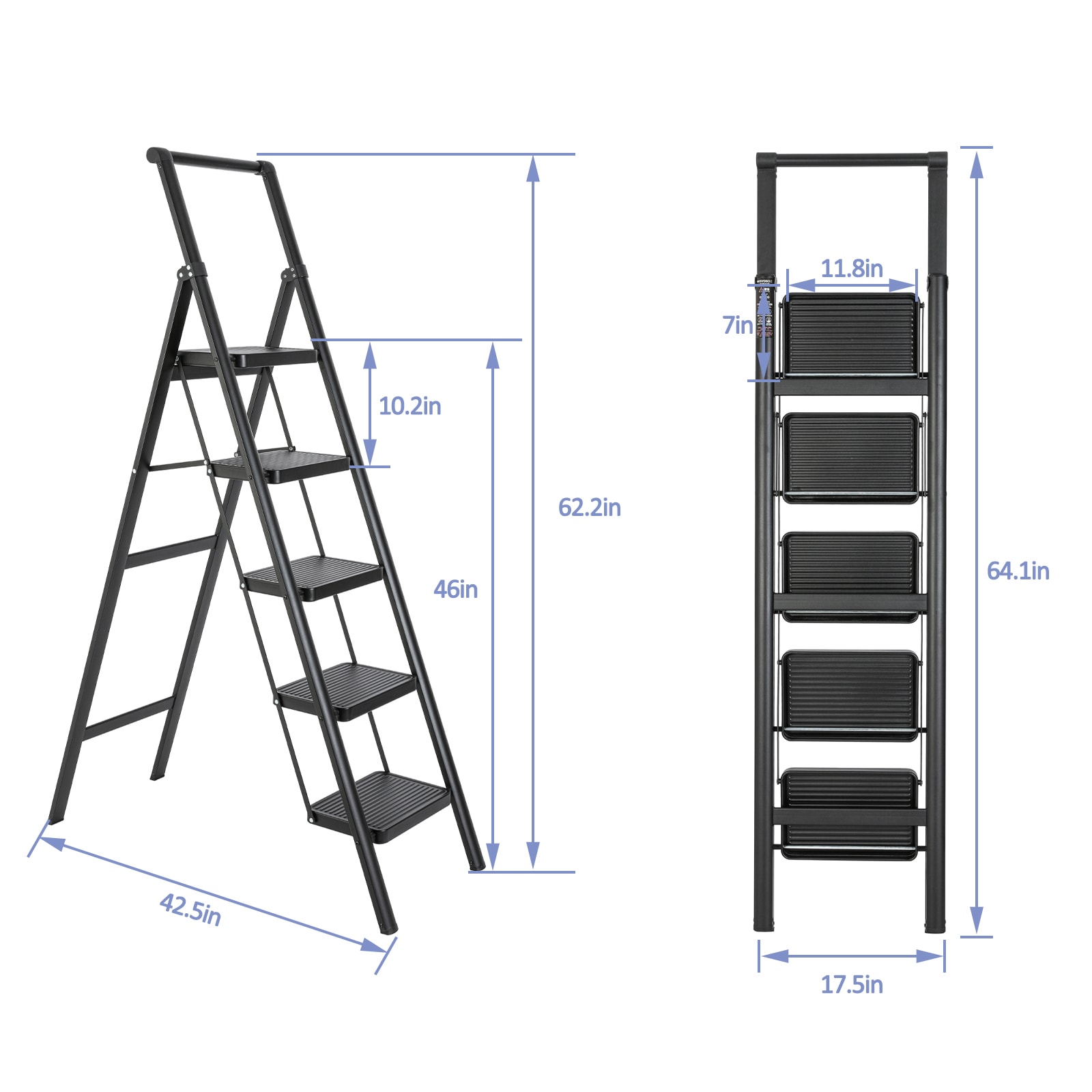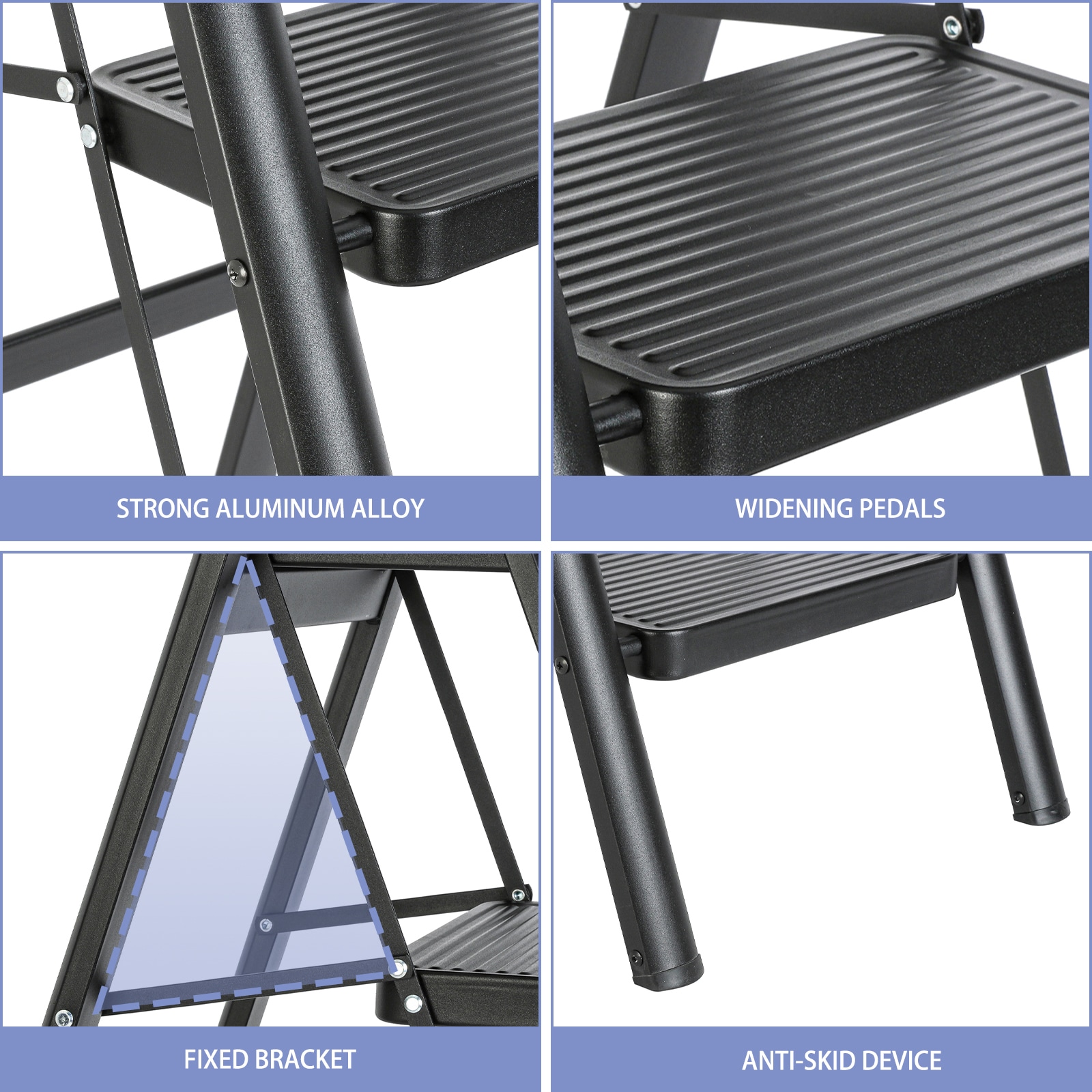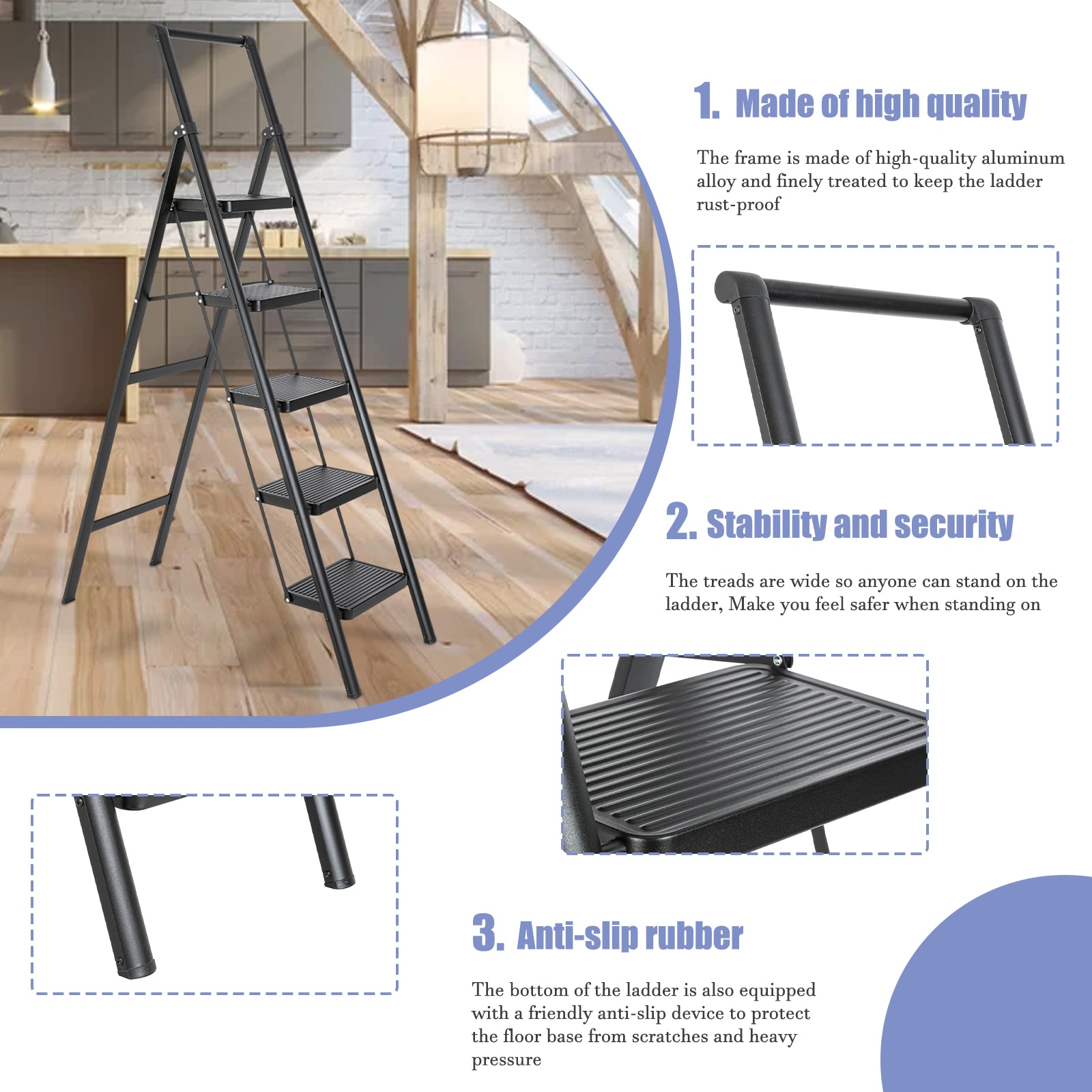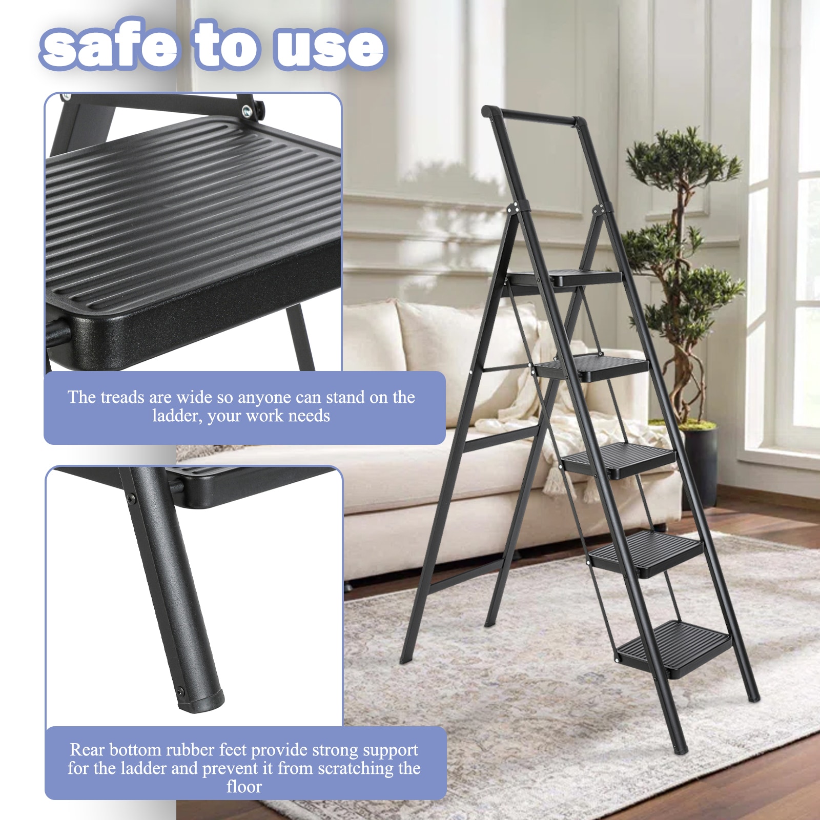 Upgrade your ladder needs with our 5 – step ladder! Made of high – strength aluminum alloy, it can handle loads over 330 pounds, ensuring stability and reliability. The anti – slip design keeps you safe, while the ergonomic features make climbing a breeze. It’s foldable, easy to install, and durable, with a sleek appearance that suits any setting. Whether for home or professional use, this versatile ladder is your reliable partner.