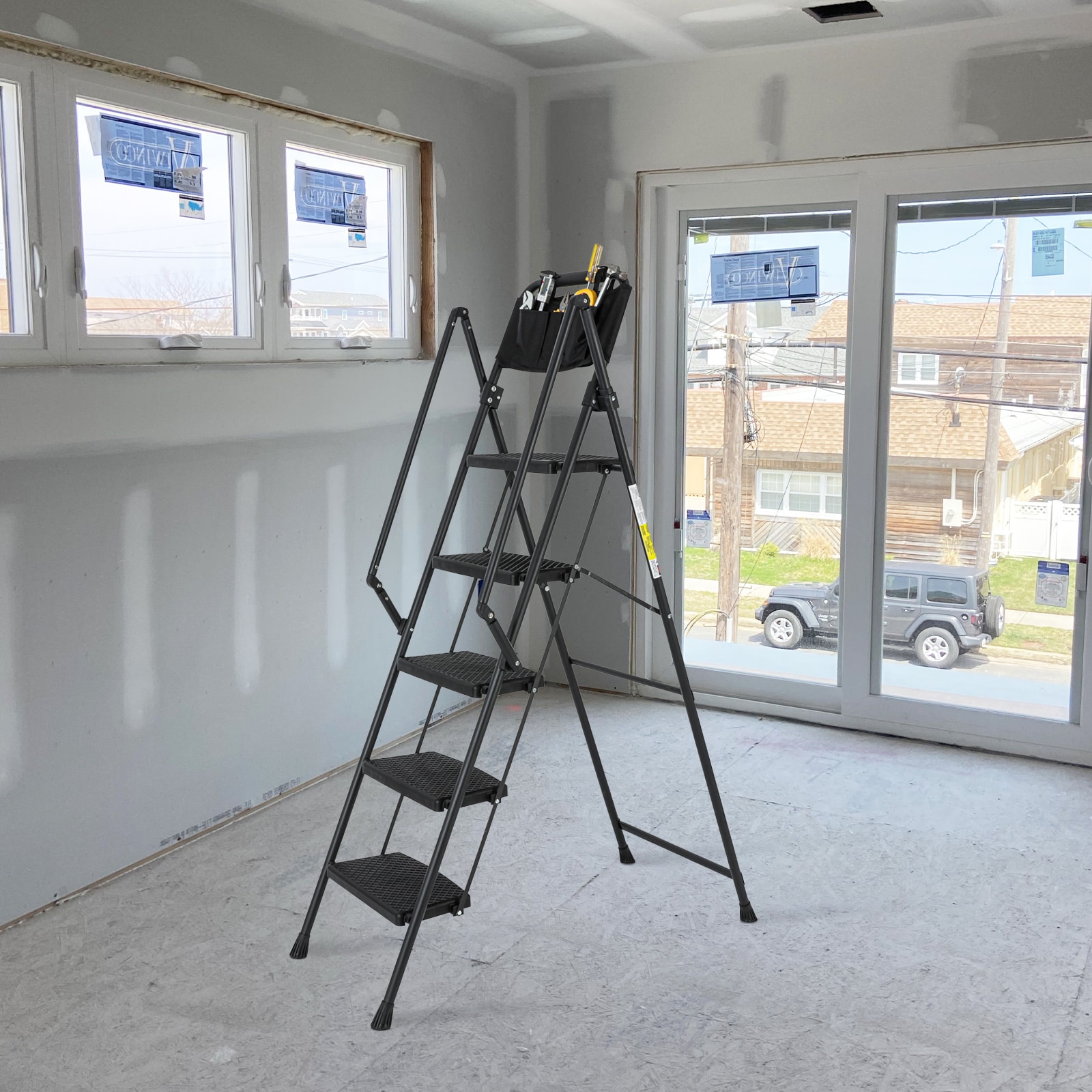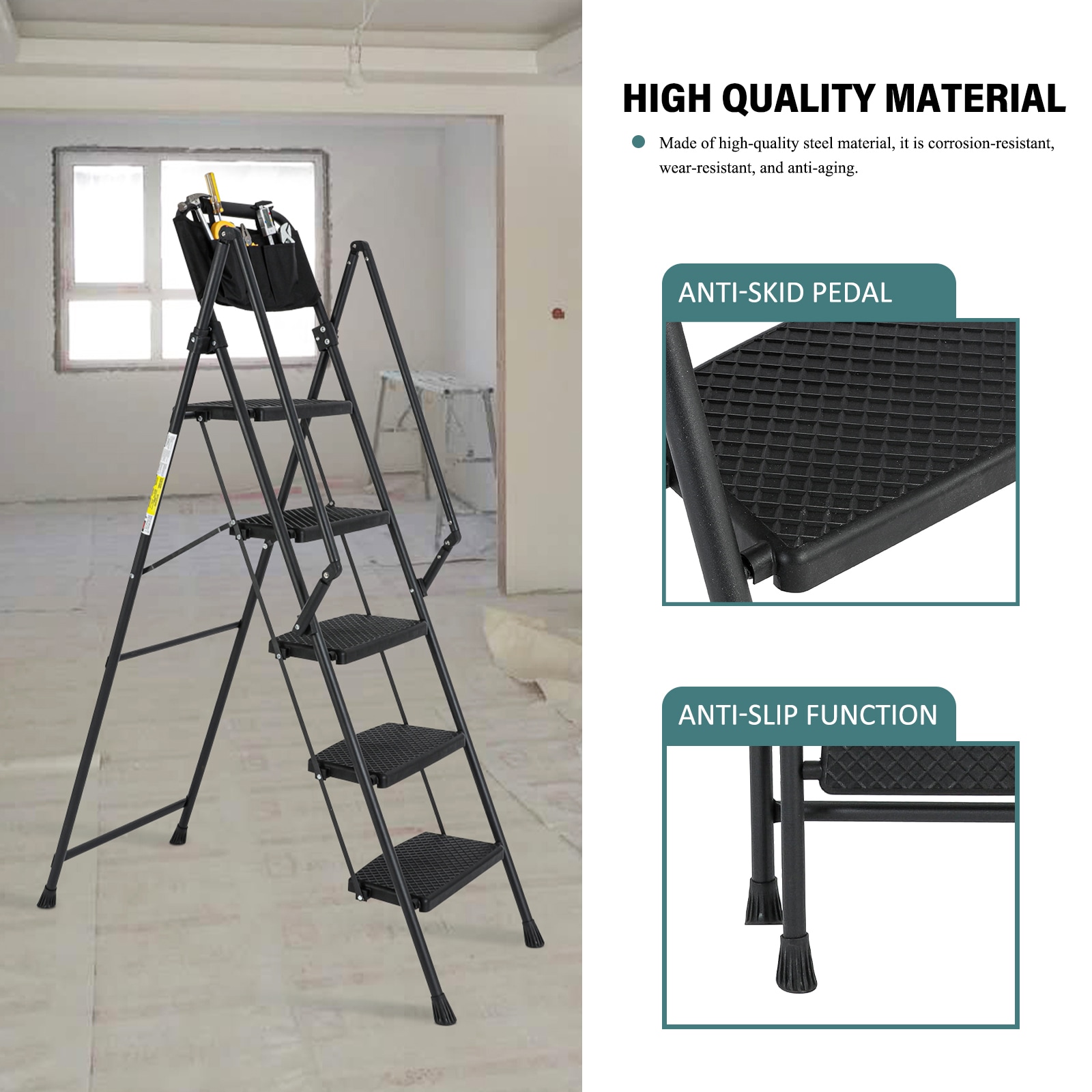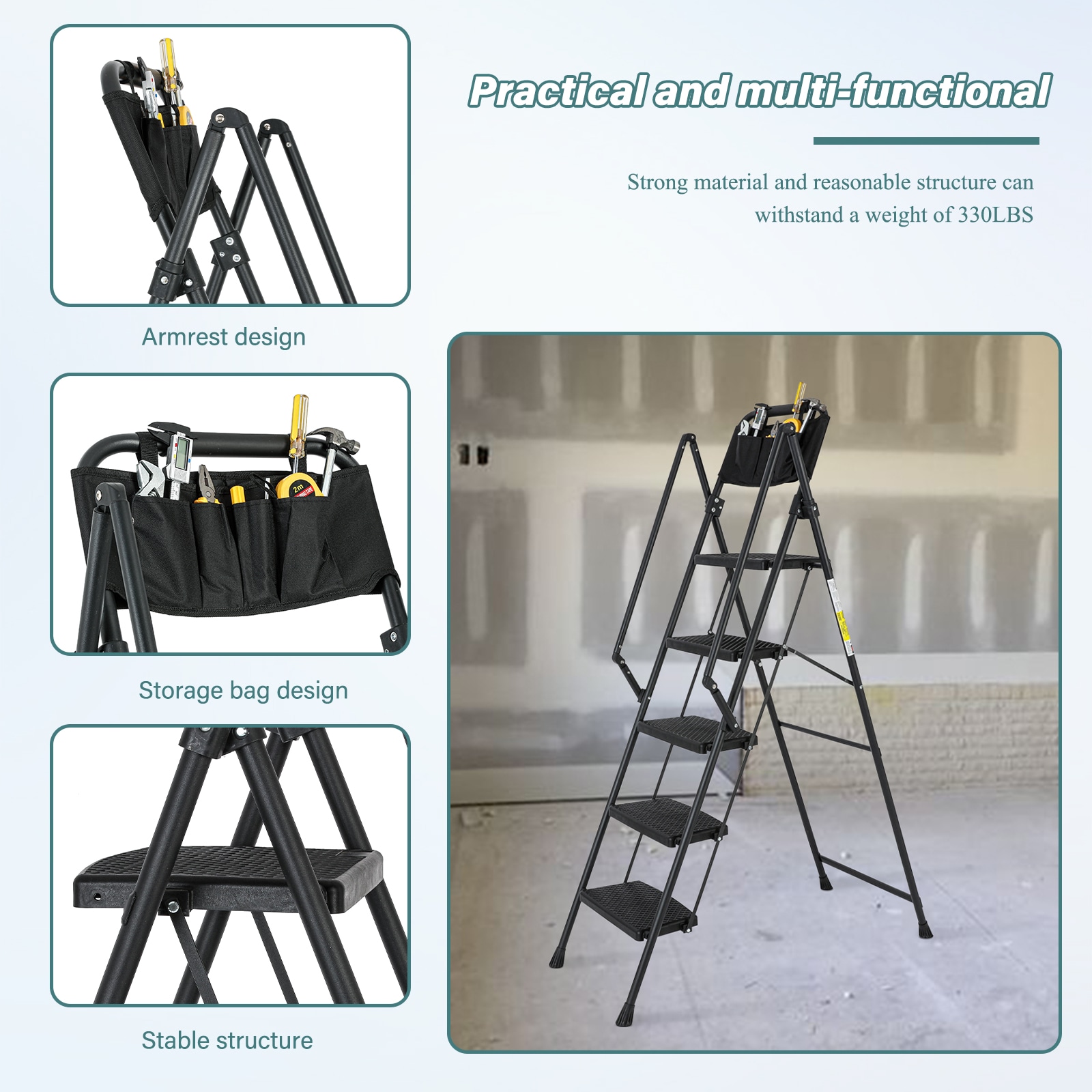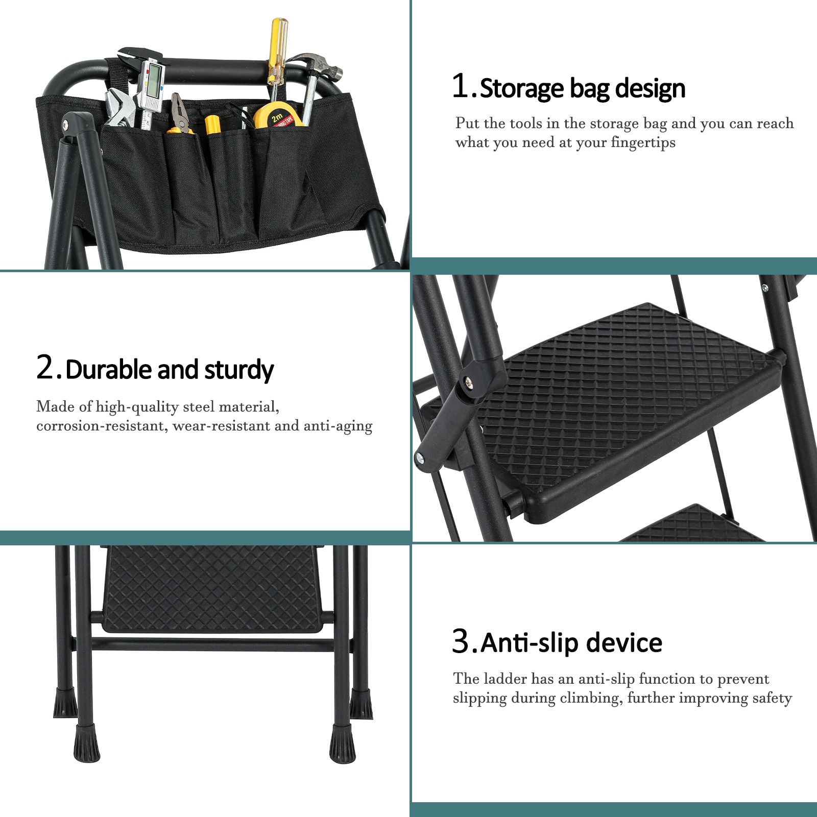 Upgrade your ladder experience with this exceptional foldable step ladder! Crafted from a high-strength steel frame that can support up to 550lb, it offers unmatched durability and stability. The anti-slip pads and pedal ensure your safety, while the sponge handle provides a comfortable grip for easy carrying. Its versatility makes it ideal for various tasks in different rooms, and it can even double as a plant support. The foldable design allows for convenient storage, and the storage bags enhance work efficiency. With a fast locking and opening system, this ladder is the perfect addition to your toolkit. Weighing just 19.8 pounds, it’s easy to handle and transport. Order now and enjoy a safer, more efficient working experience!