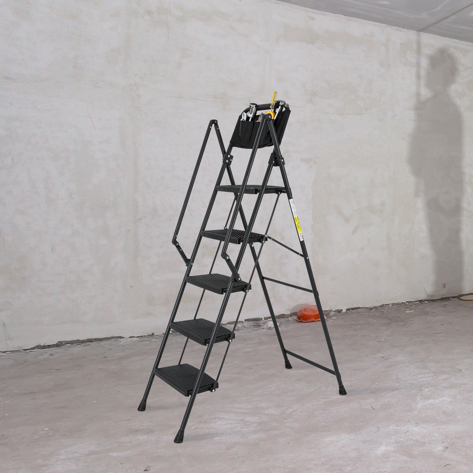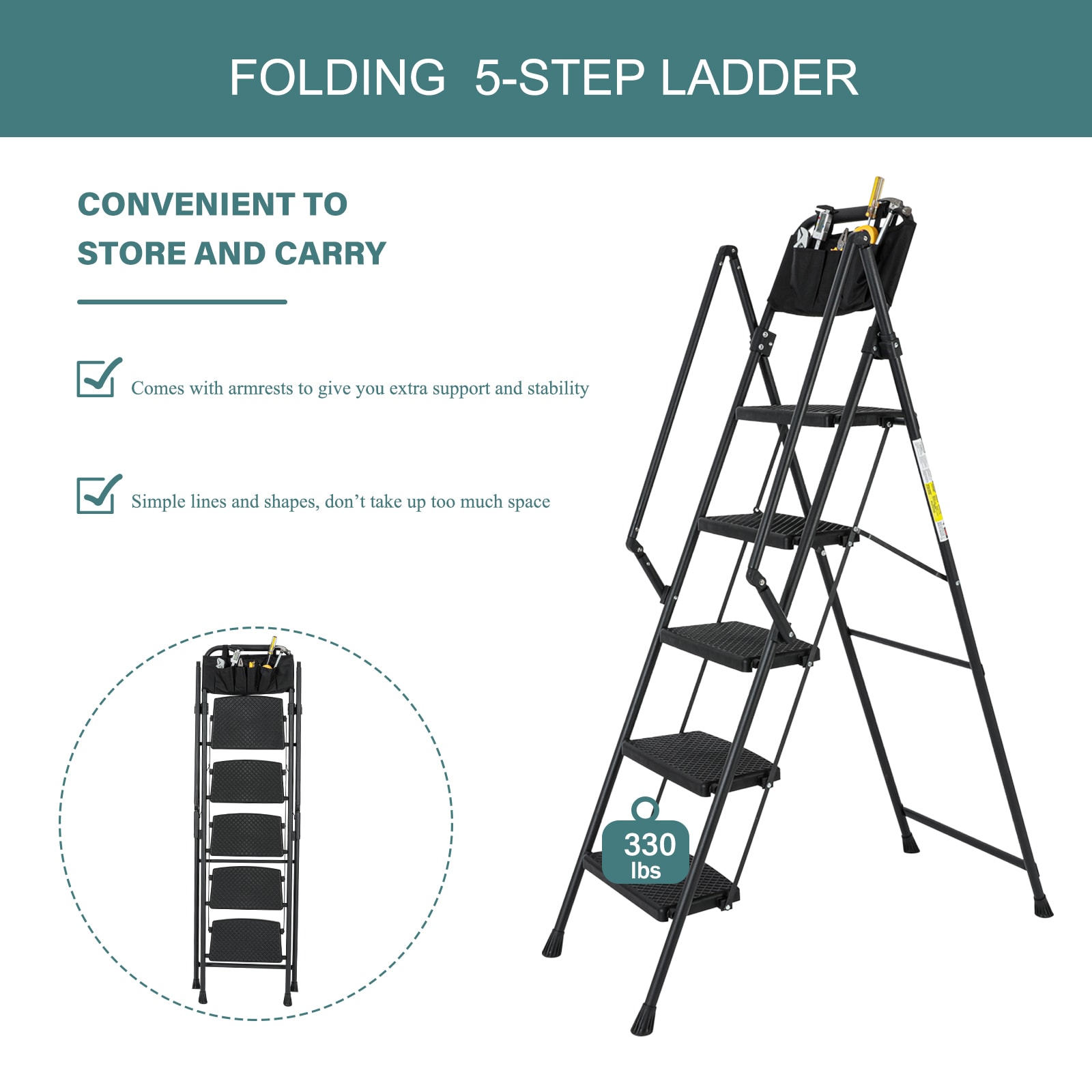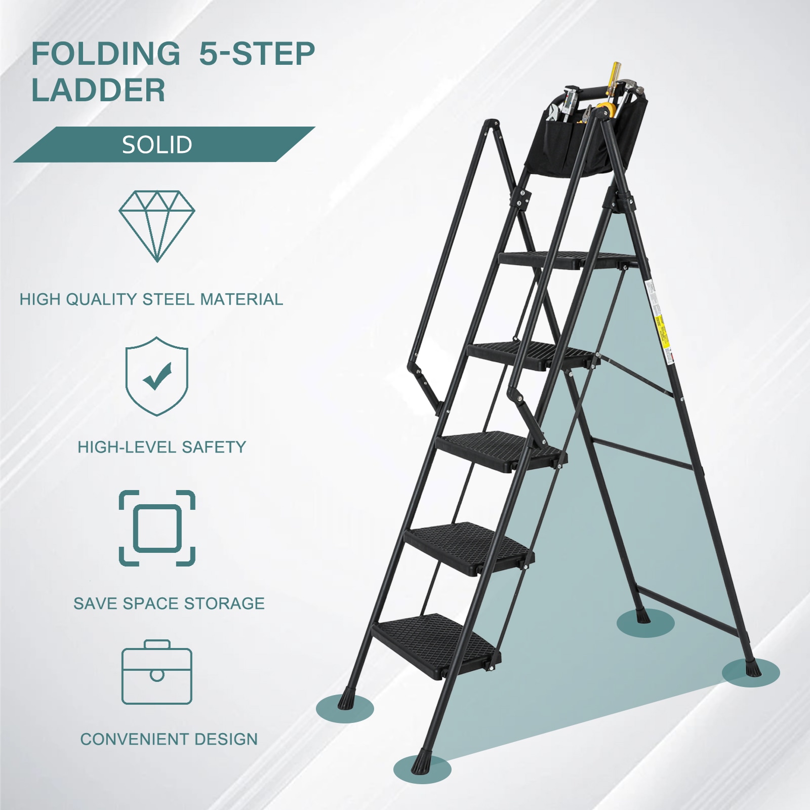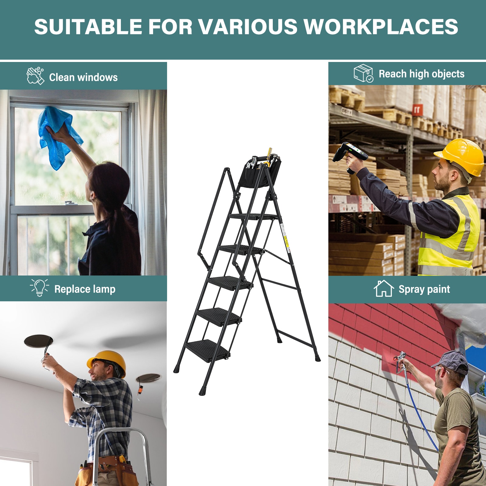 Upgrade your ladder experience with this exceptional foldable step ladder! Crafted from a high-strength steel frame that can support up to 550lb, it offers unmatched durability and stability. The anti-slip pads and pedal ensure your safety, while the sponge handle provides a comfortable grip for easy carrying. Its versatility makes it ideal for various tasks in different rooms, and it can even double as a plant support. The foldable design allows for convenient storage, and the storage bags enhance work efficiency. With a fast locking and opening system, this ladder is the perfect addition to your toolkit. Weighing just 19.8 pounds, it’s easy to handle and transport. Order now and enjoy a safer, more efficient working experience!