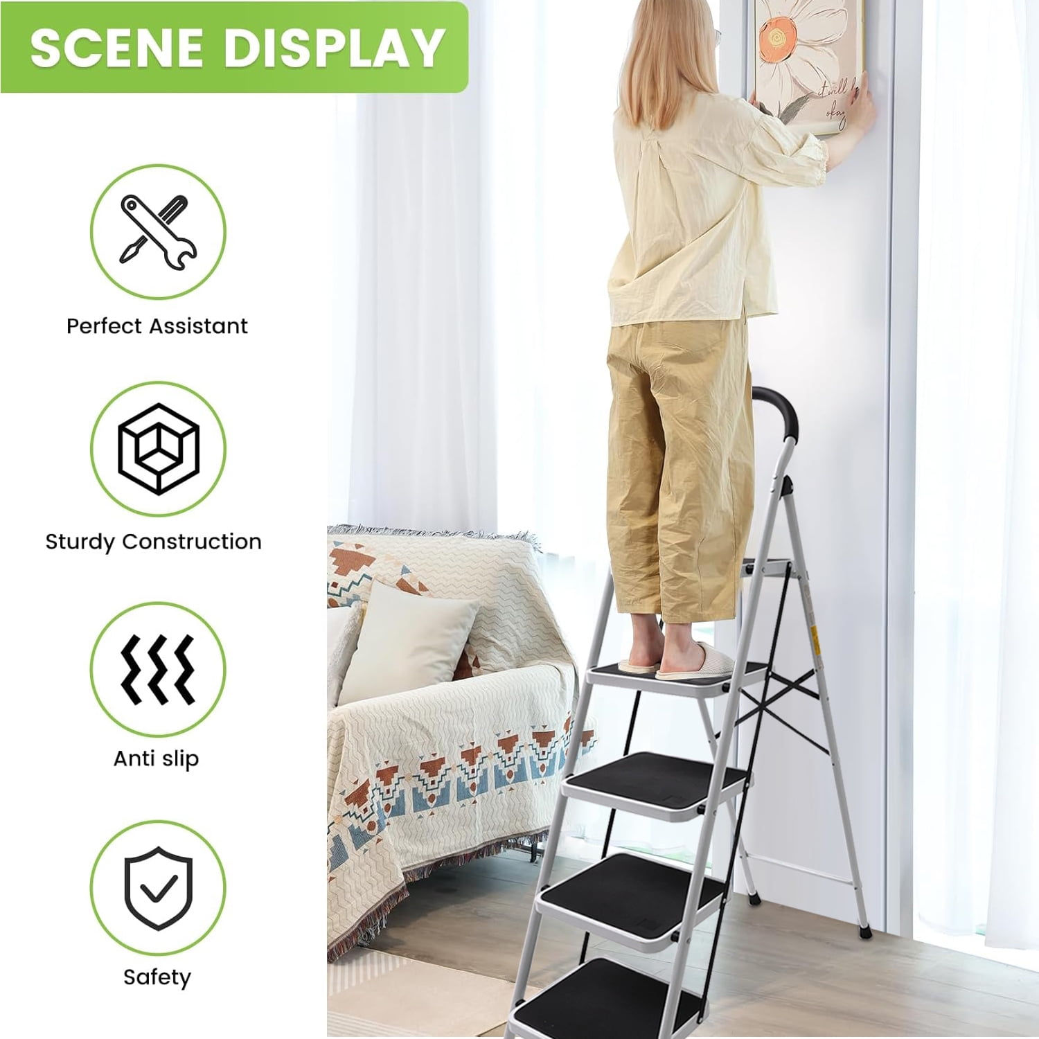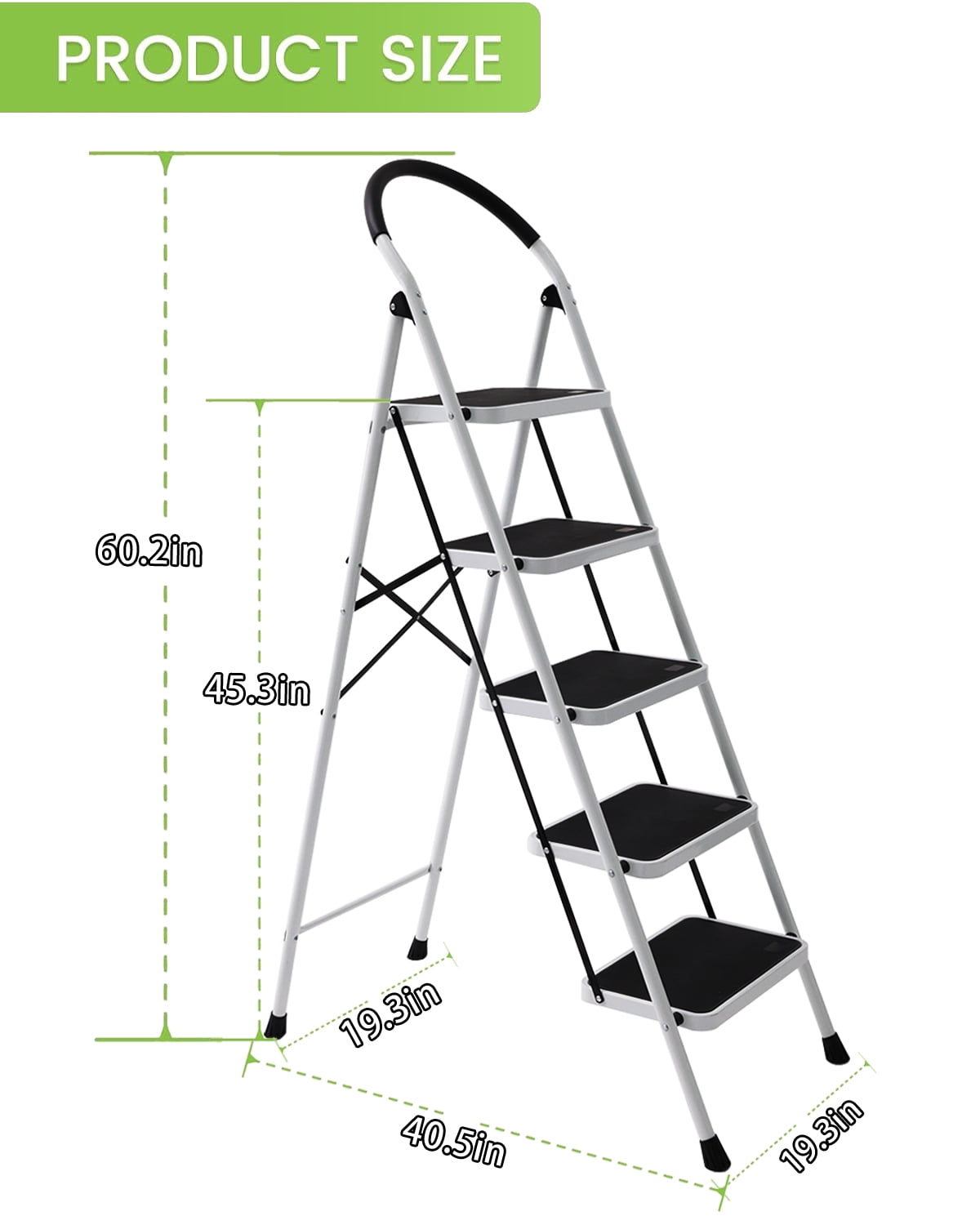 Safety Upgrade: The thickened high-quality steel frame is sturdy and reliable. The safety buckle is automatically locked when in use, and the metal support on the back enhances the support of the ladder. Safety & Stability: 5-step ladder non-slip rubber-wrapped non-slip feet are not only slip-resistant but also protect different floor types, soft sponge covers the handle. Portable & Space-Saving: This folding step stool requires no assembly and can be easily opened and folded for easy storage and transportation, making it portable and suitable for indoor or outdoor use. Large Capacity: This ladder can hold up to 330 lbs of weight, in addition, it only weighs 23.5 lbs, which is very light and easy to carry by a single person, perfect for daily use. Widely Applications: Our 5-step ladder is suitable for reaching high places for cleaning, painting, ideal for use in kitchens, garages, laundry rooms, and can meet most of the daily household chores.
