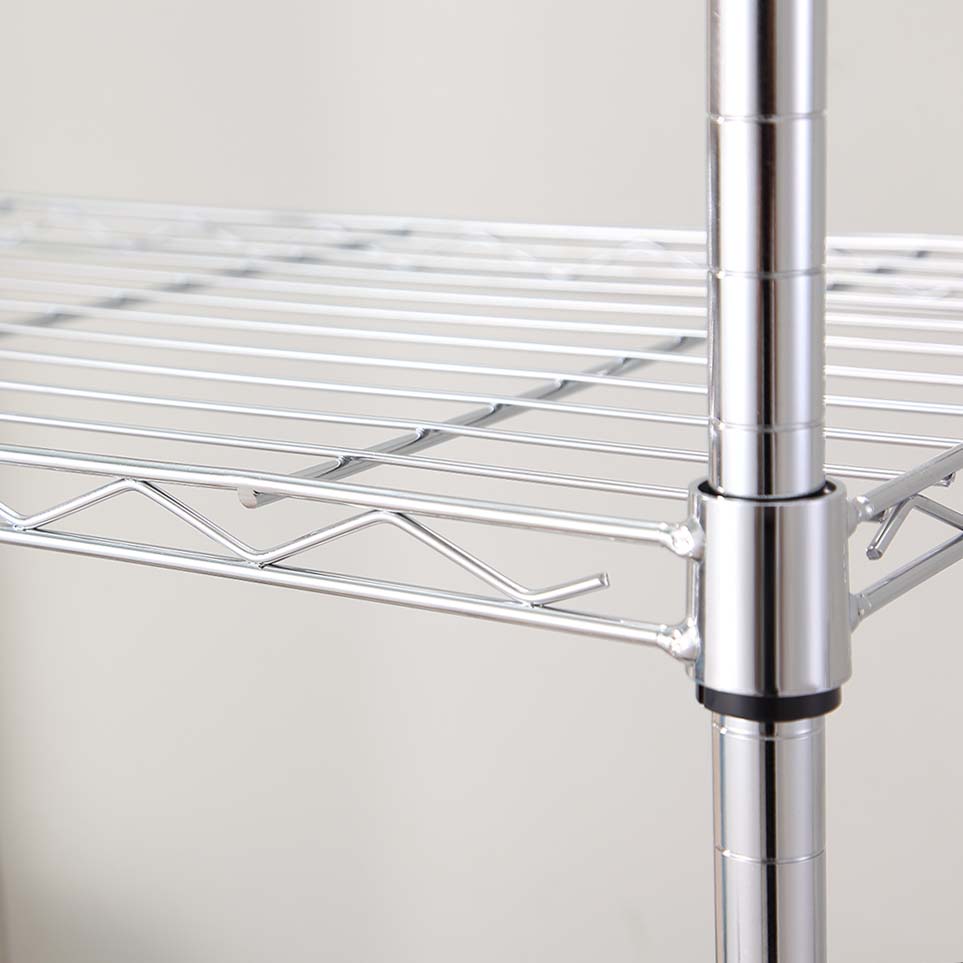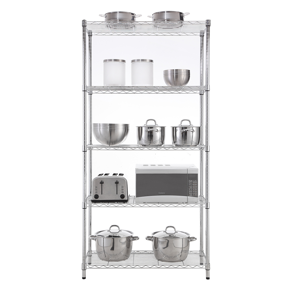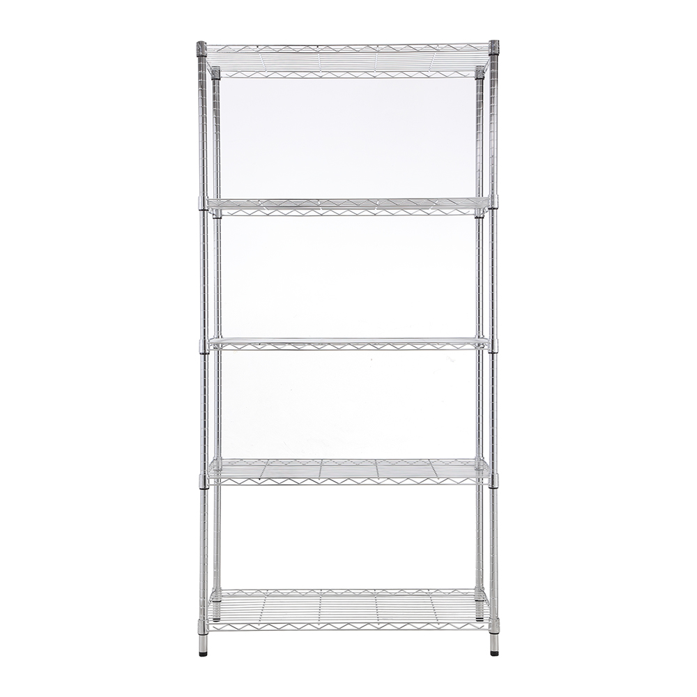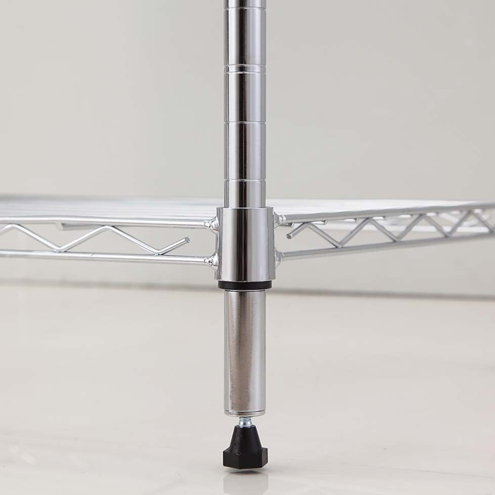 Each shelf can support a weight capacity of up to 350lbs (on leveling feet); Total max load weight on leveling feet is 1750 lbs; Strong steel construction with durable chrome finish Standard 1-inch (25mm) shelf adjustment; Easy to assemble with no tools required