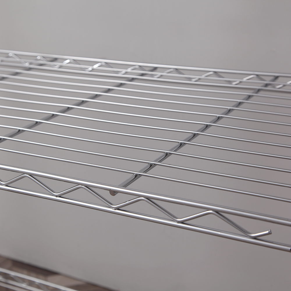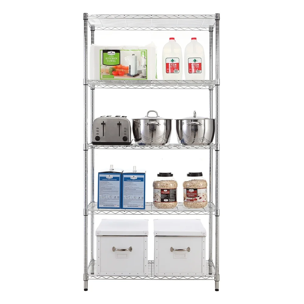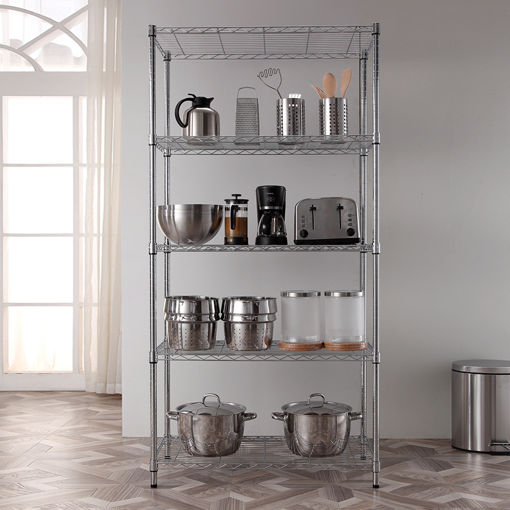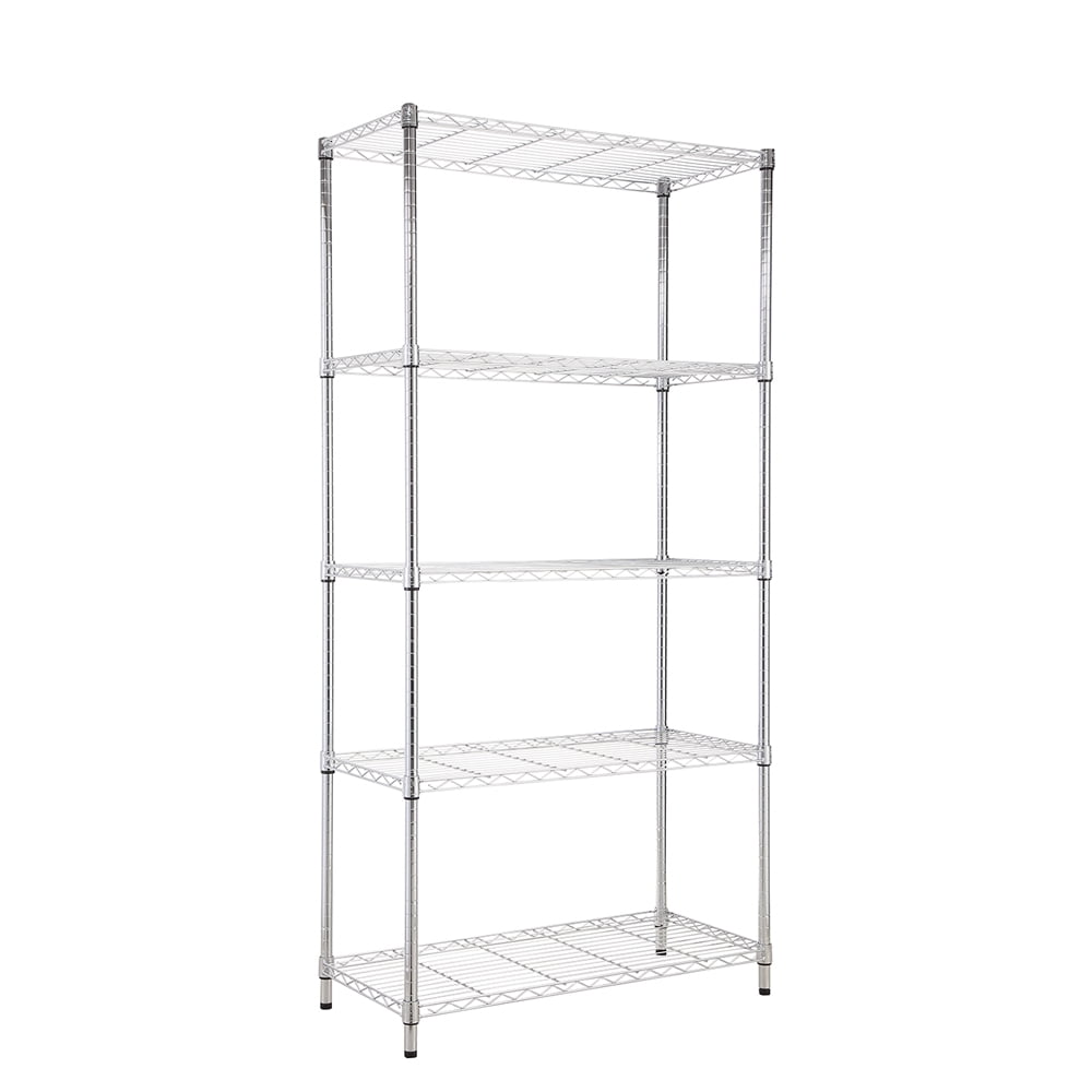 Each shelf can support a weight capacity of up to 350lbs (on leveling feet); Total max load weight on leveling feet is 1750 lbs; Strong steel construction with durable chrome finish Standard 1-inch (25mm) shelf adjustment; Easy to assemble with no tools required