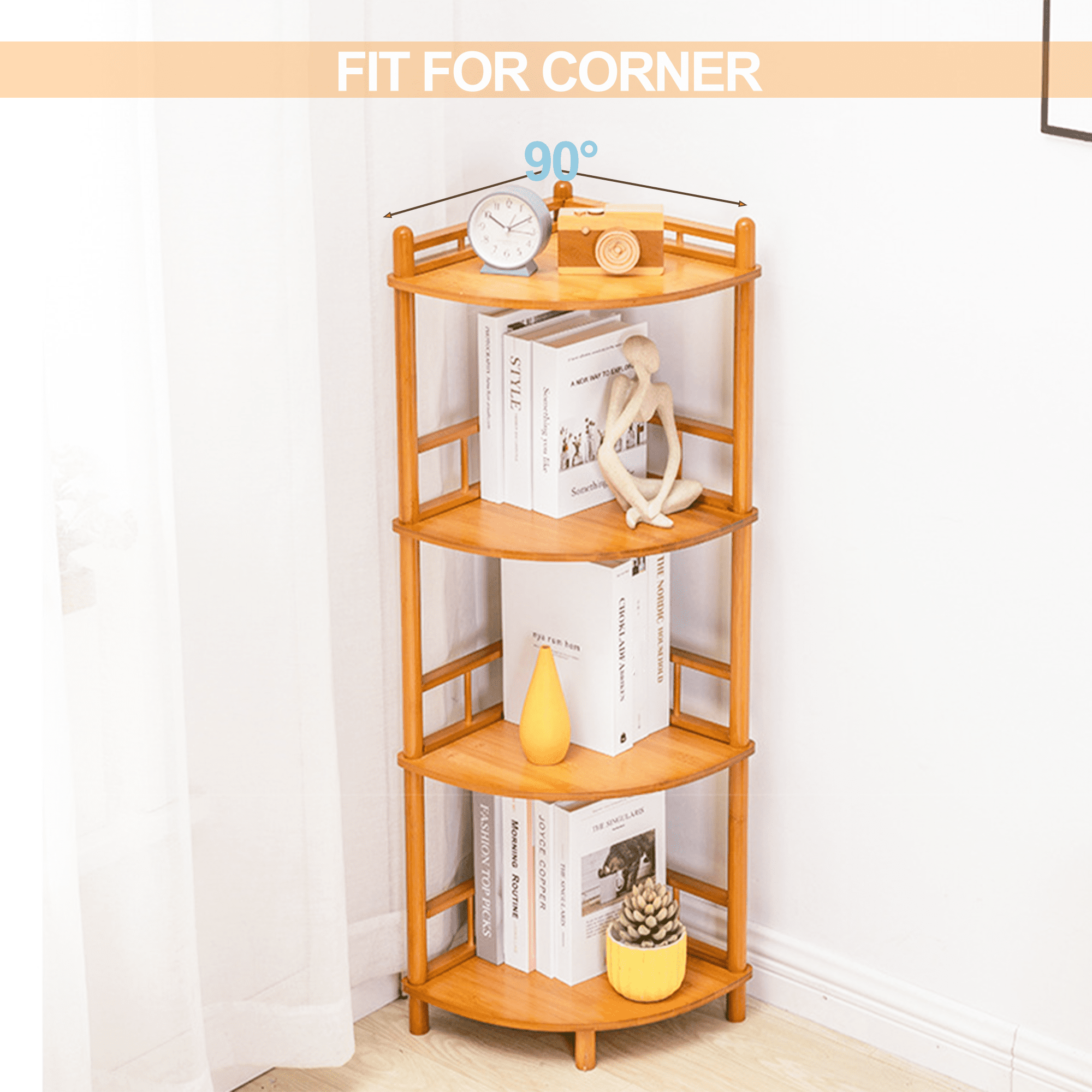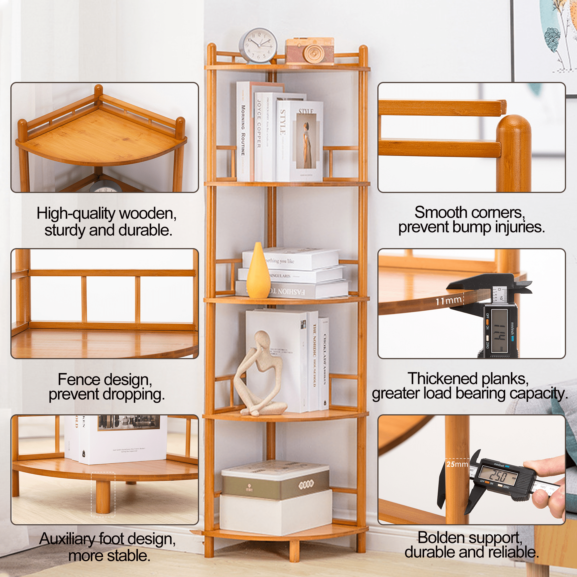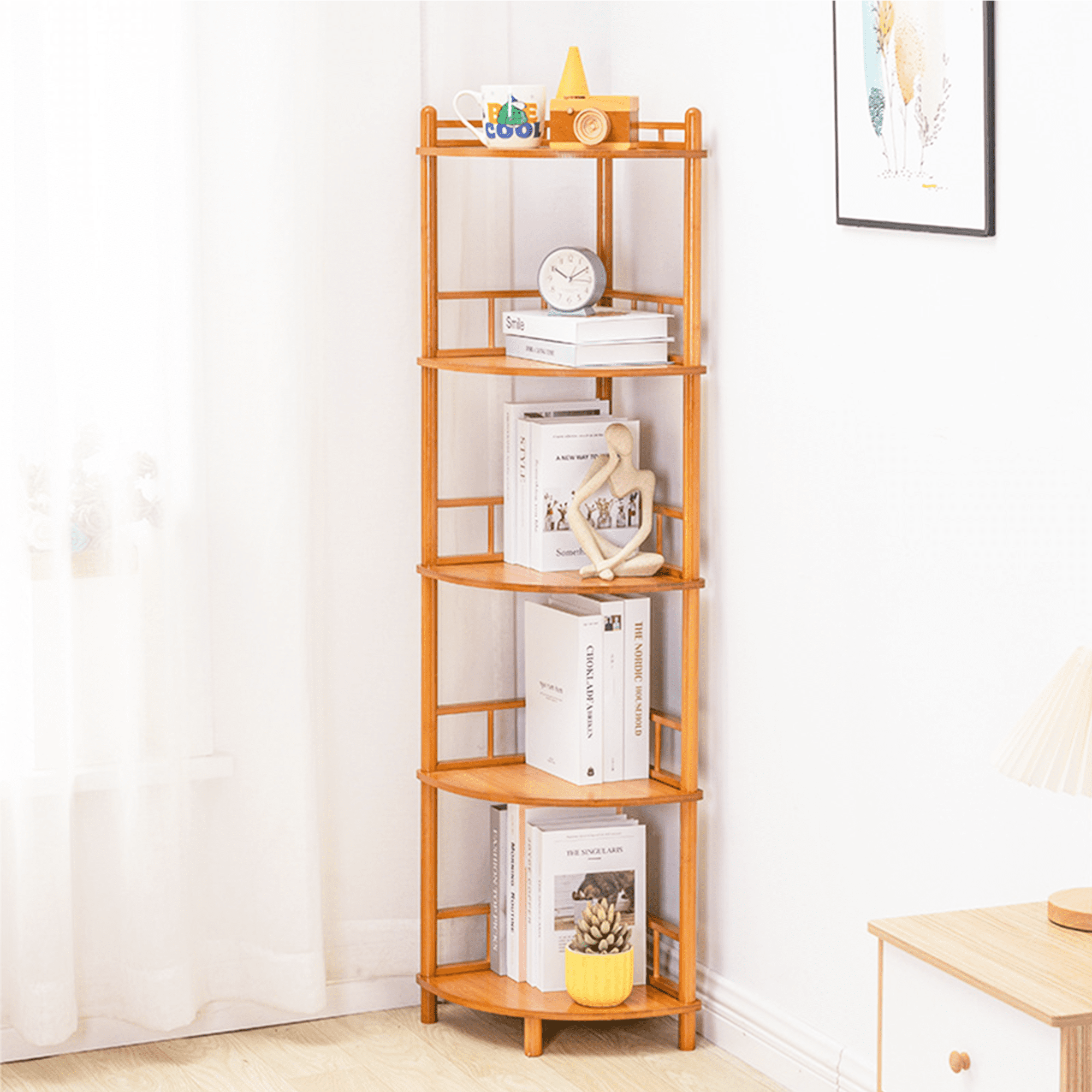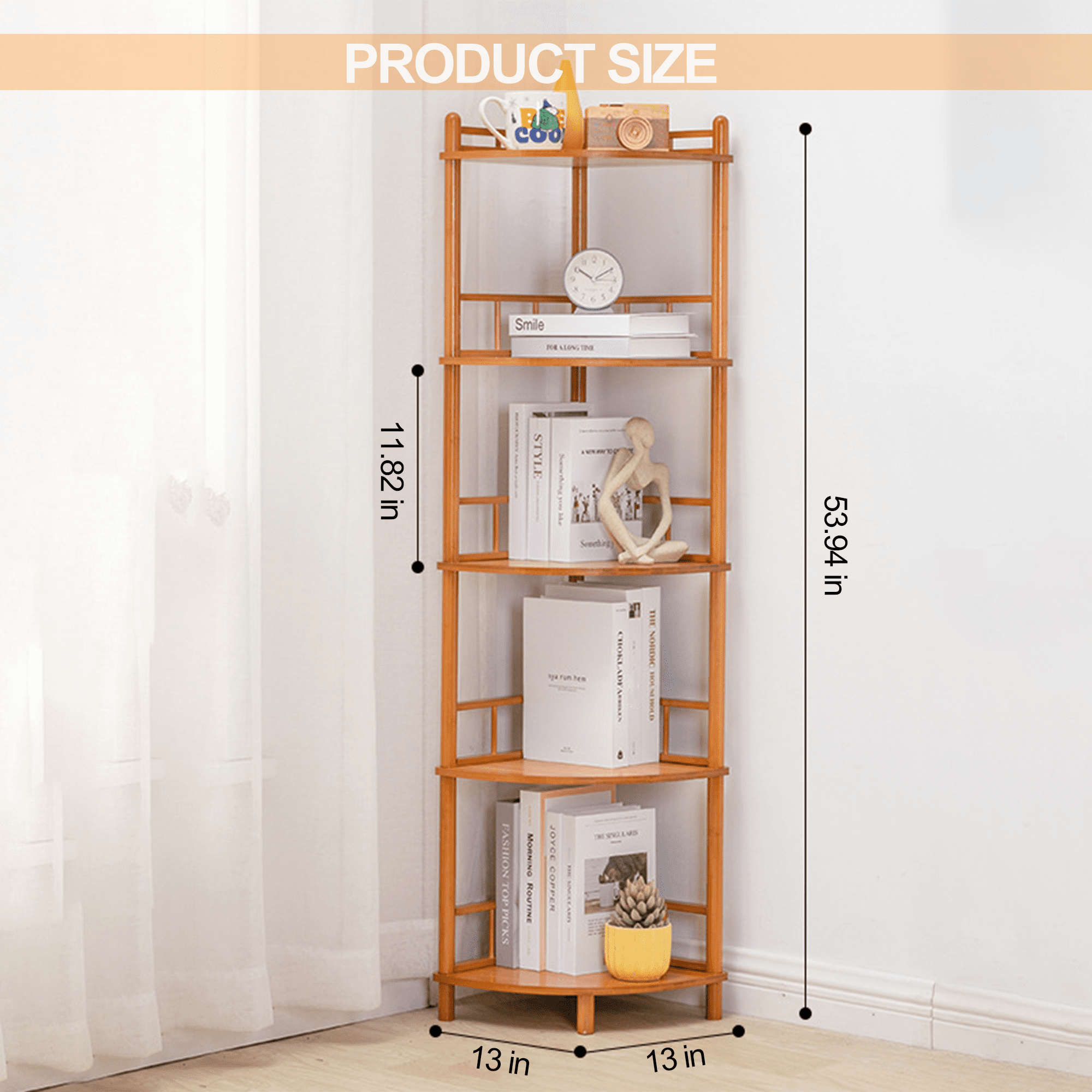 ღ【Multifunctional Corner Bookcase】 This corner shelf is perfect for any corner, such as the living room, bedroom, home office, kitchen, hallway, balcony, bathroom, etc. It can be used as a corner stand, small bookshelf, display stand, plant stand, flower stand, and as daily necessities storage rack, etc. Turn the usable corner of the room into a storage space for function and decoration. ღ【Solid & Durable Construction】 The corner bookshelf is made of medium-density wooden board, sturdy, durable, and anti-scratched. The sturdy three-legged structure with anti-tip accessories helps prevent shaking and tilting from causing a bad experience. ღ【Fence Anti-drop Design】 5-tier display shelf with full utilization of any limited space, providing additional storage space. Each corner shelf has two sides of the fence to prevent items from slipping off. ღ【90° Right Angle Design】The 90° right angle on the rear makes it Perfectly Flush with the Wall, and the Smooth Rounded Edges Protect Your Family from Harm. It is an Ideal Choice for Children Around You. Dimensions: 19.7″W x 13″D x 66.9″H. ღ【No Tool & Easy Assembly】 This display stand doesn’t require any tools and can be assembled in just 8 minutes. It is also a possibility to restore a tidy home. Storage cabinets can be suitable for a variety of home decor styles, adding a touch of elegance to your space.