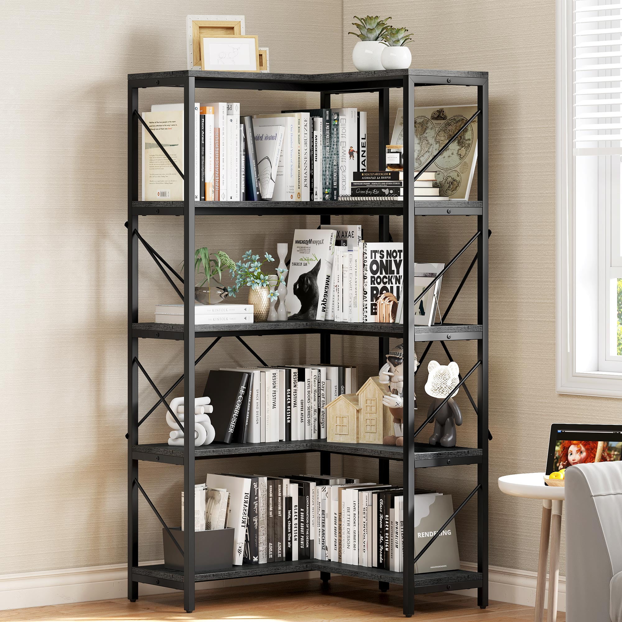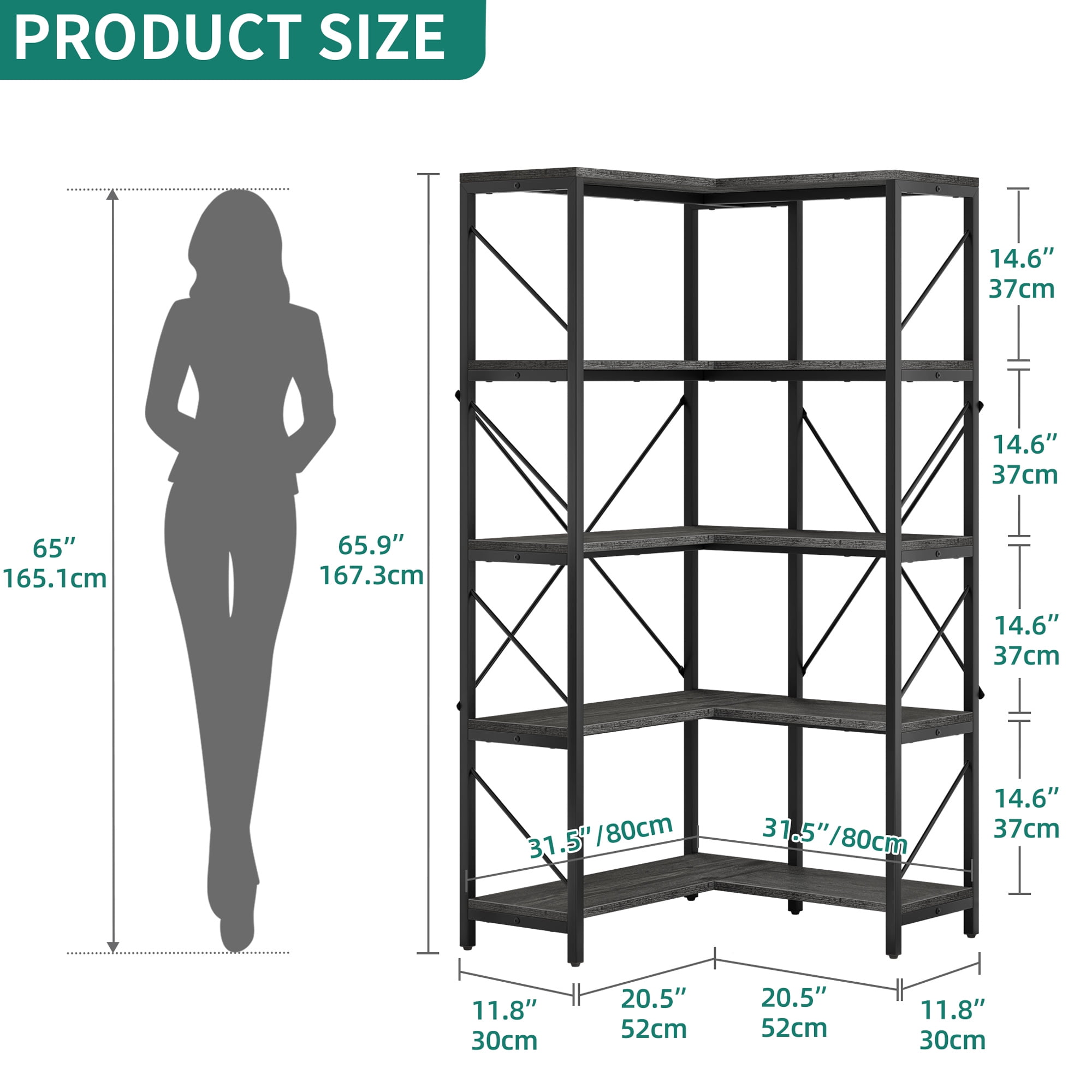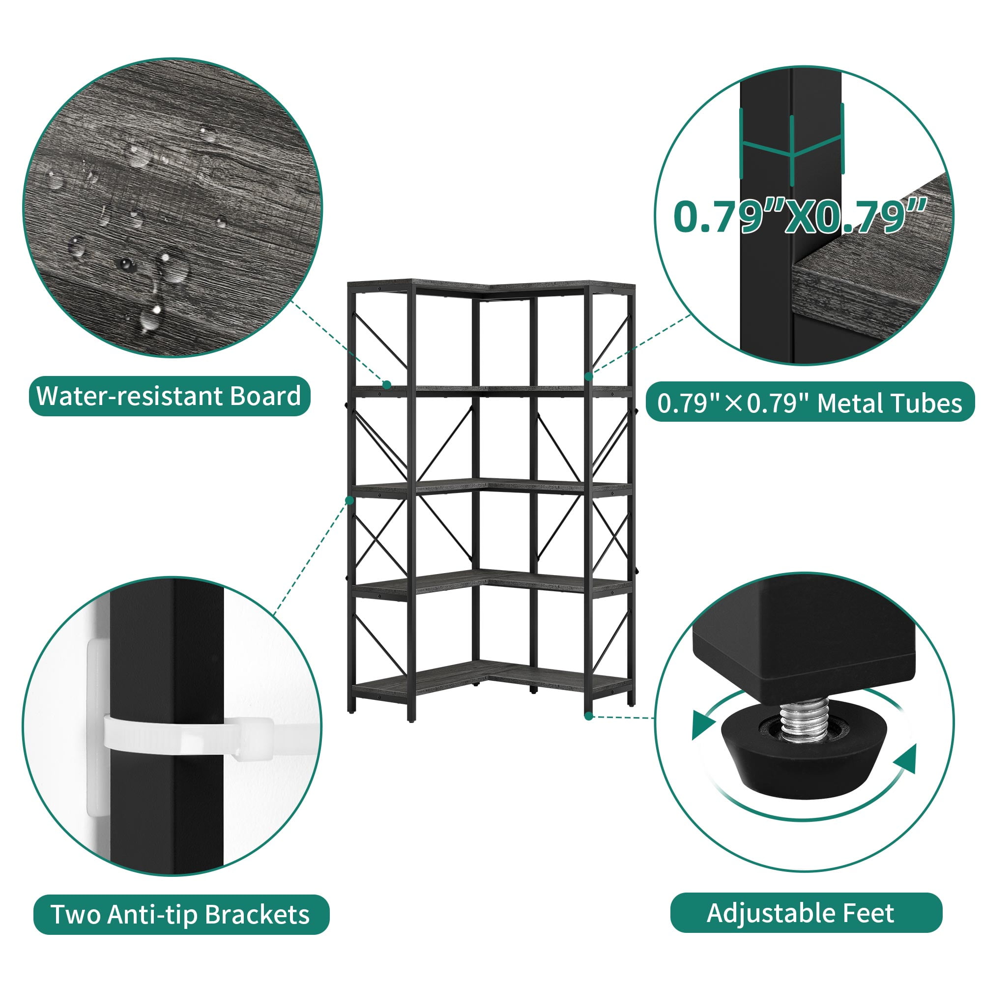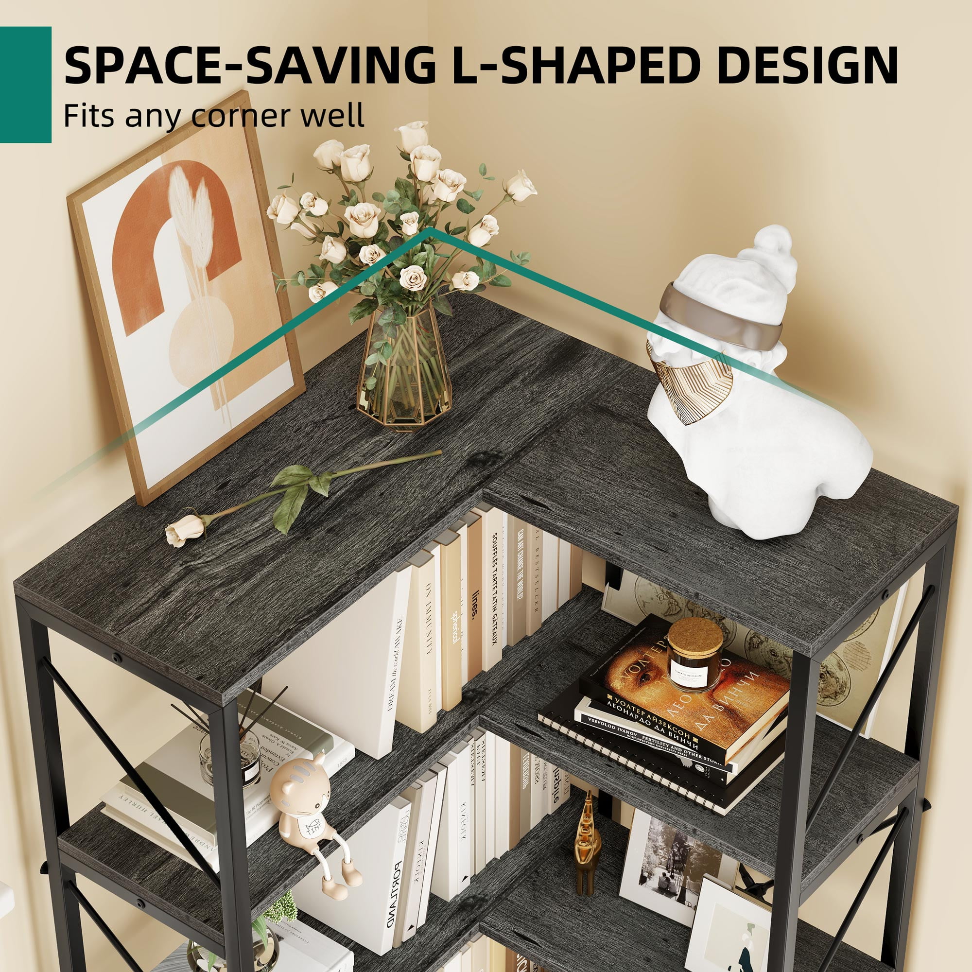 5-Tier L-Shaped Bookcase Storage Organizer, Tall Corner Bookshelf Open Display Freestanding Storage,Dark Gray