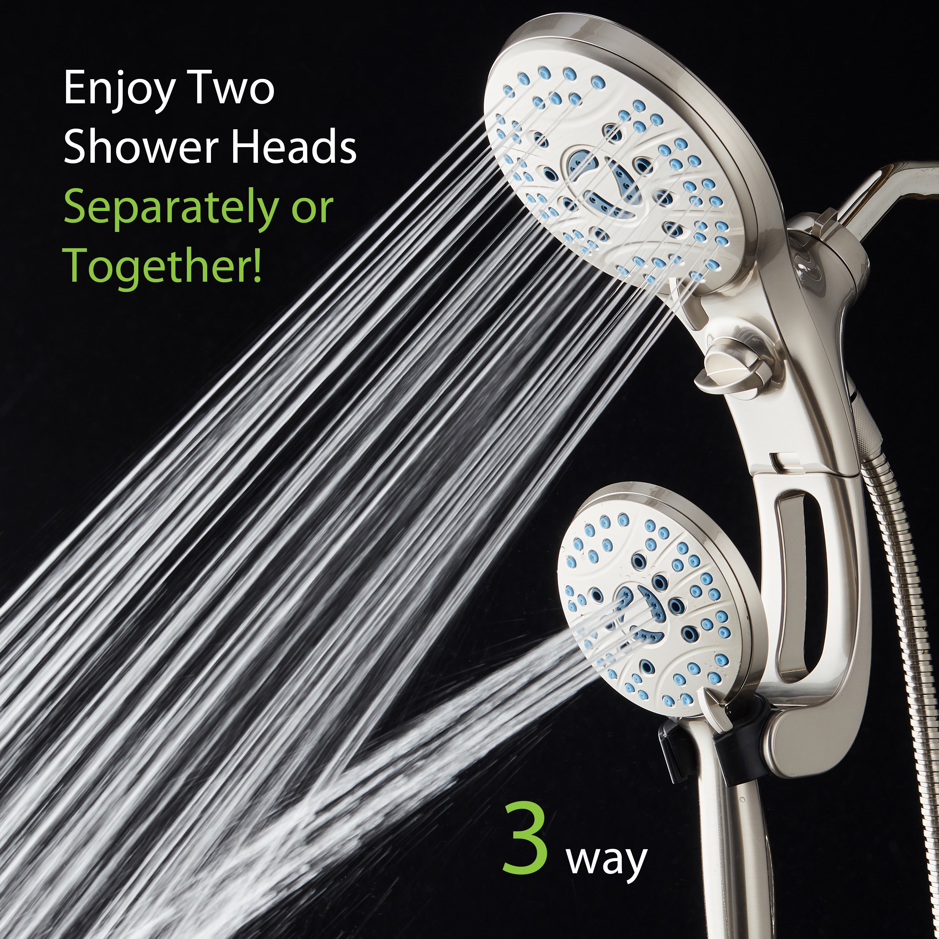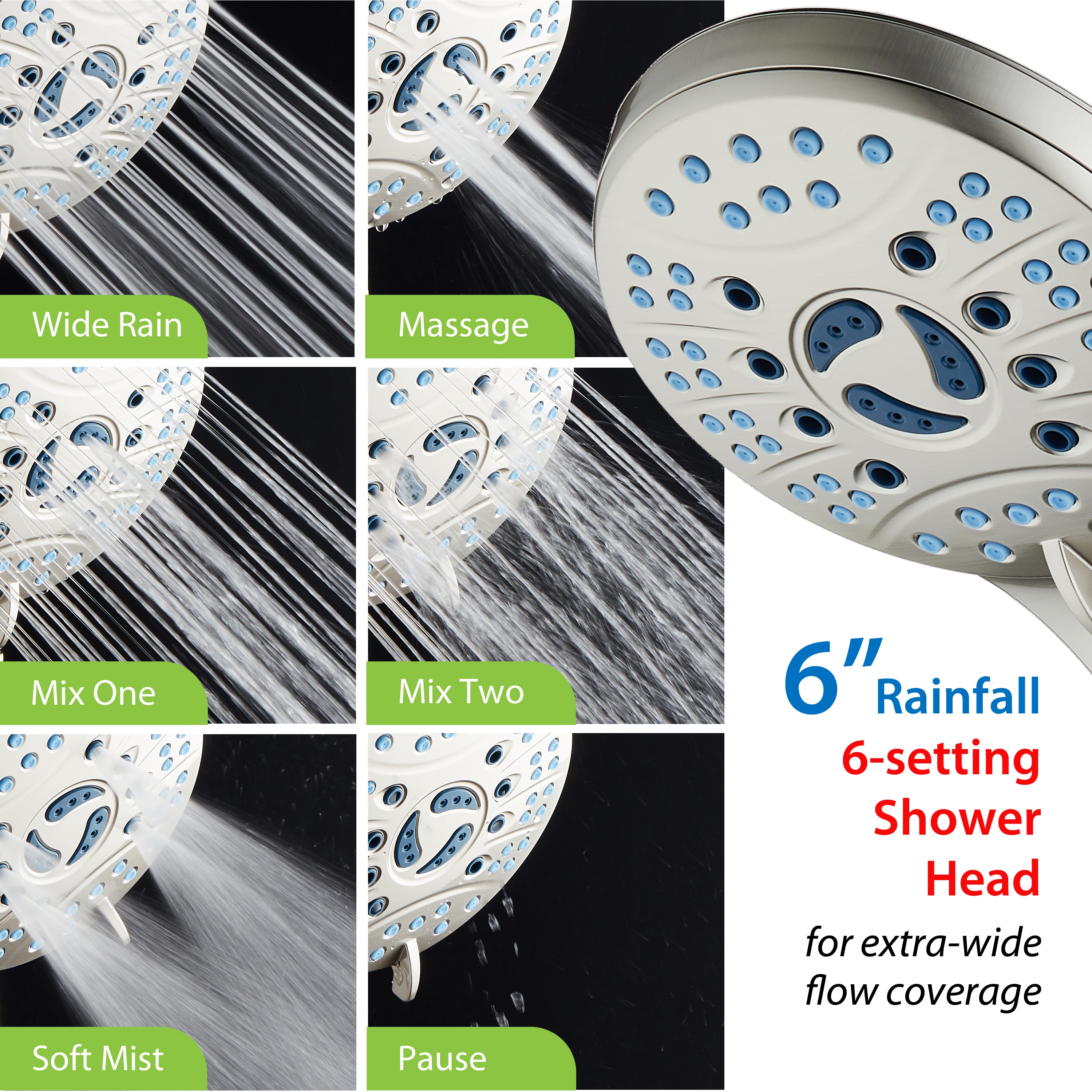 More water pressure, better shower hygiene. Pamper yourself in spa luxury with advanced 8-setting 5-zone hand shower and giant 6-setting 6 in. rainfall shower head that can be used separately or together. Made in a High Quality Brushed Nickel finish. Both heads feature antimicrobial anti-clog nozzles that inhibit the growth of mold, mildew and bacteria inside. Studies show that ordinary shower heads are often infested with dangerous germs and bacteria that rapidly multiply overnight, then get flashed out at you with your morning shower. AquaCare nozzles are made with revolutionary germ shield antimicrobial material that works 24/7. Innovative adjustable extension arm with built-in 3-way Diverter. Lower your hand shower 2 feet for instant reach. It moves forward or back to position it at the perfect height. Built-In 2-mode tub, tile and pet power wash. Clean that disgusting soap scum and dried hair left behind from up to 6 feet away without setting a foot in your shower. Simply flip the AquaCare handle and turn it into a high-pressure power wash! Use point jet to instantly target and blast away stubborn grime or use wide fan to quickly rinse-clean large areas. Lower the water pressure and AquaCare turns into a professional pet shower that gently and thoroughly deep-cleans the coat and rinses out the soap in minutes. Extra-long 72-inch heavy-duty stainless-steel hose and low-reach bracket for easy reach and mobility. Ideal for Seniors and children.