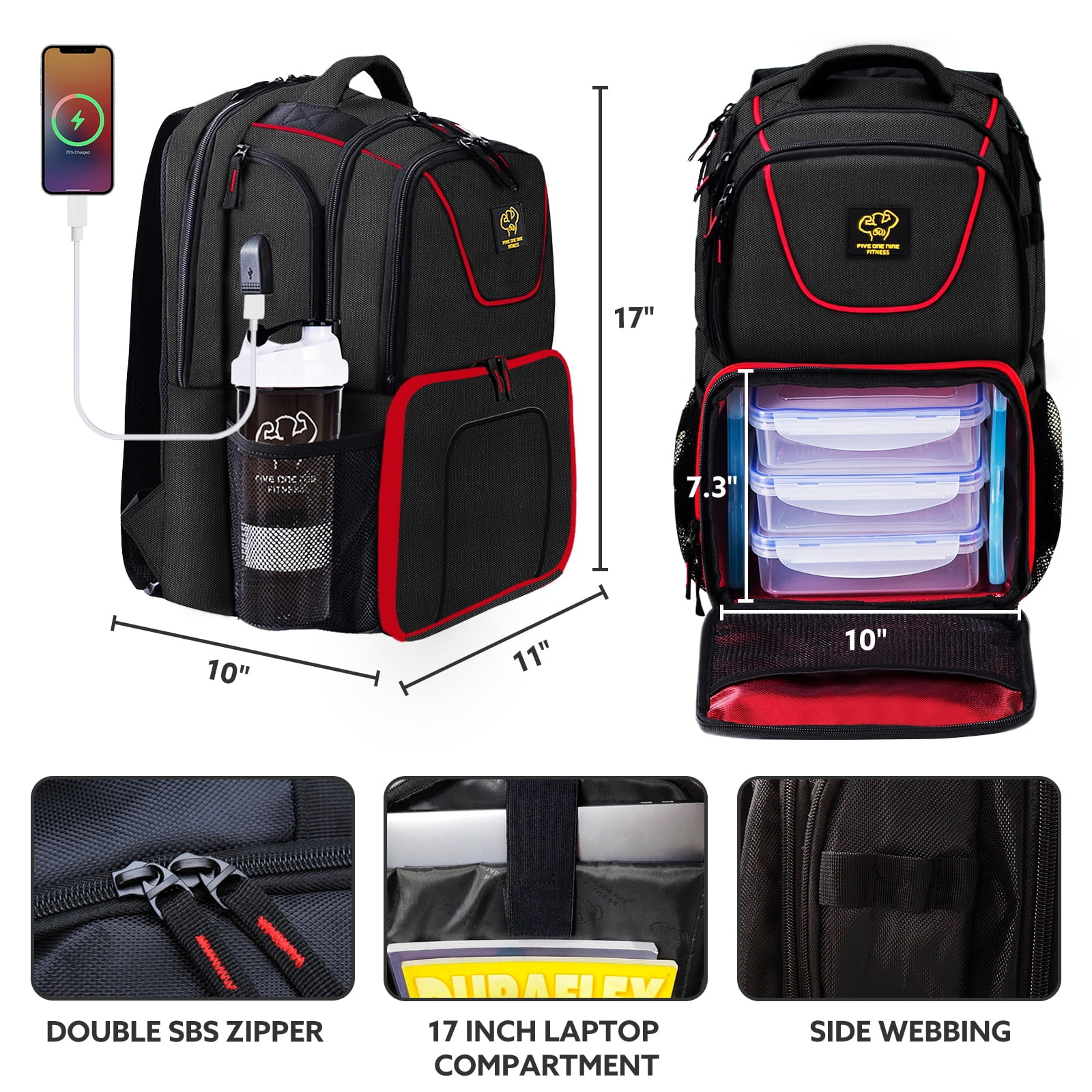 The FIVE ONE NINE Meal prep backpack is the perfect gift for those who are just getting into the meal prep game or are on a budget and still want a best quality bag. It is additionally a 17 Laptop Backpack fits UNDER 17.3 Inch Laptops and Macbook(Maximum notebook size: 16.5″ x 11.4″ x 1.3″ (42 x 29 x 3.5cm ) FEATURES: Main Compartment: 3 Meal Containers and 2 Ice Packs Top Compartment: Fitness Cloth and Accessories Front Compartment: For Phones, pen, keys, wallet, purse, glasses and other small gears Side Pockets: Durable Elasticized Mesh Pockets on both sides, fit water bottles, small compact umbrella and other items PVC inside is protecting aluminum foil High density 1680 danier waterproof polyester Top of the line YKK Zippers – Easy to open and close with one hand Keep food and drinks cold for 12-16 hours USB External Charging