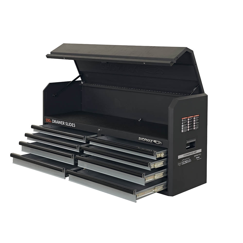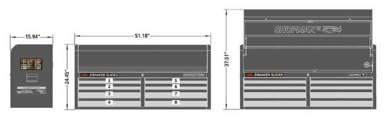 Everything you may need for tool storage – and powering your devices – is available in the SHOPMAX® 52-in. 8-Drawer Top Tool Chest. With a total holding space of 13,350 cu. in., you can organize everything you need for any-sized project. Two recessed aluminum handles are strong enough to lift the chest capacity of 800 lbs. Get extra-heavy usage with an all-welded, 20 ga. steel construction. Has an internal, four-outlet power strip with two USB charging ports – perfect for charging your phone and keeping your laptop or hand tools charged and ready. Soft-close, ball-bearing drawer slides handle up to 100 lb each, keeping your tools in place when opening/closing. The built-in secure latch mechanism keeps the doors closed when moving the chest. The lid is reinforced with a sturdy, stamped Shopmax logo. Paint is a rust-resistant composition with a rugged, non-scratching rough finish.