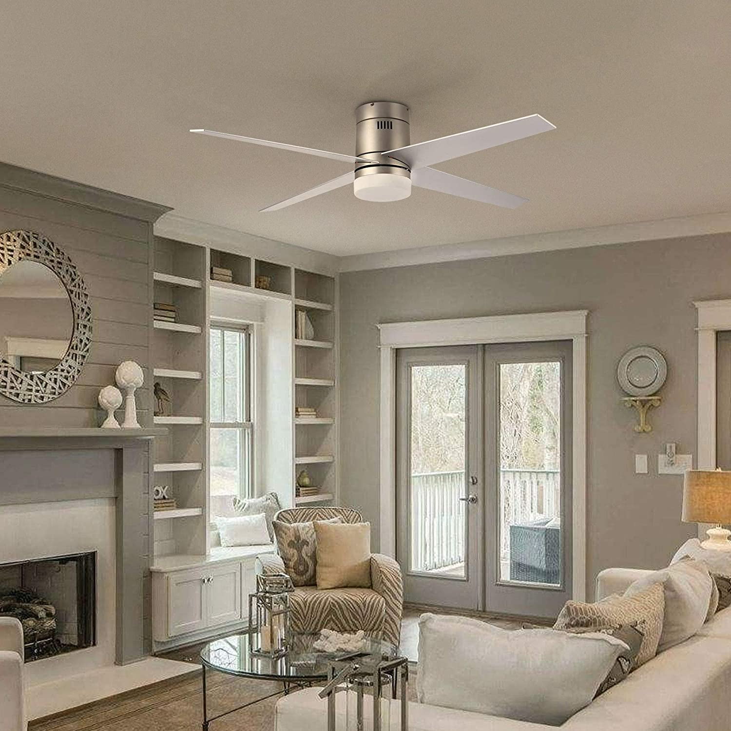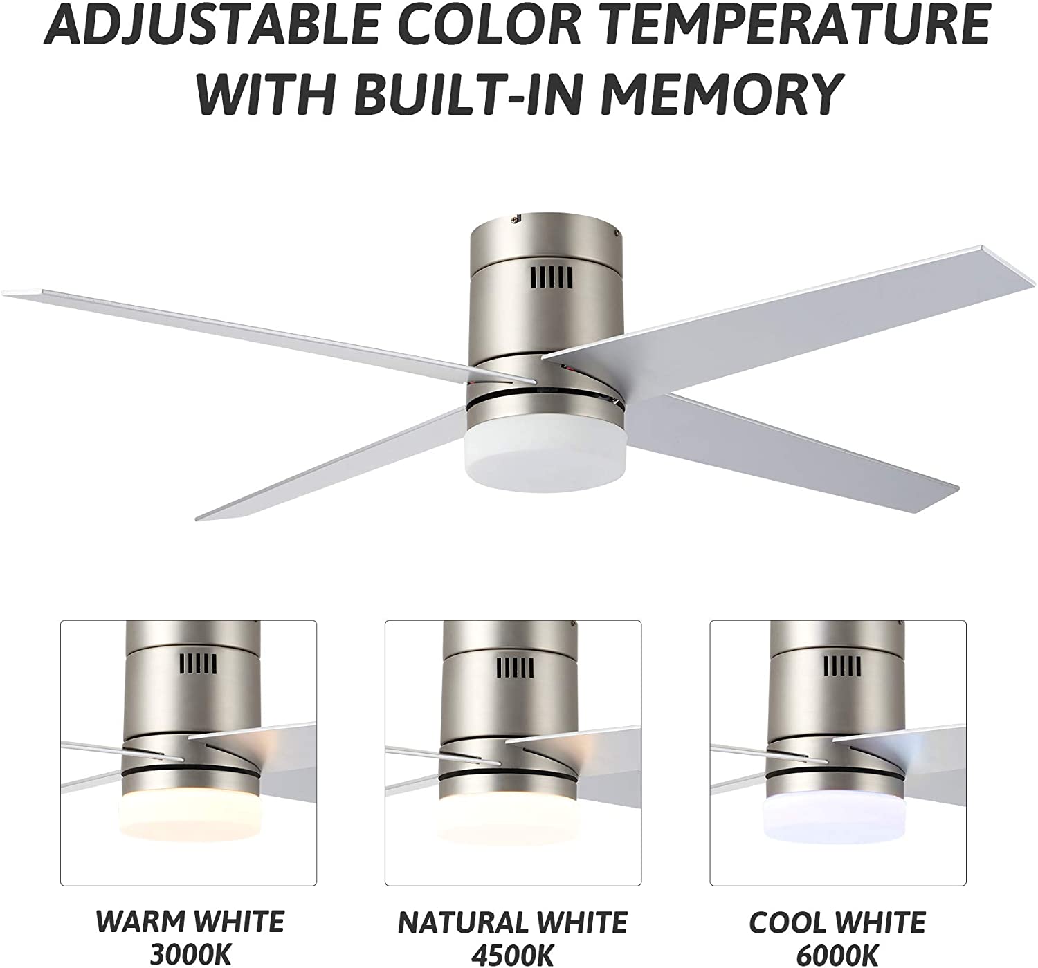52″ Modern Ceiling Fan with LED Lights and Remote, Indoor Low Profile Flush Mount Ceiling Fans for Bedroom, Living Room, Brushed Nickel Finish and 4 Reversible Plywood Blades in Cherry & Silver