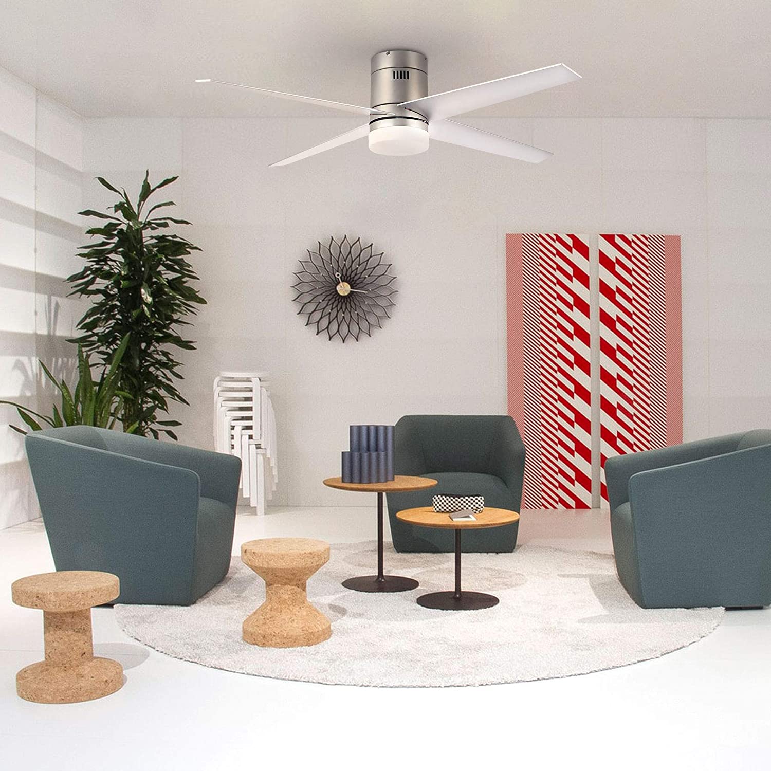 MODERN CEILING FAN: This 52″ ceiling fan with LED light kit offers modern style that brightens spaces both large and small, combining 4 reversible cherry or silver finished blades with an opaline white shade to complement any home decor from farmhouse to contemporary YEAR-ROUND COMFORT: Our indoor ceiling fan’s strong yet silent 55W bidirectional motor offers excellent circulation all year round—counterclockwise to cool you in summer and clockwise to evenly distribute warm air in winter 3 COLOR TEMPERATURES: The integrated 15W LED light comes with 3 color temperatures (3000K/4500K/6000K) for customized lighting, while the built-in memory saves your lighting choice for the next time you turn it on 3 SPEEDS & AUTO SHUTOFF: The intuitive remote control switches between 3 fan speeds and sets automatic shutoff time after 1, 2, or 4 hours for energy-efficient use DURABLE CONSTRUCTION: This low profile ceiling fan’s metal body and solid plywood blades ensure dependable lasting performance; the sturdy canopy holds the fan tightly in place for optimal stability even on the highest speed Description: Get things flowing with this chic and modern home ceiling fan with integrated LED lighting! A fan for all seasons and styles, this fashionable flush mount ceiling fan with underlighting has an attractive nickel finish that blends well with styles from mid-century modern to contemporary. The 4 reversible blades with a 52 inch blade span provide excellent reversible circulation to help cool you down in the summer and distribute heat in the winter. The 55W motor provides 3 speeds of powerful yet quiet rotation that are easily set by the included remote control. This fandelier’s timer function automatically shuts off the fan after 1, 2, or 4 hours, ensuring optimal energy-saving efficiency; while the built-in 15W LED light with opaline white shade offers 3 color temperatures to suit your mood, whether a gentle and soothing 3000K, a warm and inviting 4500K, or a bright and vivid 6000K. Perfect for any space, from intimate kitchens and bedrooms to expansive living rooms and dining rooms, this ceiling lighting and fan fixture is sure to offer you lifelong comfort and style! Specifications: Specifications Material: Plywood, Steel, Silicon Steel, Glass Body Finish: Nickel Blade Finish: Cherry, Silver Overall Dimensions: 52 x 10.4 in. (130×43 cm) Blade Area: 23.6 x 5.5 in. (60x14cm) Canopy Diameter: 7 x 2.4 in. (18×6 cm) Distance between Ceiling and Blade: 6.7 in. (17 cm) Lead Wire Length: 27.5 in. (70 cm) Motor Power: 55W Light Wattage: 15W Color Temperatures: 3000K/4500K/6000K Fan Rotation: Clockwise & Counterclockwise Timer Settings: 1/2/4 hr. Compatible Ceilings: Flat Max. Recomm. Room Size: 16.4 x 16.4 ft. (5×5 m) Net Weight: 14.3 lb. (6.5 kg) Package List 1 x Ceiling Fan 1 x LED Light Kit 1 x Remote Control 1 x Instructions