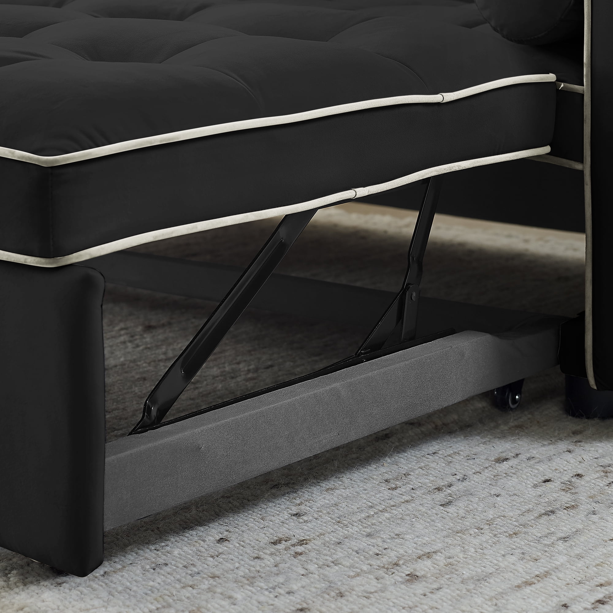1. Multifunctional pull-out sofa bed. By pulling out and lifting the bed frame under the seat and lowering the backrest, this double position sofa can be quickly converted into a bed for resting use. 2. Adjustable and super strong: soft high-grain velvet fabric and high-density foam, the backrest can be adjusted to 3 positions, 105°-180° recline or lie flat, it can be used for listening, playing games, reading, and sleeping. It will make you feel relaxed and comfortable. 3. Suitable for any scene: this multifunctional pull-out sofa bed can be placed in living room and bedroom, it can accommodate 2 people to watch TV, play games or read, it can be used for guests or children’s bed, modern design and space saving. This is definitely a good choice for applicable small rooms, apartments, studios, offices. 4. Perfect function: it has two straps to assist pull out can quickly turn the sofa into a bed. Pull-out with a bed made of high quality foam and metal iron frame can steadily support you to lie on the bed. 5. storage pockets and soft pillows. Our sofa comes with two side storage bag for you to reach and use to store your TV remote, cell phone, glasses or books. Also includes two soft pillows for added back support or sleep. 6. Easy to assemble and use. Easy-to-follow instructions ensure the perfect build and pull-out recliner setup is quick and easy. If you need a video, please contact me.