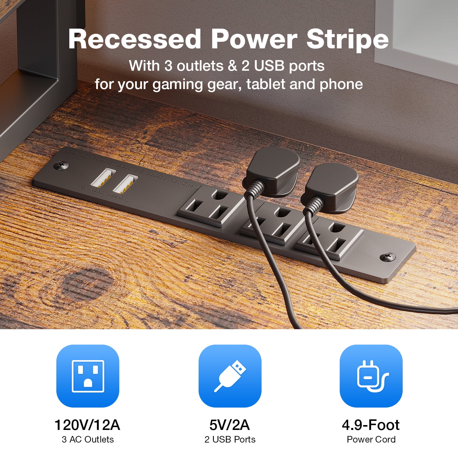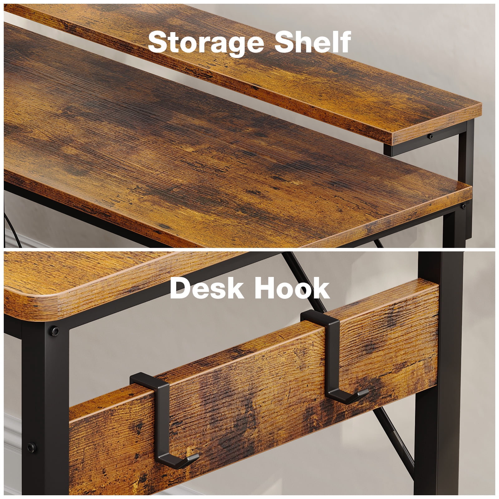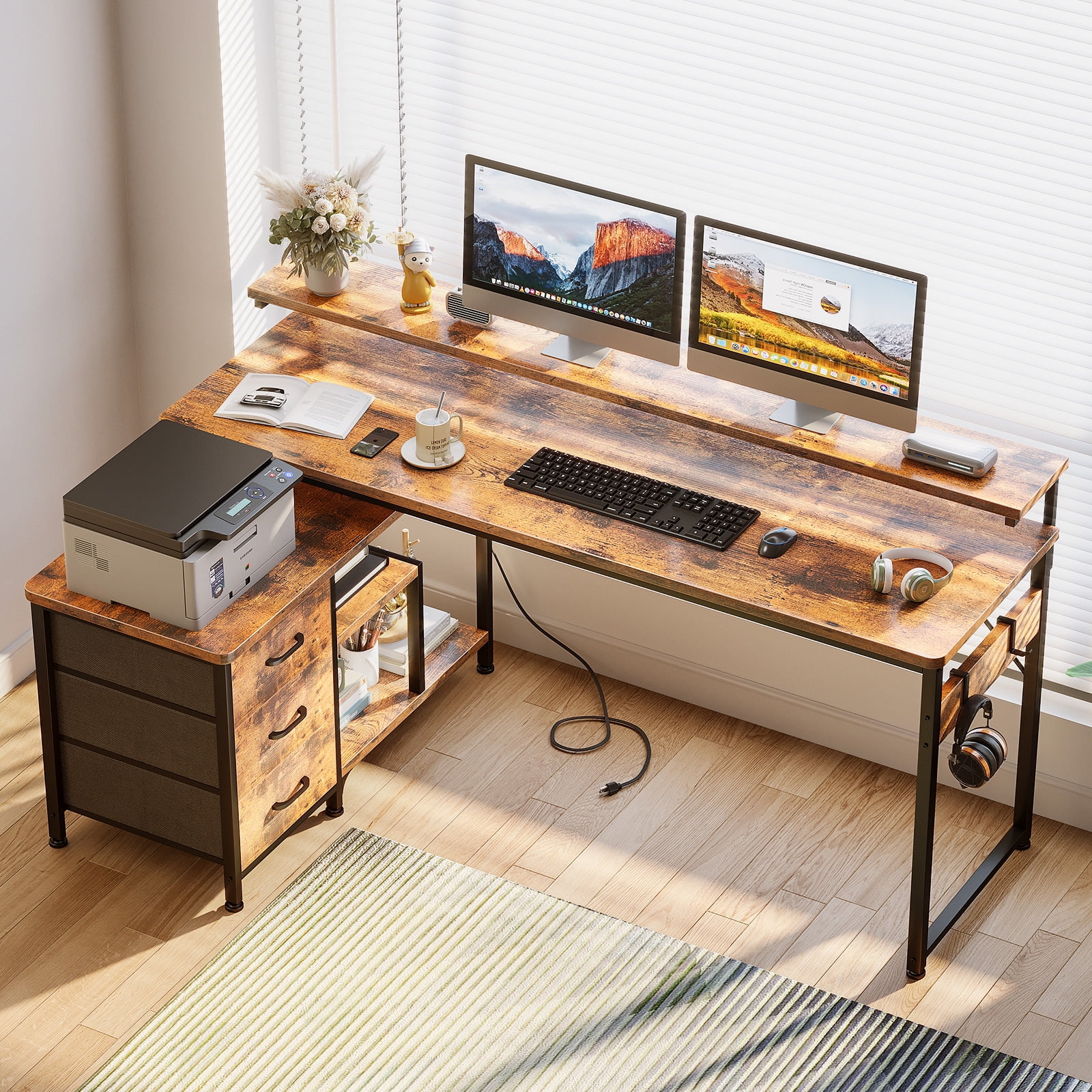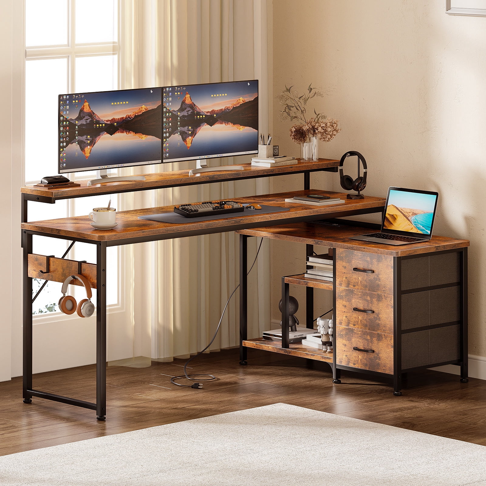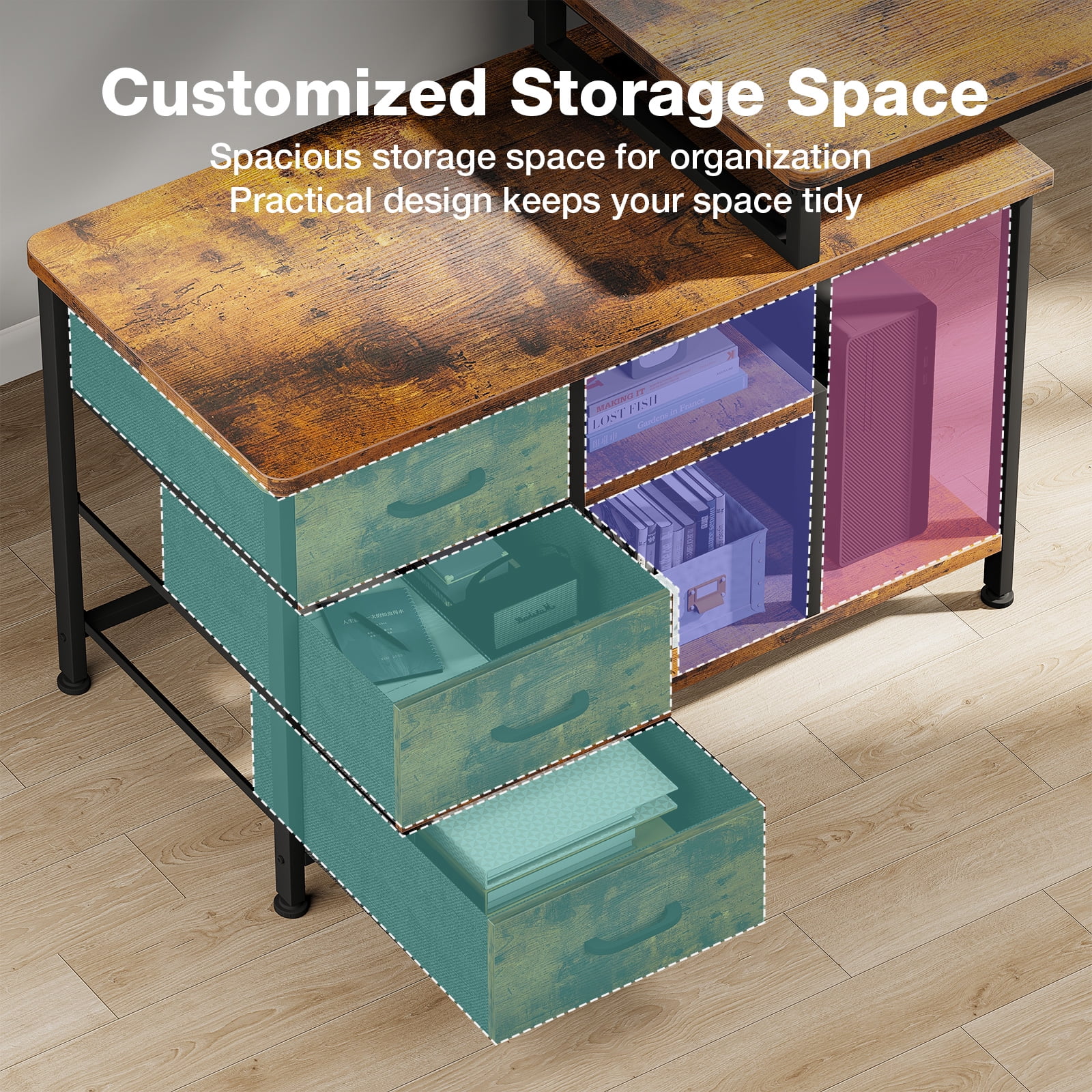 【Reversible Design & USB Charging Ports】 This Computer desk equipped with two standard plug outlets and two USB ports, this desk allows you to easily charge your phones, laptops, gaming gear, and other office devices. And it can be installed in four different configurations – as an L-shaped desk or a long desk with the side desk on the left or right side. Customize it to suit your habits and needs, providing convenience while working or gaming. 【Health-friendly Monitor Stand Design】 Monitor stand’s size enough for two monitors at the same level, not only elevates your line of sight, allowing you to maintain proper sitting posture and protect your cervical and spinal health, but also creates additional storage space on the desktop for keyboards, mice, and more. 【Home Desk with Drawers and Shelves】 With two tiers of open shelves, this desk provides storage for various items, including computer hosts, books, and small devices. Three fabric drawers, along with a wooden board, offer privacy and ample space for office stationery and documents. Two versatile hooks are perfect for hanging headphones, bags, and other useful gadgets, keeping everything easily accessible and organized. 【Sturdy and Solid Desk for Multiple Scenes】 Constructed with a premium metal frame and high-quality MDF board, this desk ensures stability, durability, and resistance to scratches and water damage. Suitable for various scenes, including a computer desk, study desk, gaming desk, office table, work desk, home desk, and workstation, providing a versatile solution for all your needs.