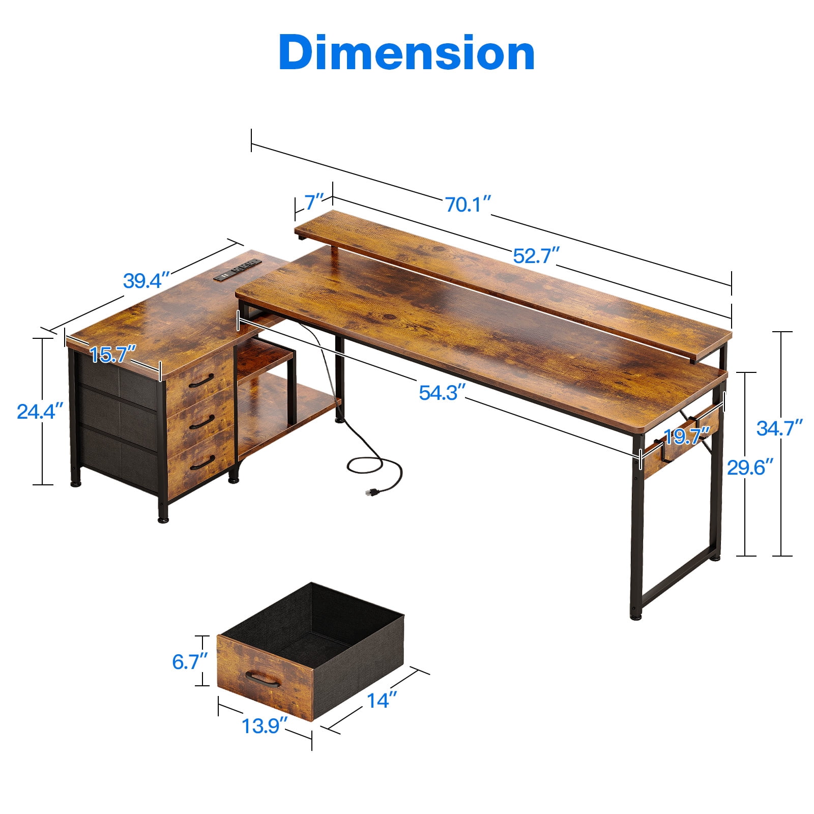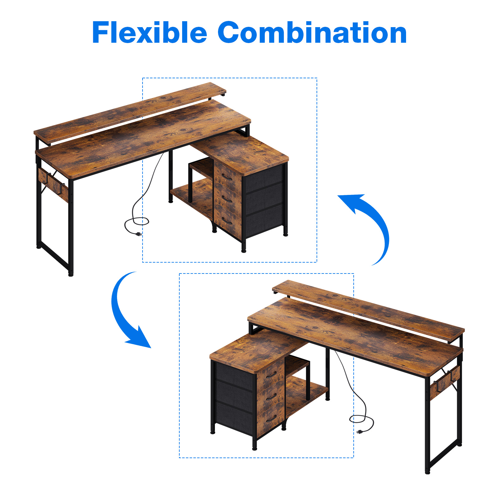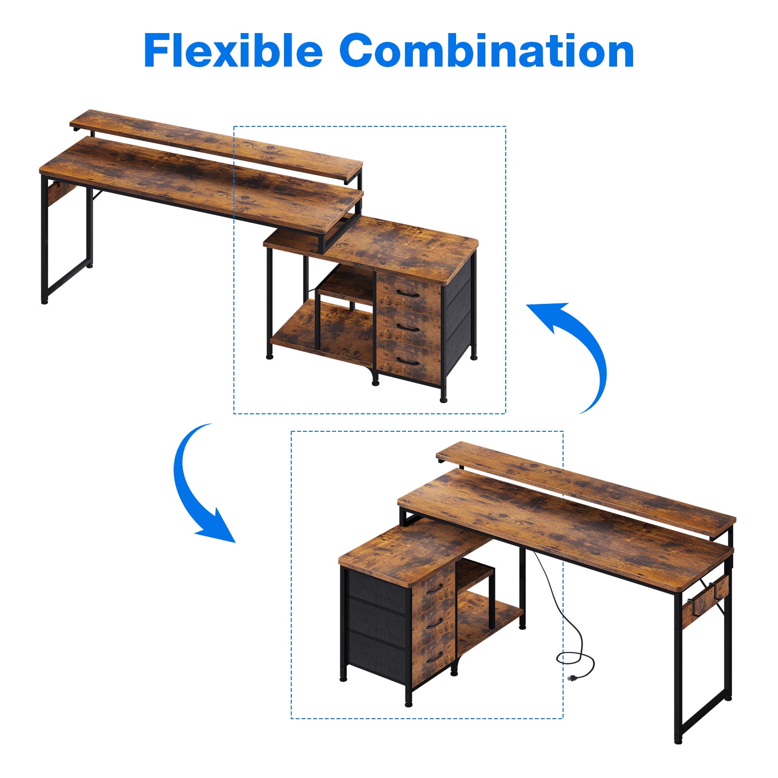 Charging Station Fabric Drawers Versatile Hook Extra Storage 39″D x 68.5″W x 35″H Vintage Home office desk Reversible Desk with Power Outlets & Drawers Office, Bedroom, Living Room 3
