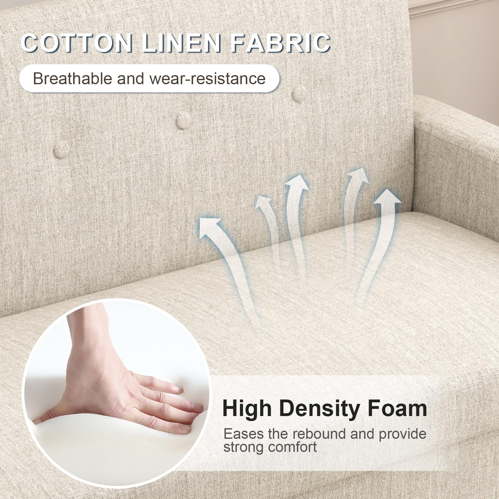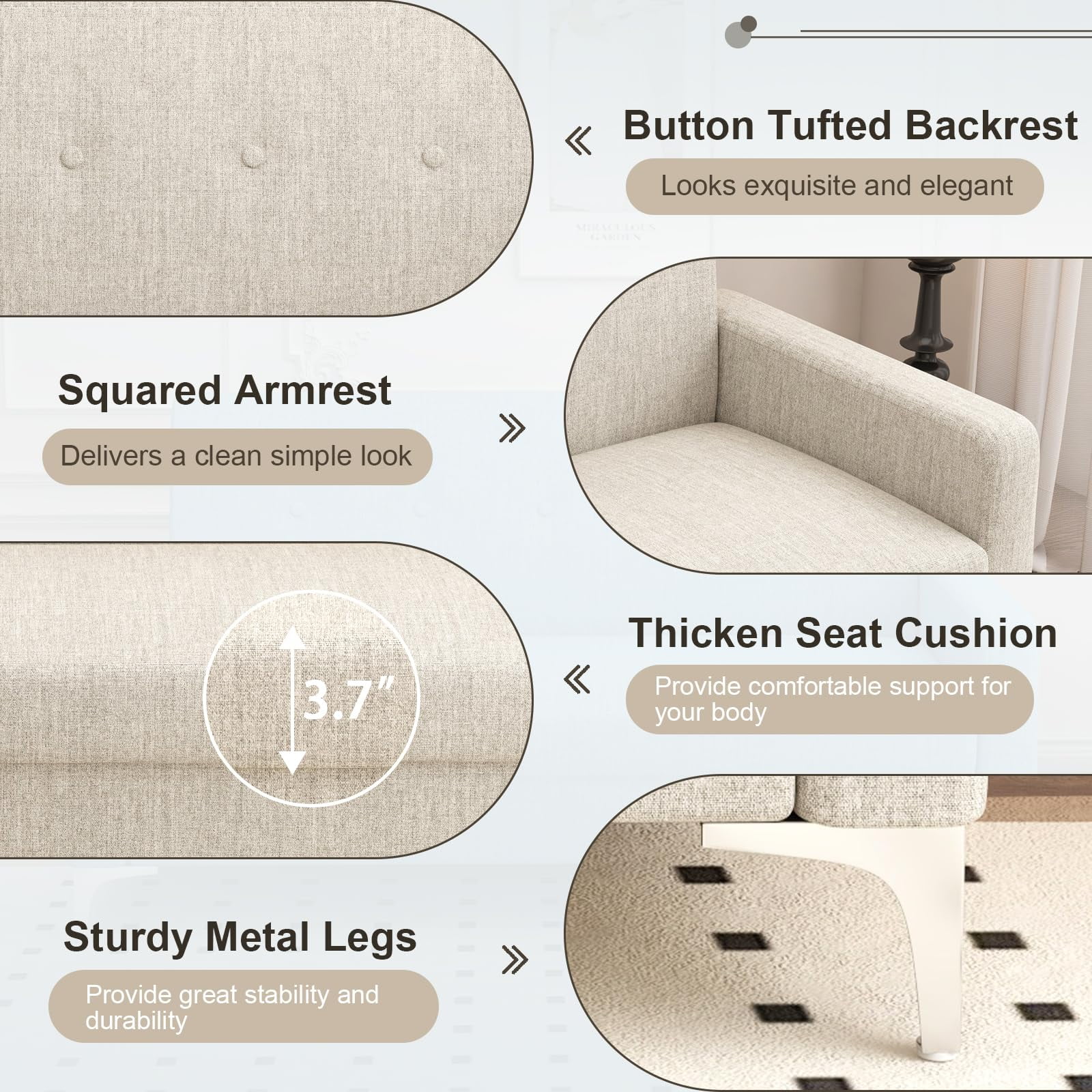 Loveseat Sofa Couch with Storage Seat, 57″ Button Tufted Upholstered 2 Seat Sofa with Side Pockets, Modern Love Seat with Silver Metal Legs for Living Room, Bedroom, Office, Small Space Weights & Dimensions Overall – sofa:57.1×24.4x30H Seat Height:16inch Arm Height:19.7 Product Weight:60.5 LBS Gross Weight:66.69 LBS Carton size:51.3*22.8*15 H 64lbs Specifications:57.1×24.4x30H Product Type:Sofa Seating Capacity:2 Upholstery Material:cotton and linen Upholstery Colour:Beige,blue,light grey, Leg Material / Color:Metals feet Seat Fill Material:sponges Back Fill Material:sponges Frame Material:Solid + Manufactured Wood Seat Construction:Solid wood +serpentine spring Pillows Included:Yes Recommended Uses For Product:Small spaces, living rooms, bedrooms, offices, dorms, apartments, storage solution, modern mid-century decor Comfortable Design Made of premium cotton linen fabric, this small loveseat is soft to the touch, breathable, wear-resistance, anti-scratch and durable. The thick sponge seat cushion provide comfort and support, allowing you to rest and entertain with maximum comfort. Under-seat Storage Space This loveseat sofa is not just a comfy seating solution, it also has an amazing spce expanding feature. Even thoughit looks simple, when you open the hiden storage space inside, you will realize that it can be a good helper for collecting sundries sunch as blankets, pillows or other items. PLEASE NOTE: All colors on our website are for reference only, actual product colors may vary slightly due to different color settings for each screen device. Most of our sofas are measured by hand, so dimensions are for reference only and may vary slightly.