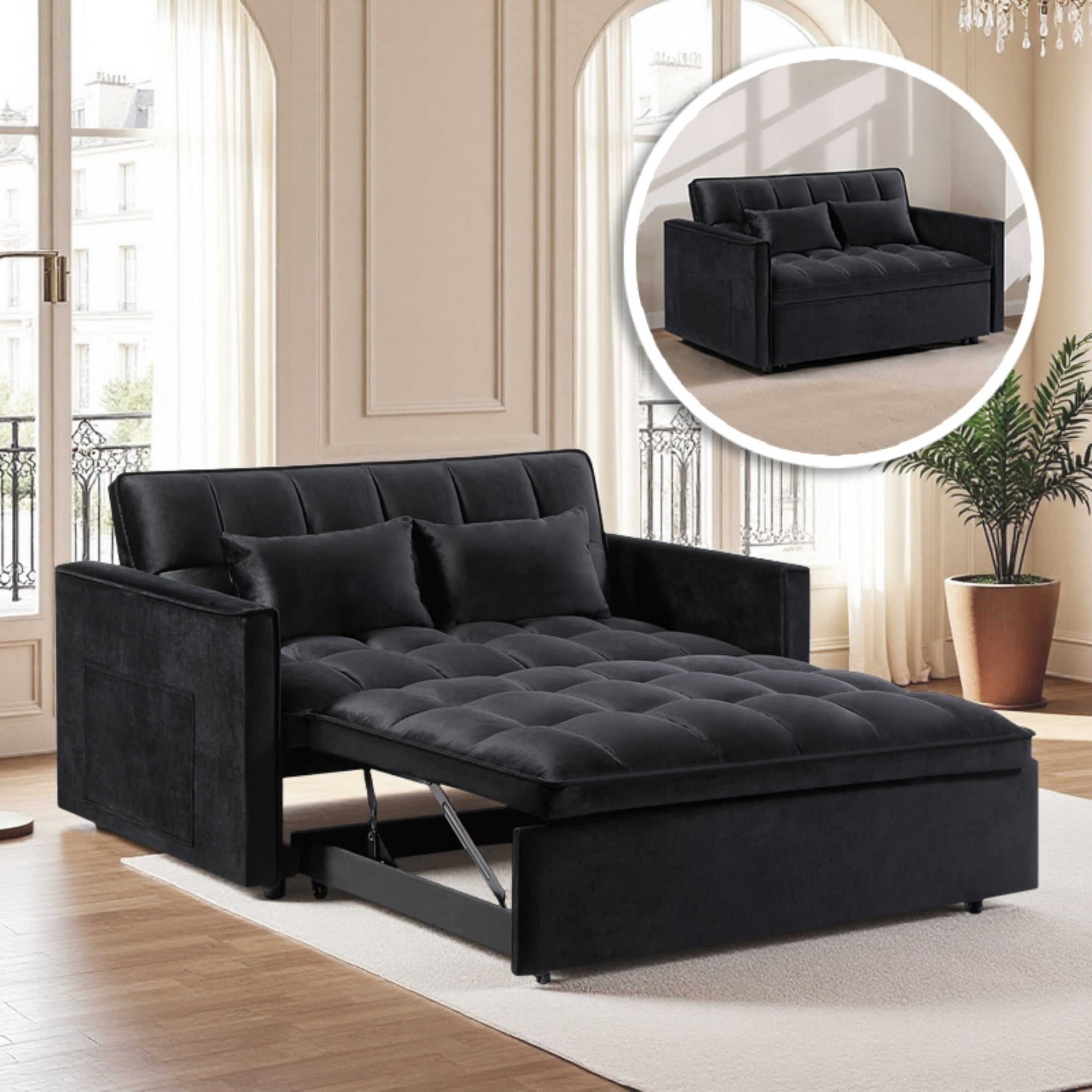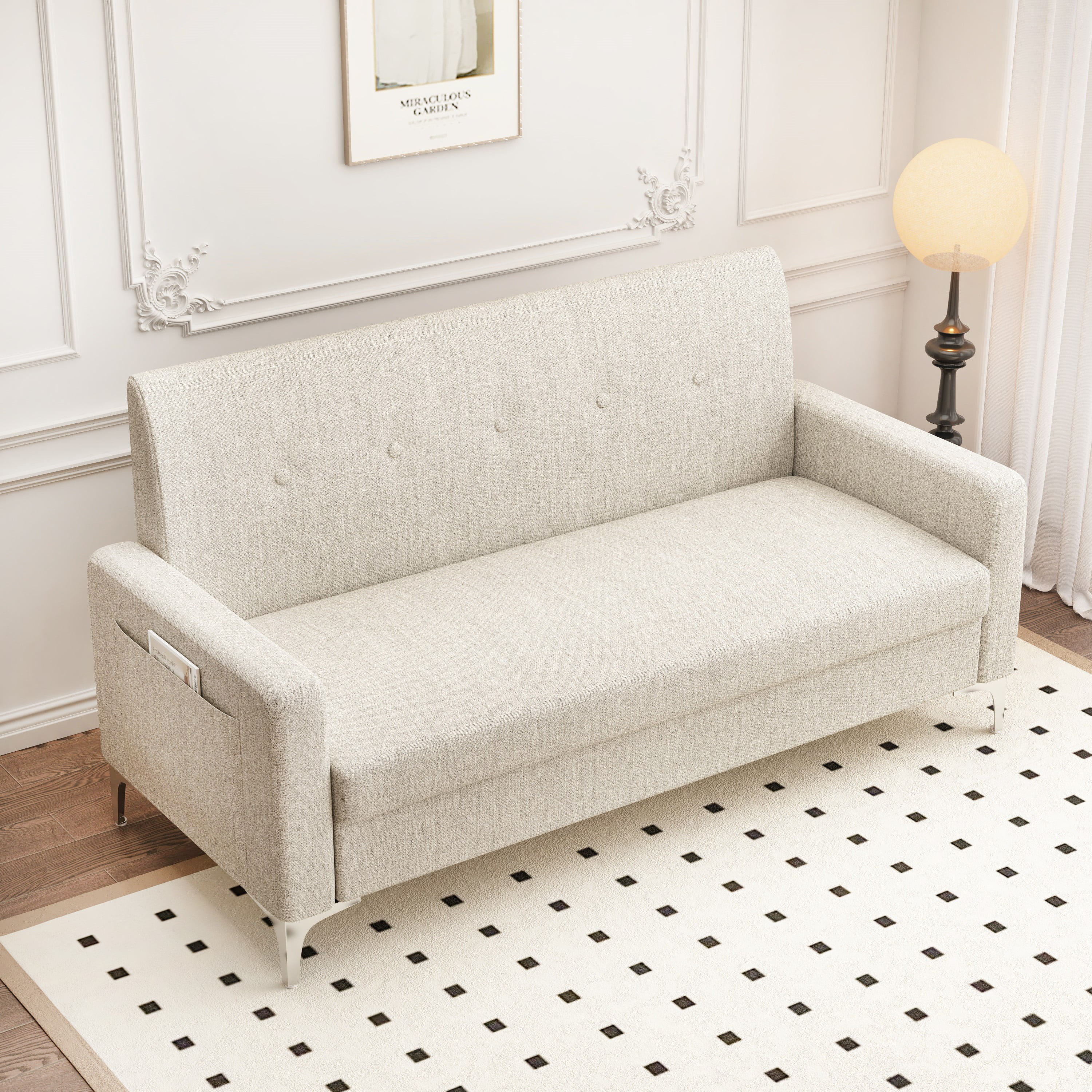 2 Storage Side Pockets:Our small sofa comes with 2 large side storage pockets to keep everything witin reach. It will provide you ample room to place magazines, books, remote controllers, glasses and other things at hand. Durable & Sturdy Wood Construction:The upholstered couch is built on a solid wood frame that adds durability and stability, four metal legs provide excellent sturdiness, strong carrying capacity up to 600 lbs. It is appropriate for individuals of any size. Perfect for Small Space:Featuring button tufted back and storage function design, this 57″ sofa couch with compact size adds modern mid century charm to your small living room, dorms, apartments, offices. It will nicely decor your living space and adds elegance for any room.