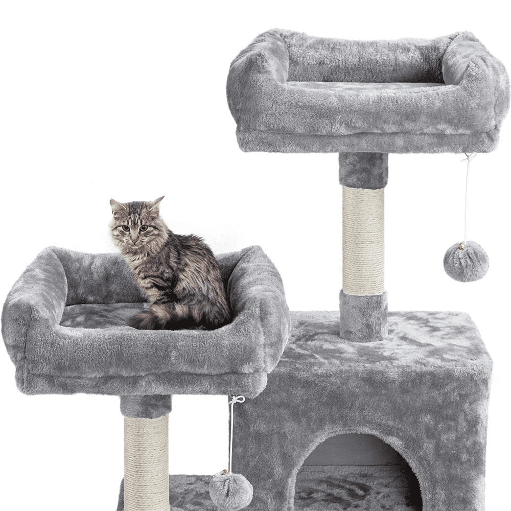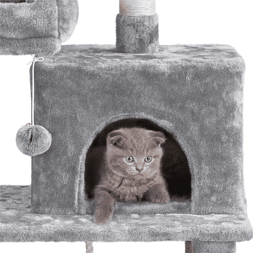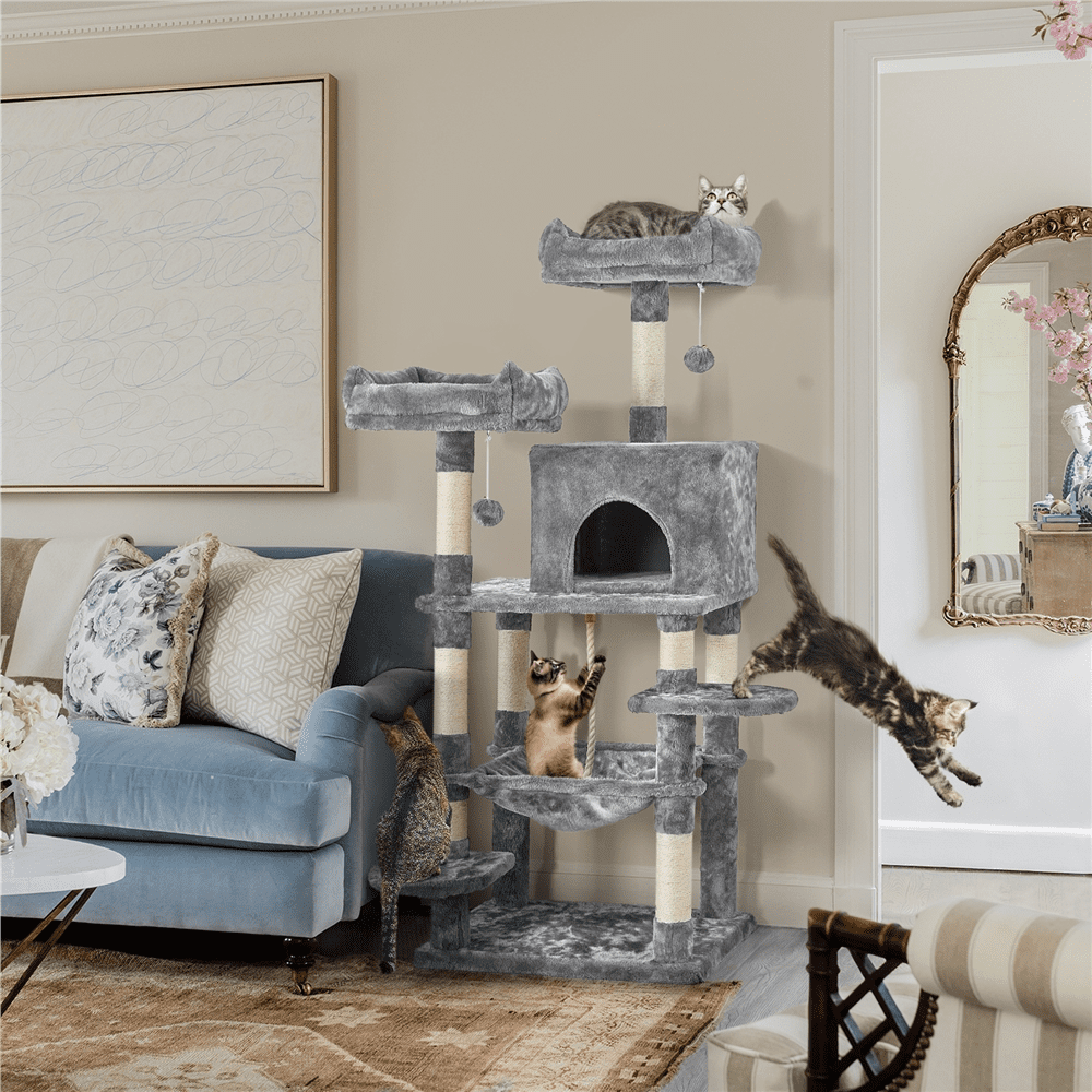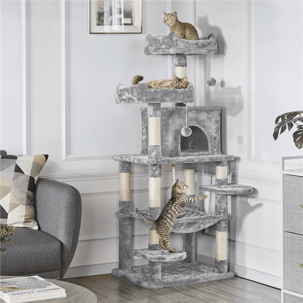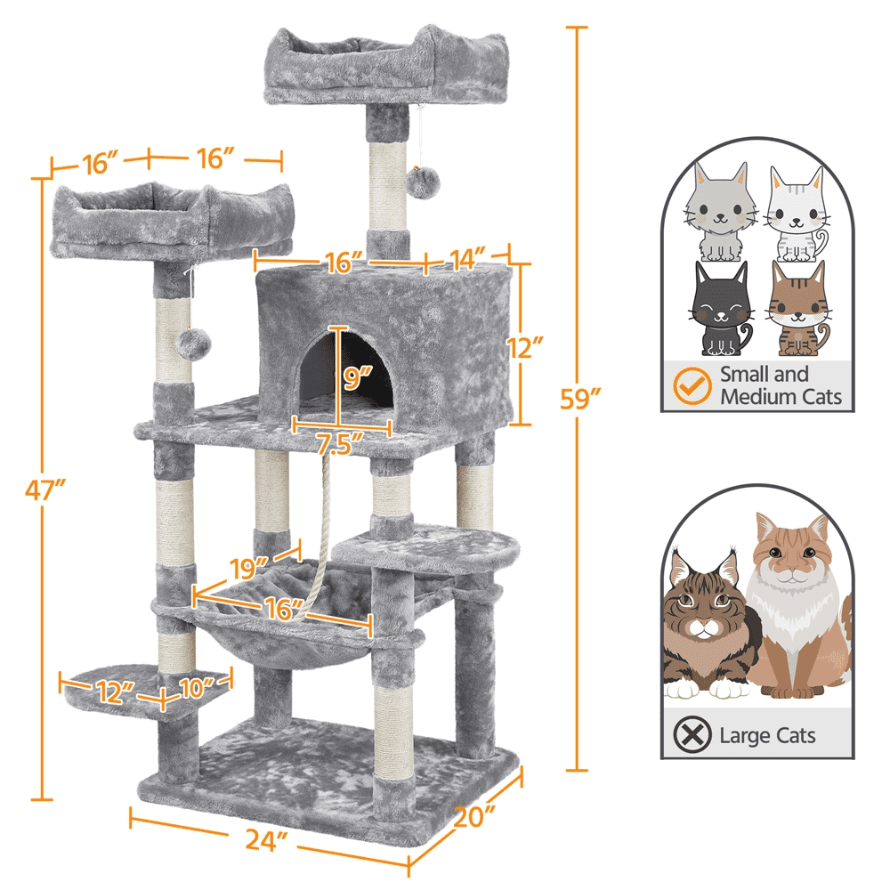 58″ Luxurious Multi-Level Cat Tree Condo for Kittens Pet House Play Material: particle board, plush, sisal, paper tubes, metal, and plastic Color: Light Gray G.W.: 38.1lb N.W.: 35.3 Overall size: 24in L x 20in W x 59in H Condo size: 16in L x 14in W x 12in H Condo entrance size: 7.5in W x 8in H Perch size: 15.7in L x 15.7in W x 4in H Hammock size: 15.7in L x 19in W Please allow ±1.5cm/0.6inch error due to manual measurement. Keep the cat tree dry and away from fire. Please make sure the size of the product fits your pet before purchasing. This cat tree is recommended for families with 2-3 medium/large cats. Residential Use Assembly required