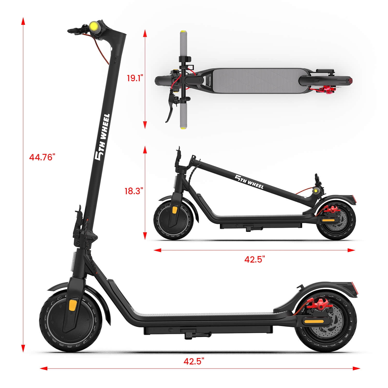 Why Choose US * Our Electric scooter with turn light signals for traffic safety. * The 8.5-inch tires have the advantages of wear-resistant, durability, and longer service time. * Braking system: EABS + Disc braking. All these make it easy to ride and safer. * The net weight is 30lbs and this foldable electric scooter can be carried easily. 5TH WHEEL Commuter Foldable Electric Scooter with Smart APP * Faster – 18mph Speed Featuring a 300W motor, Peak 500W motor, which accelerates to 18 mph in seconds. * Longer – 12 Miles Range The high capacity 36V, 6Ah battery lasts up to 12 miles per charge. * Light System Front & Rear light, turn signal Features Unique Turn Signal Light and Dual Brake System: 5TH WHEEL’s Electric Scooter features the safest turn signal light design, providing left and right signals to accompany you intimately on your rides. It ensures pedestrians and vehicles are alerted of your upcoming turns, ensuring a safer ride. Additionally, the scooter is equipped with EABS and Disc brake system, provides responsive and timely braking at any speed. Make Commuting Easier: Our electric scooters enhance travel efficiency and reduce traffic wait times, 500W peak power motor provides ample power. With its 8.5″ solid tires and rear shock absorption, allowing you to tackle uneven terrains without any impact on your comfort. The aerospace-grade aluminum frame offers sturdy support for riders weighing up to 265 pounds and effortlessly conquers 15% inclines. Full Charge about 4 hours. Cruise Control and 4-Speed: The cruise control feature allows for a more relaxed and energy-efficient ride, as you no longer need to continuously hold down the throttle for a comfortable and stable riding experience. The scooter also offers four-speed gears, giving you the freedom to choose your preferred speed to adapt to different riding scenarios. The Smart 5thWheel App supports functions such as locking the scooter, changing speed units, and checking battery life. Foldable and Lightweight: Adult electric scooter can be folded in just 3 seconds, achieving maximum portability, it weighs 30 pounds, easy to carry and store in your garage or car, ensuring enhanced theft-proof security. 5TH WHEEL Support Service: Providing a 12-month manufacturer’s warranty and replaceable parts. Feel free to reach out to us anytime, and we will respond within 24 hours to ensure a satisfactory solution. Specification Start Mode: Zero Start/Non-Zero Start APP: Support iOS & Android Tires: 8.5 inch Solid tires Braking System: EABS+DISC Braking Waterproof: IP54 Battery: 36V 6Ah Motor: 300W(Peak 500W) Charging Time: 4 Hours Max Speed: 18mph Max Range: 12miles Max Slope: 15% Max Loading: 265lbs Color: Black Item Weight: 30lbs Electric Scooter with Turn Signals Light Item Package Dimensions: 45.47in*6.1in*20.07in Included Components: E-Scooter, User Manual, Charger, Installation Tools