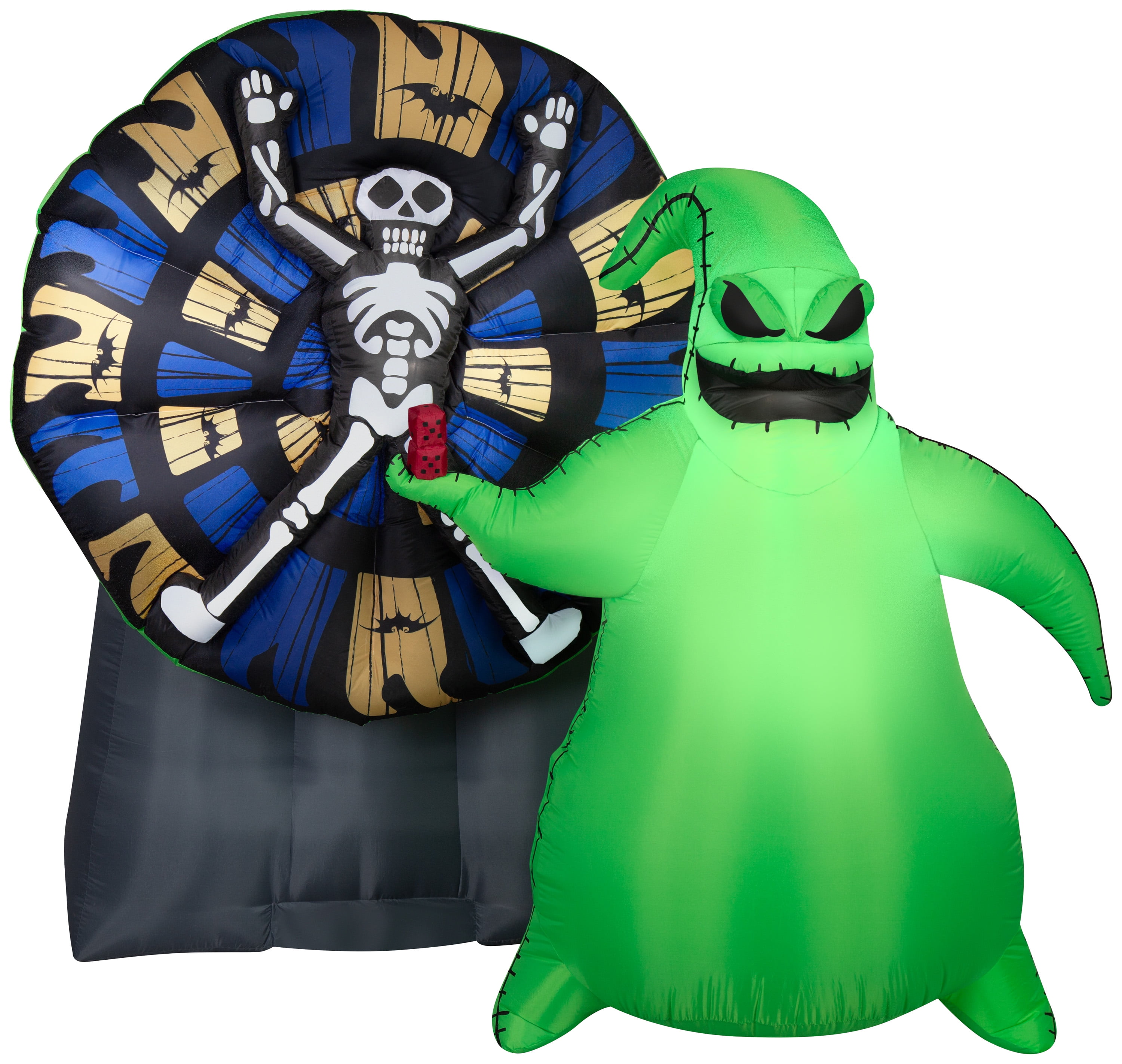Fans of The Nightmare Before Christmas will love this animated Airblown® Inflatable Oogie Boogie Wheel of Death! Featuring a bright green Oogie Boogie and skeleton splayed out on a spinning wheel, this animated inflatable makes a spooktacular addition to your outdoor Halloween decorations Wheel turns and reverses in other direction Self-inflates in seconds and deflates for easy storage Dimensions: 78″H x 54″W x81″L Wheel turns and reverses in other direction|Self-inflates in seconds and deflates for easy storage|Includes stakes and tethers