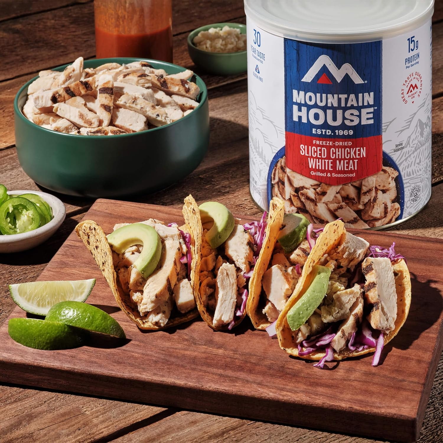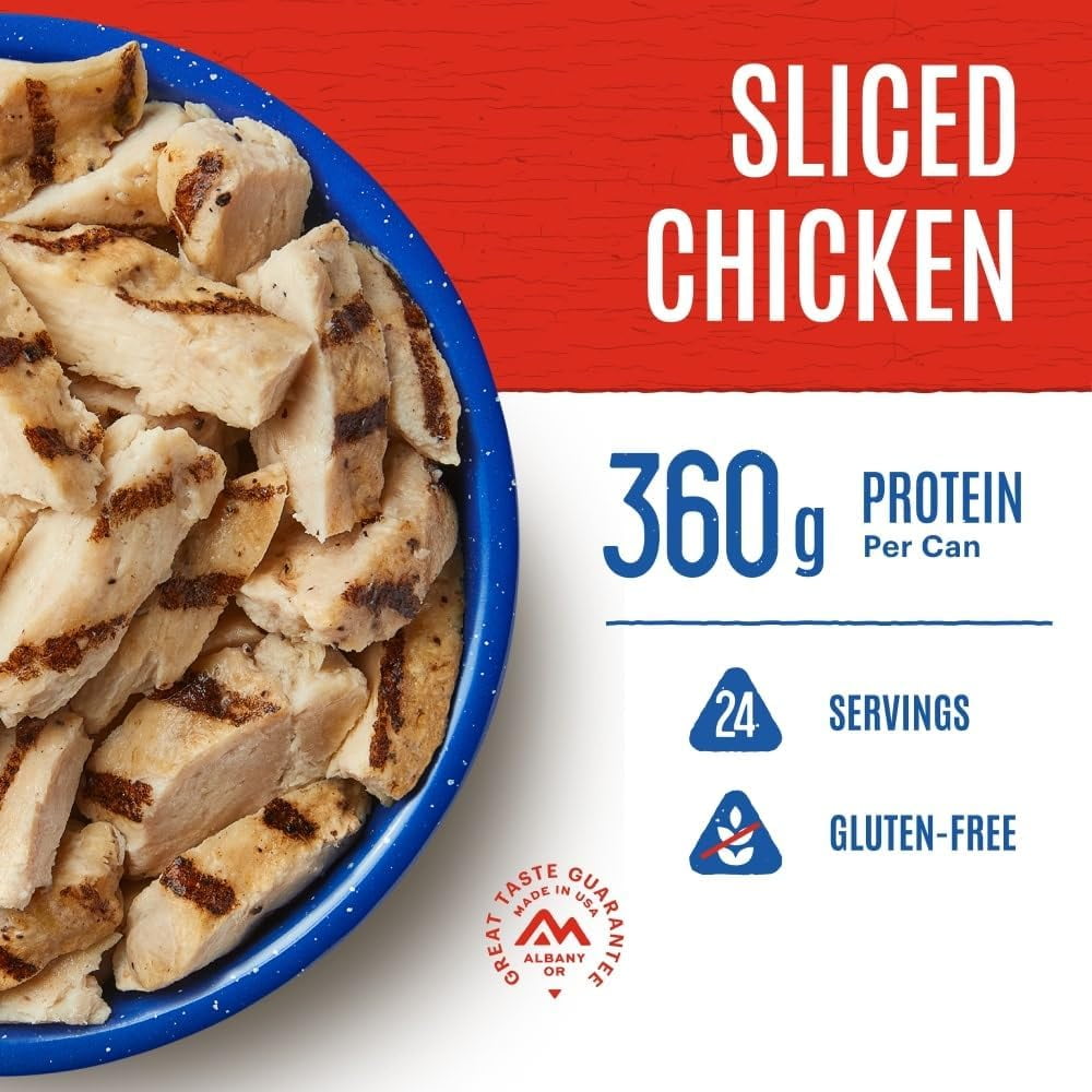 Mountain House Grilled Sliced Chicken #10 Can ✅ Freeze Dried Survival & Emergency Camping Food | 24 Servings can- 6 Cans ✅. Emergencies can come in many forms. Sometimes it involves a power outage and sometimes it is unexpected guests. Either way, Mountain House has you covered. Our freeze-dried meats are not only delicious and comforting, but they are easy to prepare no matter what environment you find yourself in. Mountain House Grilled Sliced Chicken does not require any cooking. Simply open the can, add water, stir, wait a few minutes, drain excess water, and serve. You will have delicious, tender, sliced white chicken with the perfect amount of seasoning in less than ten minutes! Mountain House Grilled Sliced Chicken is perfect for everyday cooking, family camping trips, or emergency food and survival food storage. Use in your favorite recipes like tacos, salads, casseroles, and more. With each can containing 24 servings, you can feed the whole group! Since 1969, Mountain House has been the favorite food choice among adventure and emergency preparation specialists. This real world experience with our products allows us to prove with confidence that – with proper care – your food investment will remain fresh for over 30 years! In fact, Mountain House meals have the longest proven shelf life in the industry and we back up that claim with our 30-Year Taste Guarantee. Have peace of mind with Mountain House