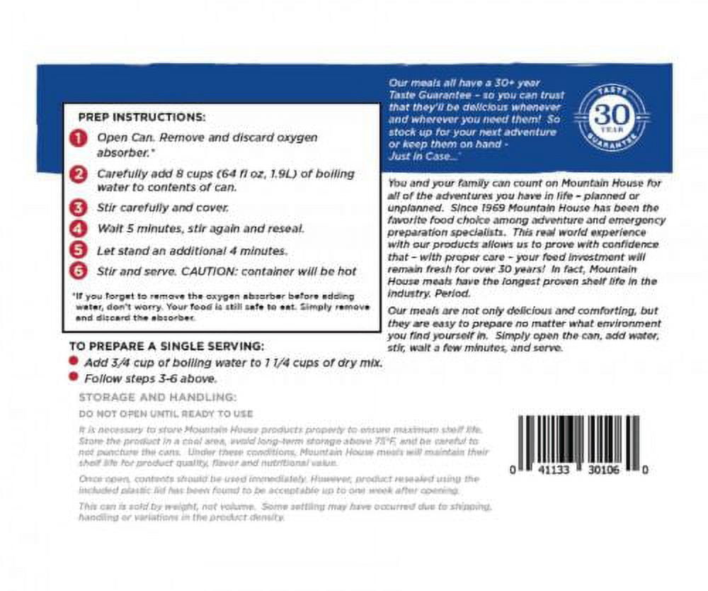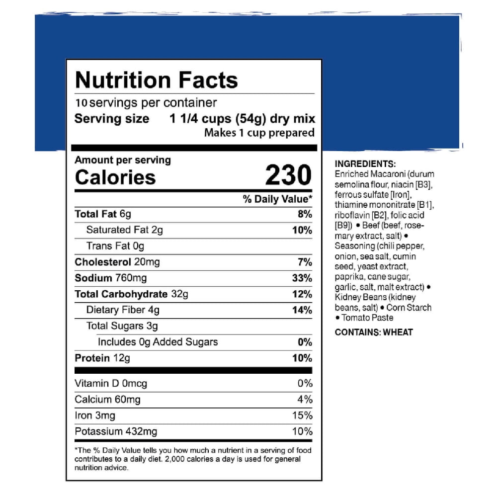 Mountain House Chili Mac With Beef #10 Can Freeze Dried Food For Emergency Long Term Storage Food For Camping And Hiking Case of six #10 cans of MH freeze dried Chili Mac. Authorized Dealer, Free Shipping Very popular variety. 30 year shelf life. Ships fresh to you promptly. Whether you’re trekking the Sierra Nevada or camping with the Boy Scouts right in your backyard, our Mountain House Chili Mac is an insanely delicious meal that’s guaranteed to fill you right up at the end of a long day. Made with pillowy macaroni noodles, savory precooked beef and yummy kidney beans in a tasty chili sauce, our freeze dried Chili Mac is a customer favorite from coast to coast. Just add hot water and you’ll have a comforting hot meal in minutes. Available in four sizes to suit your next adventure