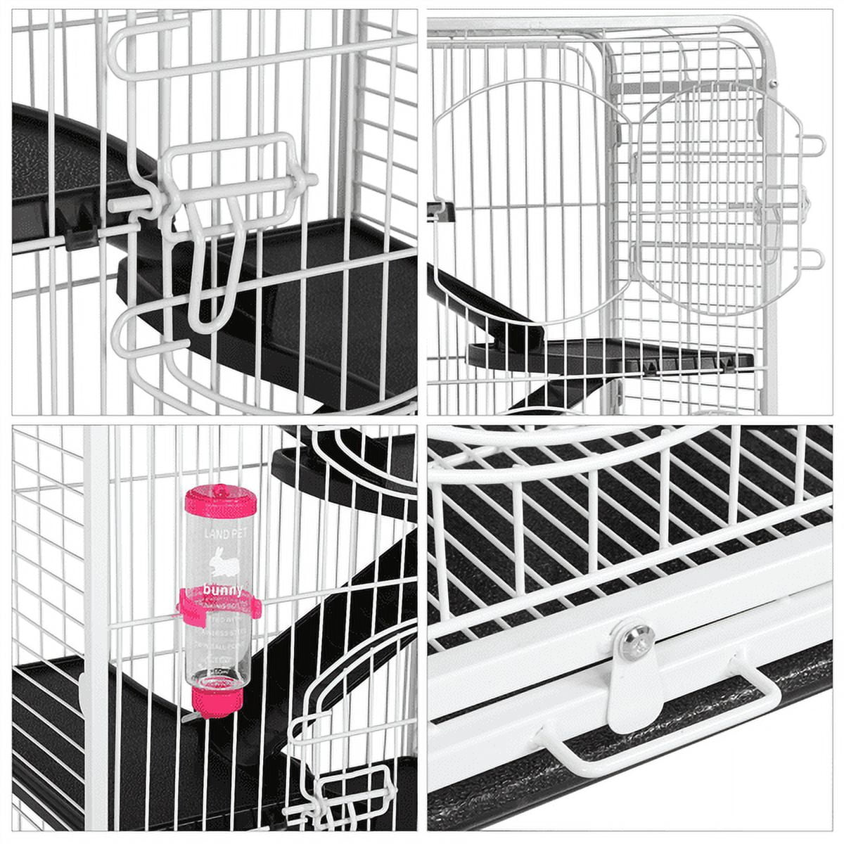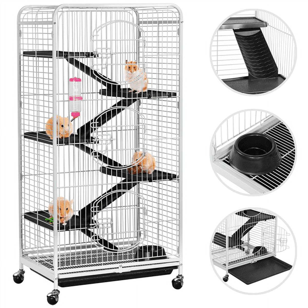 *Features: EXTRA LARGE EXERCISE PLACE: 25.2 x 17.2 x 51.7″large pet cage with 0.9″ bar spacing allows several small animals to have fun at the same time; six tiers are connected with ramps, which expand the usable area for pets to climb and rest; perfect for small pets like guinea pigs, squirrels, chinchillas, ferrets, rabbits, rats, hedgehogs, etc. FANTASTIC MANSION FOR YOUR SMALL PETS: Detachable ramps and tier panels can be easily removed so you can decide the layout of the cage and design a home that most comfortable for your pets to live and play in; pet toys and hammock can be placed or hung on the cage and platforms to satisfy the playful nature of pets; three doors in the front of the cage for easy entry and exit from different tiers DURABLE & STURDY: This cage is constructed with the powder coated metal square tubes and wires; non-toxic hammertone paint gives this stylish cage excellent wear and corrosion resistance; features 4 heavy duty casters at the bottom guarantee high load capacity SAFE & SECURE: All three arched doors are secured with latches, keeping your pets safe in the cage when you are not around; arc designed ramp with embossed stripes for safety purpose, which can increase the friction and prevent your pets from slipping during their climbing; smooth seams and rounded corners protect your pets and yourself from undesired injury EASY CLEANING: 3-Door design makes it easy to clean the cage and tiers with tools; a slide-out tray under the cage can be removed and cleaned with water; a metal grate between pets and the tray can avoid your pets walking/laying directly on their droppings CONVENIENT MOVING: Due to its extra large size, it may take a little effort to move this cage. However, our ferret cage that sits on four heavy duty rolling casters has perfectly solved this problem. Ball-shaped casters can roll in all directions smoothly. WORRY-FREE ASSEMBLY: Simple assembly is required to set up this pet cage. The cage comes with all necessary parts, hardware, detailed instructions and tool for easy and quick assembly. FREE ACCESSORY: This chinchilla cage comes with a complimentary wall-mounted water bottle and a pet bowl.