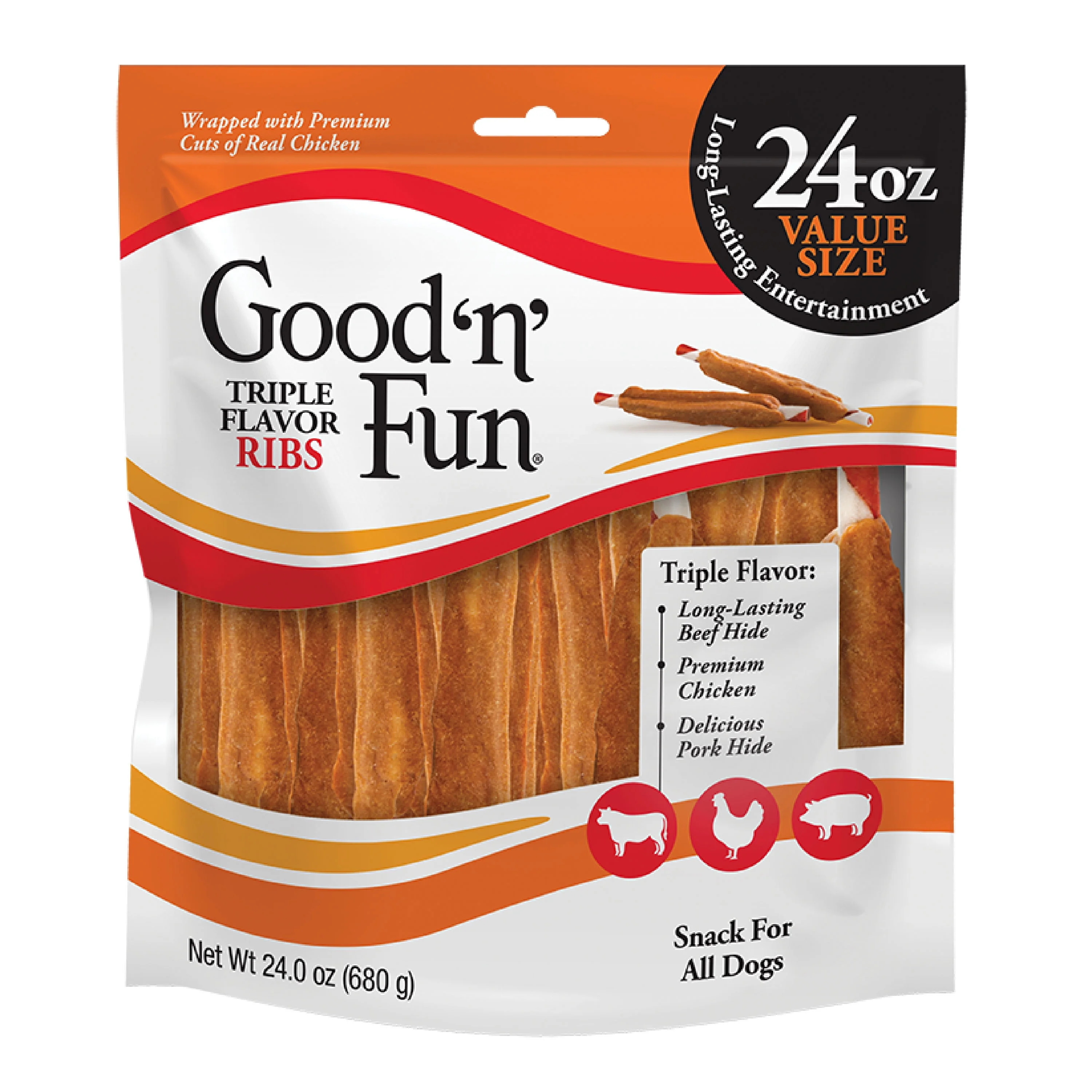 THREE FLAVORS DOGS LOVE: Made from premium rawhide and delicious pork hide, then wrapped with real, savory chicken. LONG-LASTING: Good ‘n’ Fun® Triple Flavor Ribs are truly delightful, long-lasting rawhide treats your dog will love. HIGH IN PROTEIN: Perfect to give your dog every day for a chew full of fun and flavor. NATURAL CHEWING ACTION: Promotes clean teeth from the natural action of chewing. TRIPLE FLAVOR RIBS: Wrapped with premium chicken for a taste canines crave.