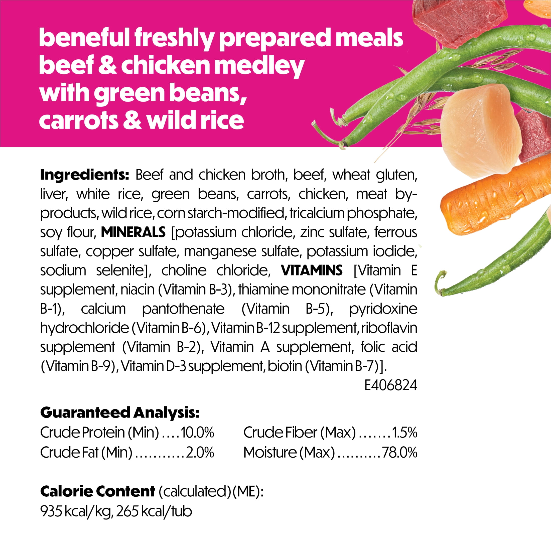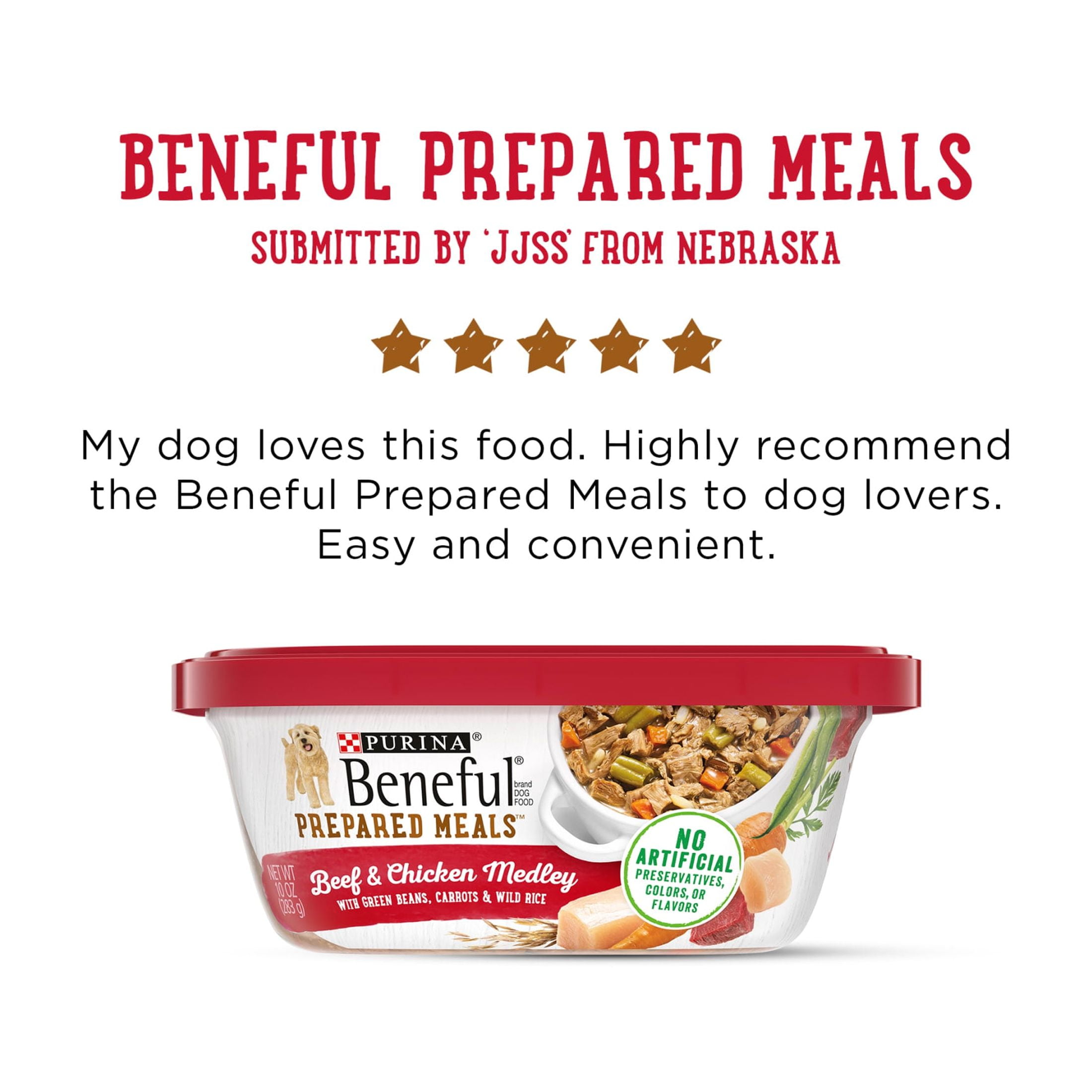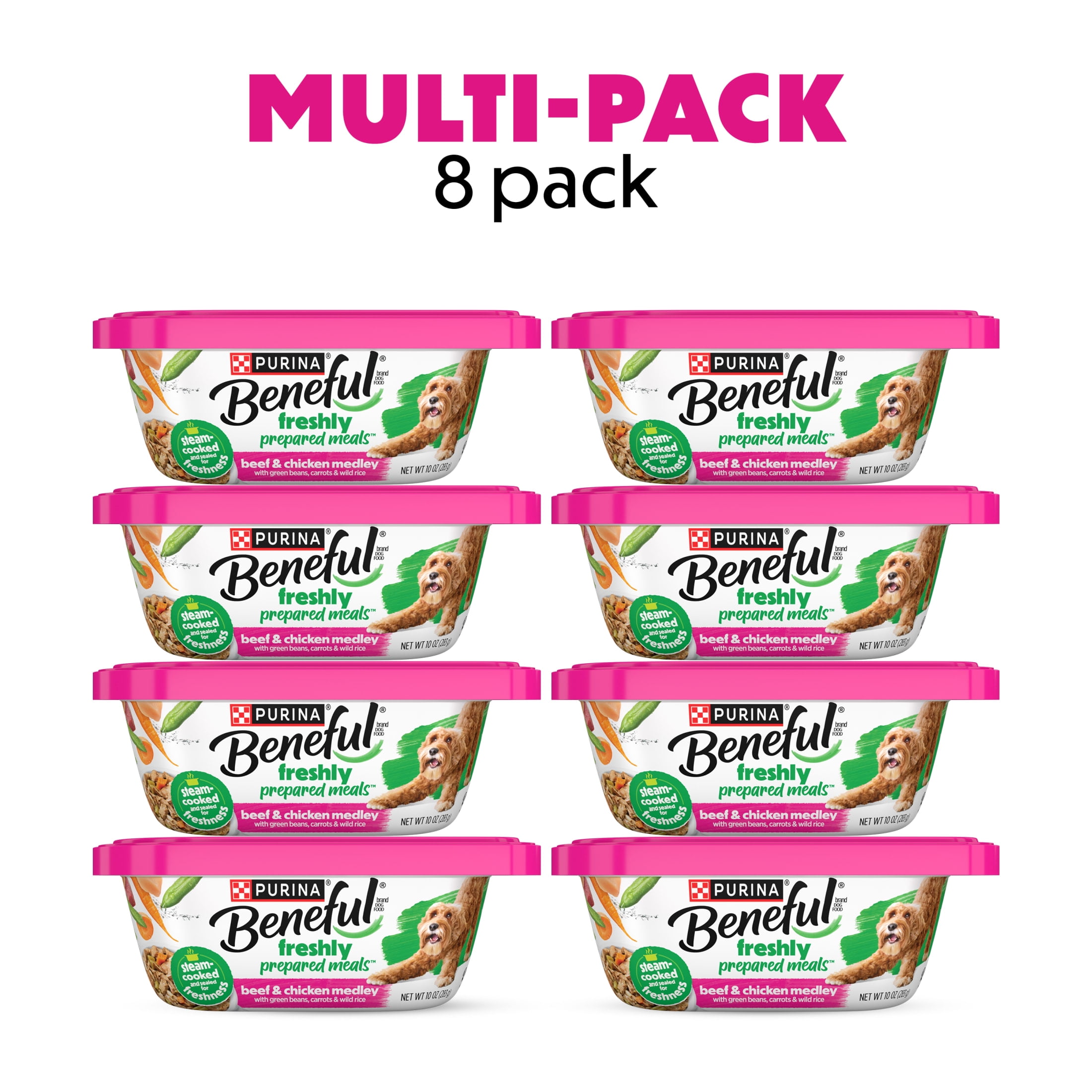 Give your dog a delicious and nutritious meal with Purina Beneful Wet Dog Food Freshly Prepared Meals. This dog food fresh recipe features real beef dog food and chicken dog food, plus wholesome grains and vegetables like green beans, carrots, and wild rice. Every bite is packed with high protein dog food to support strong muscles and keep your dog active and healthy. The dog food chunks are served in a rich dog food gravy, providing a satisfying texture and taste dogs love. This gravy dog food enhances mealtime excitement while helping support hydration. Whether served as a complete meal or used as dog food toppers, this wet dog food delivers a flavorful and balanced diet that meets the needs of adult dogs. Designed with care, this healthy dog food contains no artificial colors, flavors, or preservatives. It provides 100 percent complete and balanced nutrition, including essential vitamins and minerals to help maintain overall wellness. The resealable container makes it easy to store leftovers and keep the fresh dog food flavorful between servings. Perfect for dogs who enjoy tender, meaty meals or those needing variety in their diet, this purina beneful wet dog food is a great addition to any mealtime routine. Treat your dog to the beneful dog food wet experience that offers quality ingredients and a taste they will love in every serving.