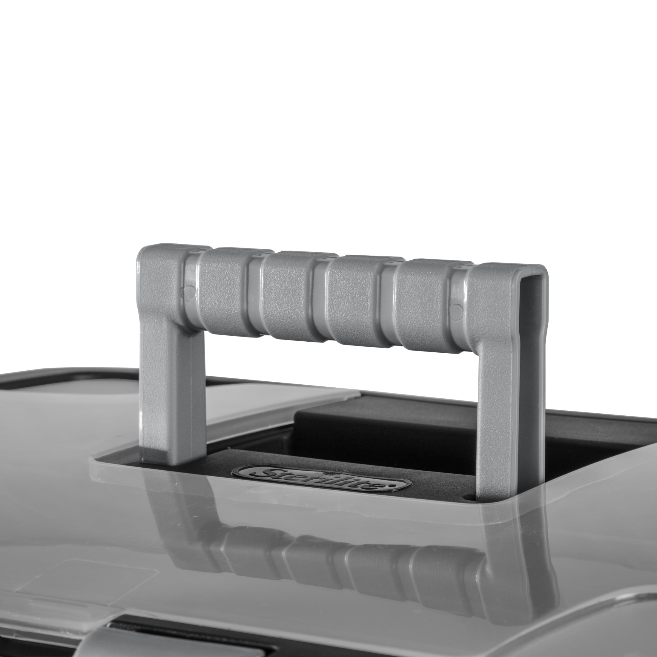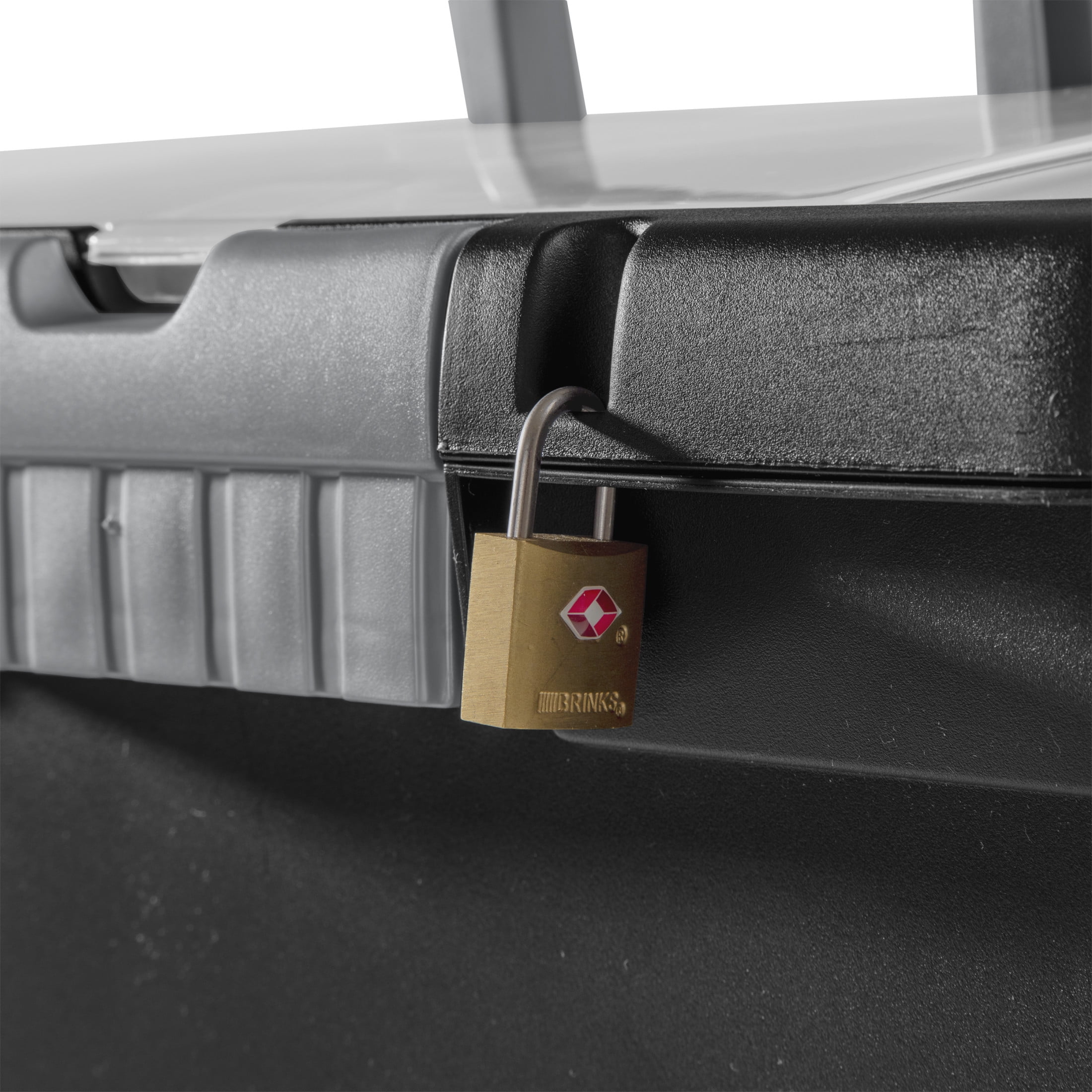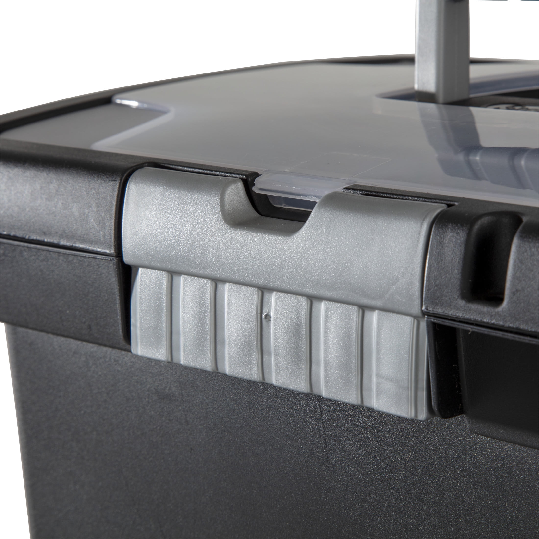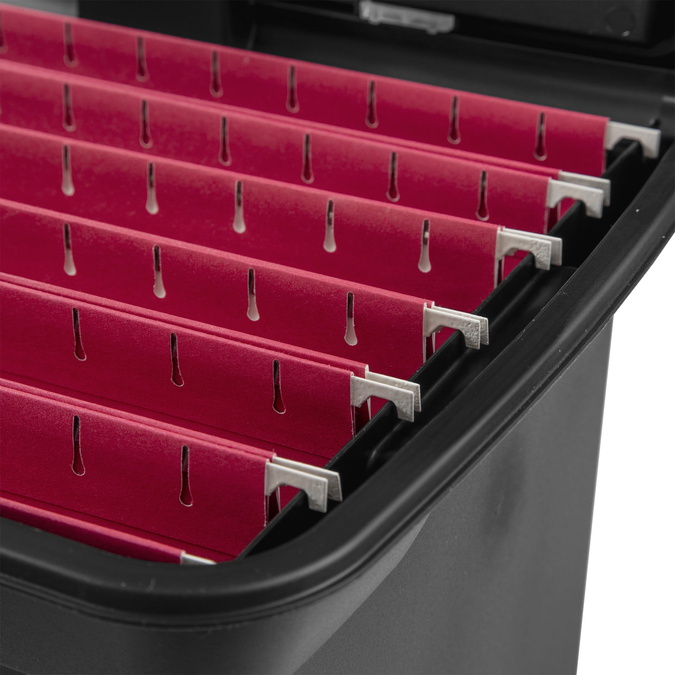 Sterilite Plastic Portable File Box Black: Outside Dimensions: 15″ x 10 7/8″ x 11 1/2″ Single unit option Black Ideal portable solution for letter sized hanging folders, featuring a sturdy handle with a comfort grip Spacious in-lid compartment for easy access to items most frequently used and on the go office essentials Durable latch keeps lid secure and contents in place, use a small padlock or zip tie for added security Indexed cover allows multiple File Boxes to be stacked for efficient use of storage space