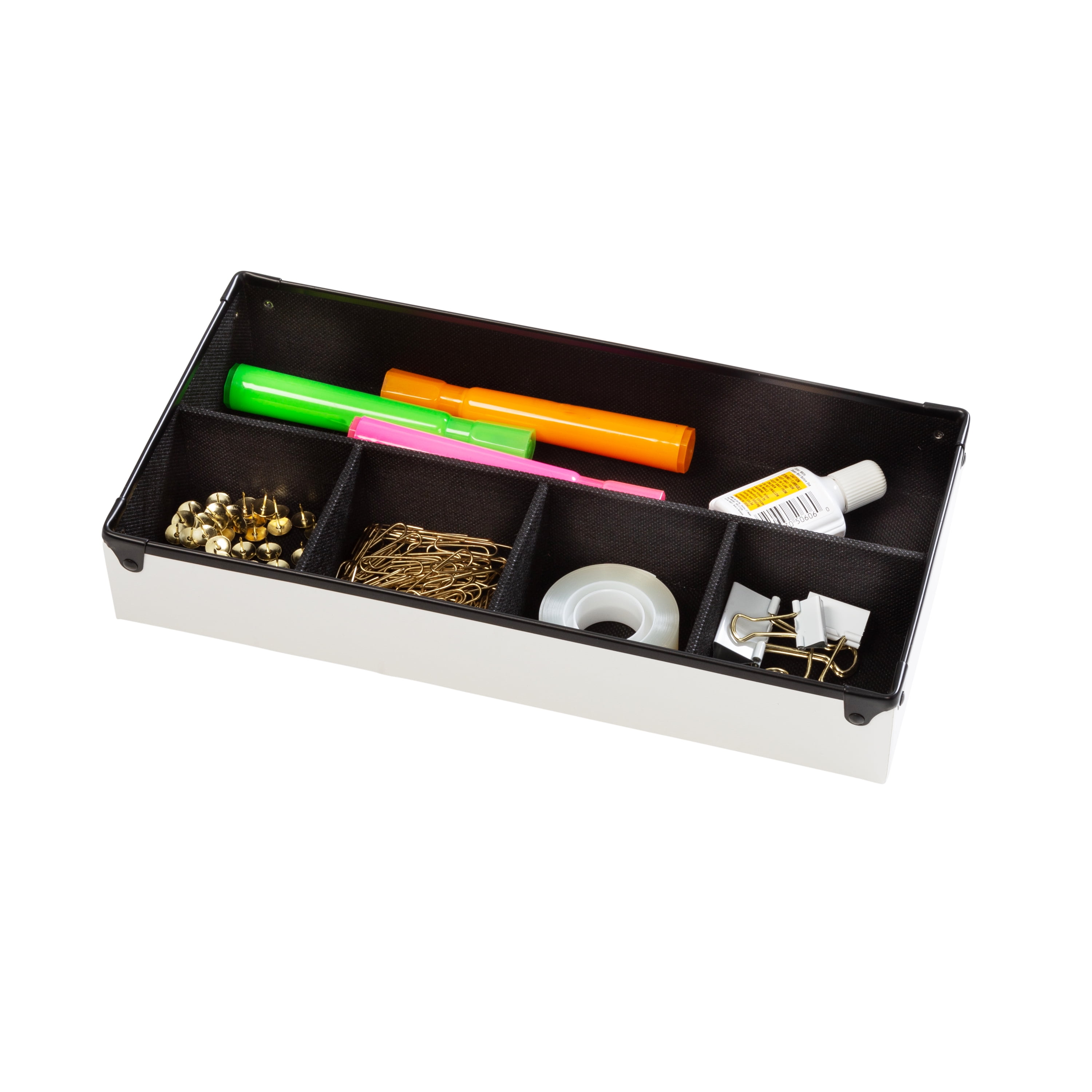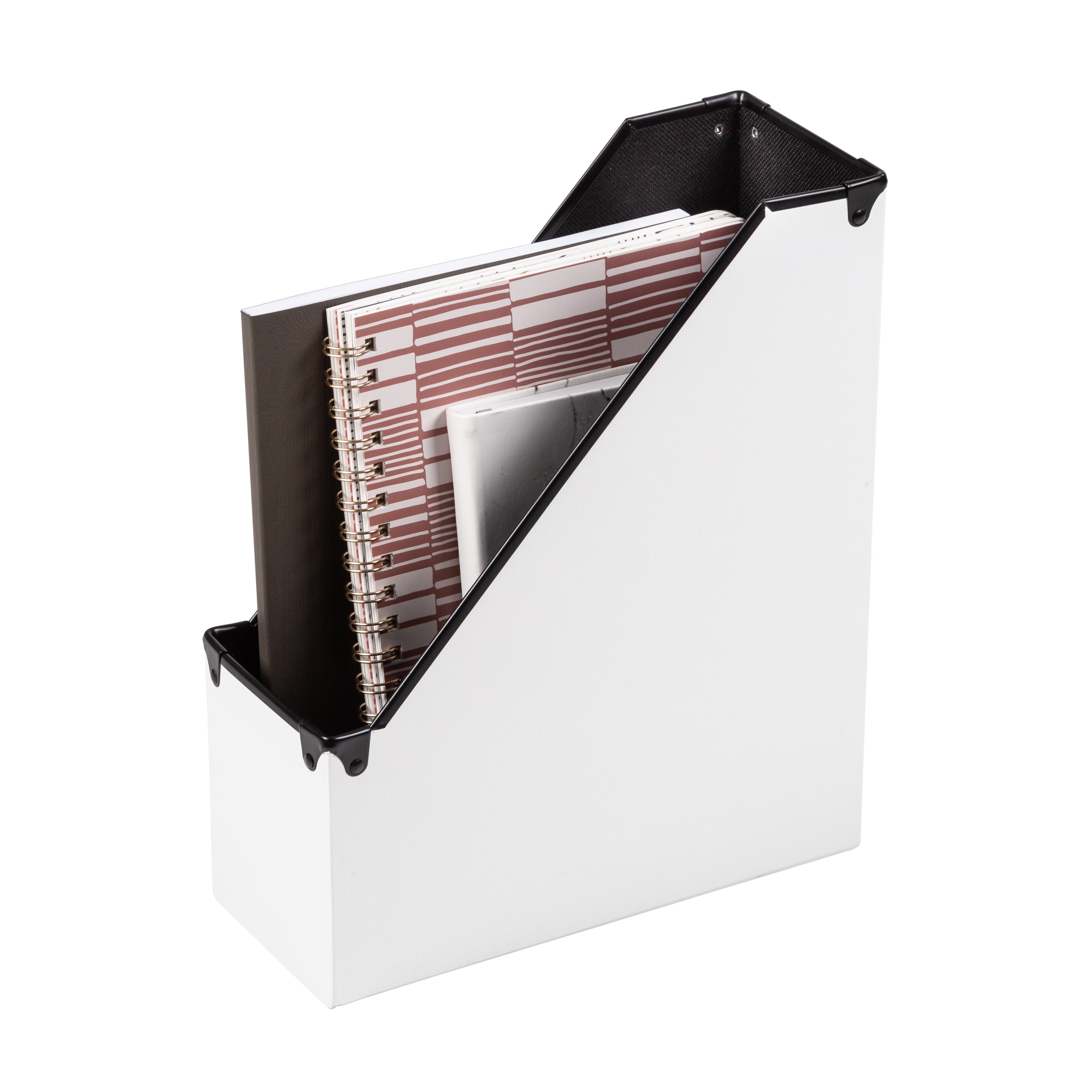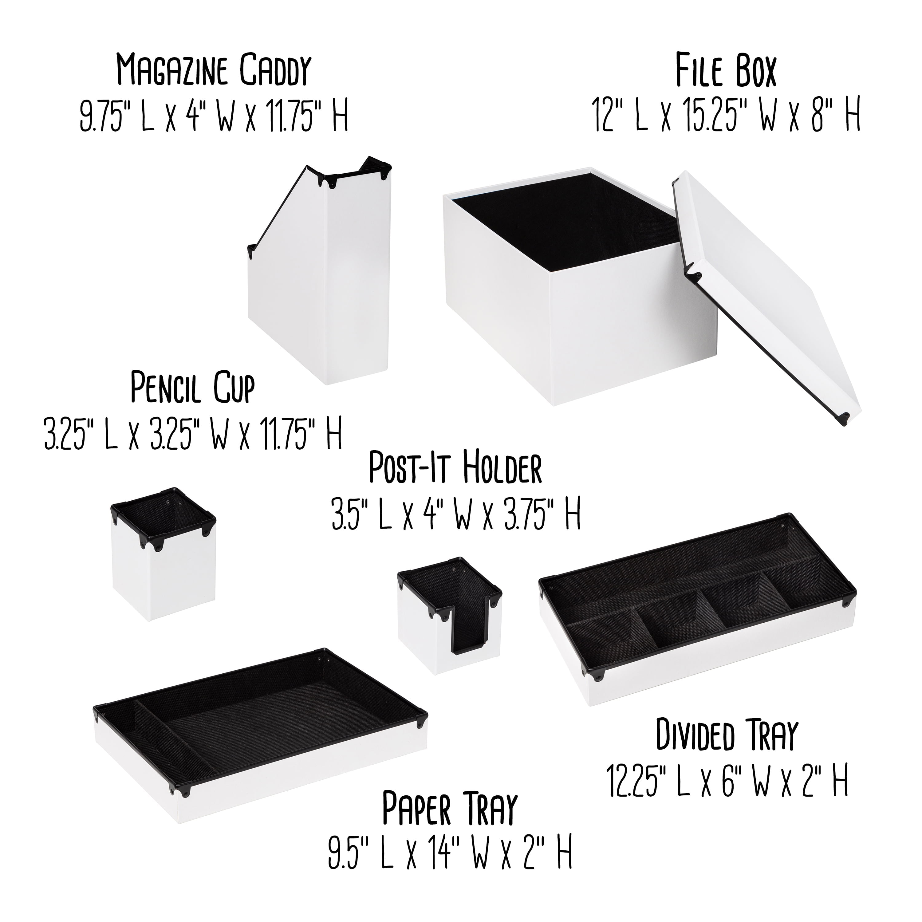 One-stop-shop for all your home office and desk organization Includes magazine caddy, pencil cup and divided tray, XL file box, post-it holder and paper tray Durable faux leather withstands scratches & scrapes Clean desktop look with white exterior with black interior Dimensions- Magazine Caddy: 9.75″L x 4″W x 11.75″H; Pencil Cup: 3.25″L x 3.25″W x 4″H; Divided Tray: 12.25″L x 6″W x 2″H; File Box: 12″L x 15″W x 8″H; Post-It Holder: 3.6″L x 4″W x 3.6″H; Paper Tray: 9.5″L x 14″W x 2″H OFC-09459