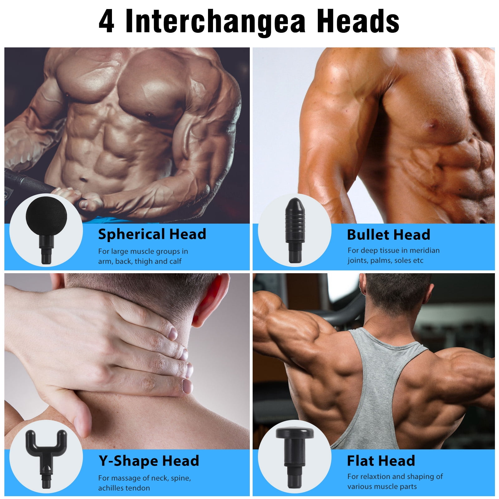 A percussion massager or massage gun is very useful for anyone who has sore muscles, muscle tension, or aches and pains because of muscle cramps or scar tissue. This percussion massager will shorten your recovery time while relieving some of the pain, tension and soreness that comes naturally from intense workouts. This percussion massage gun can be used to prevent fasciitis, reduce or eliminate pain and swelling, restore elasticity to muscles, increase range of motion, and also increase blood flow. The massage gun comes equipped with 4 different shaped massage heads that are targeted for different parts of the body. Allowing you to be able to use the deep tissue muscle massager anytime and anywhere without bothering others. This is the perfect item for athletes, fitness enthusiasts, and those with back problems for daily relief and therapy.
