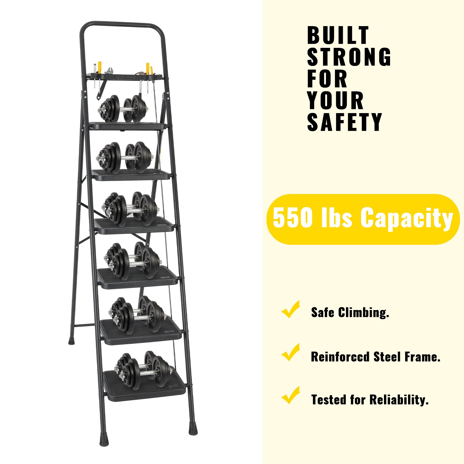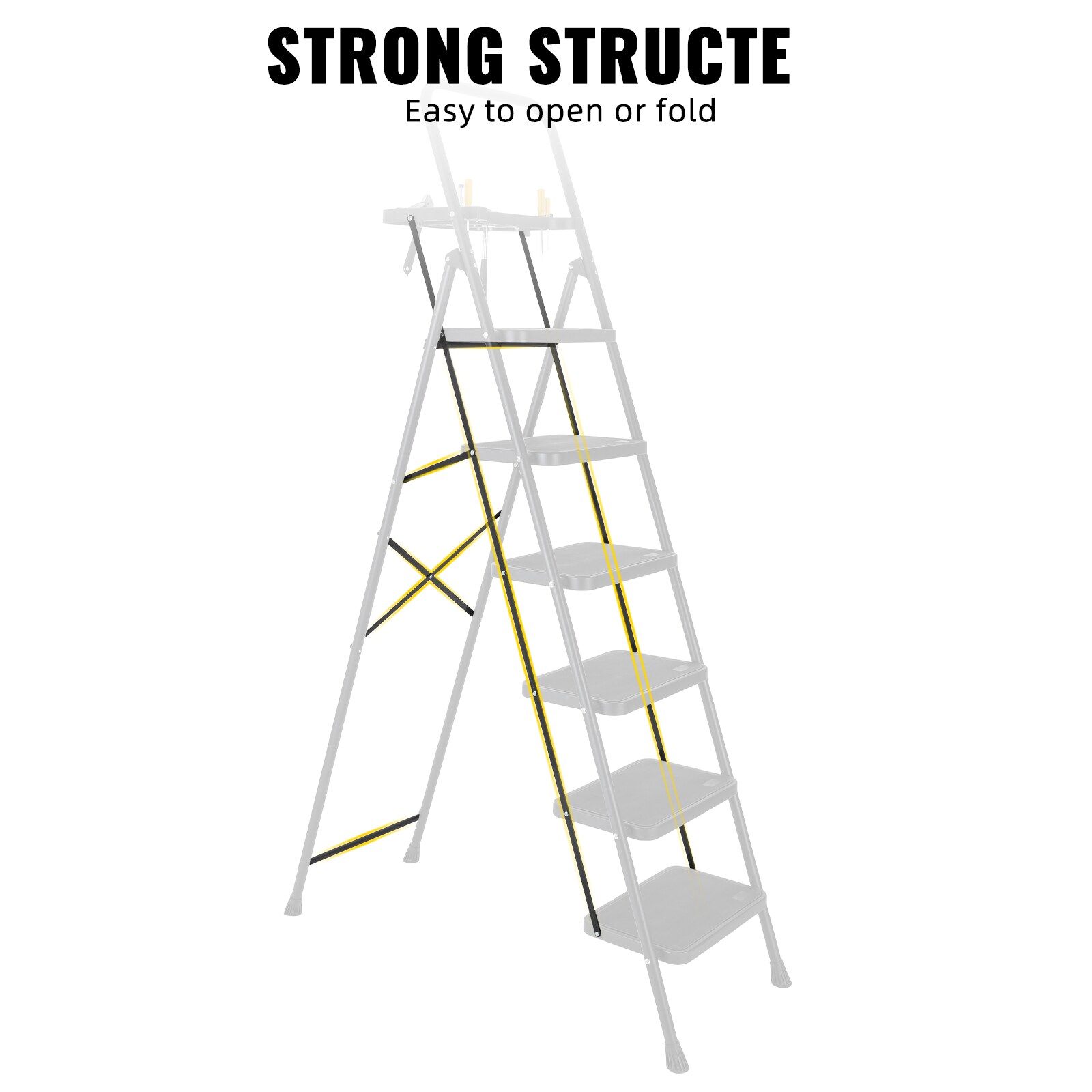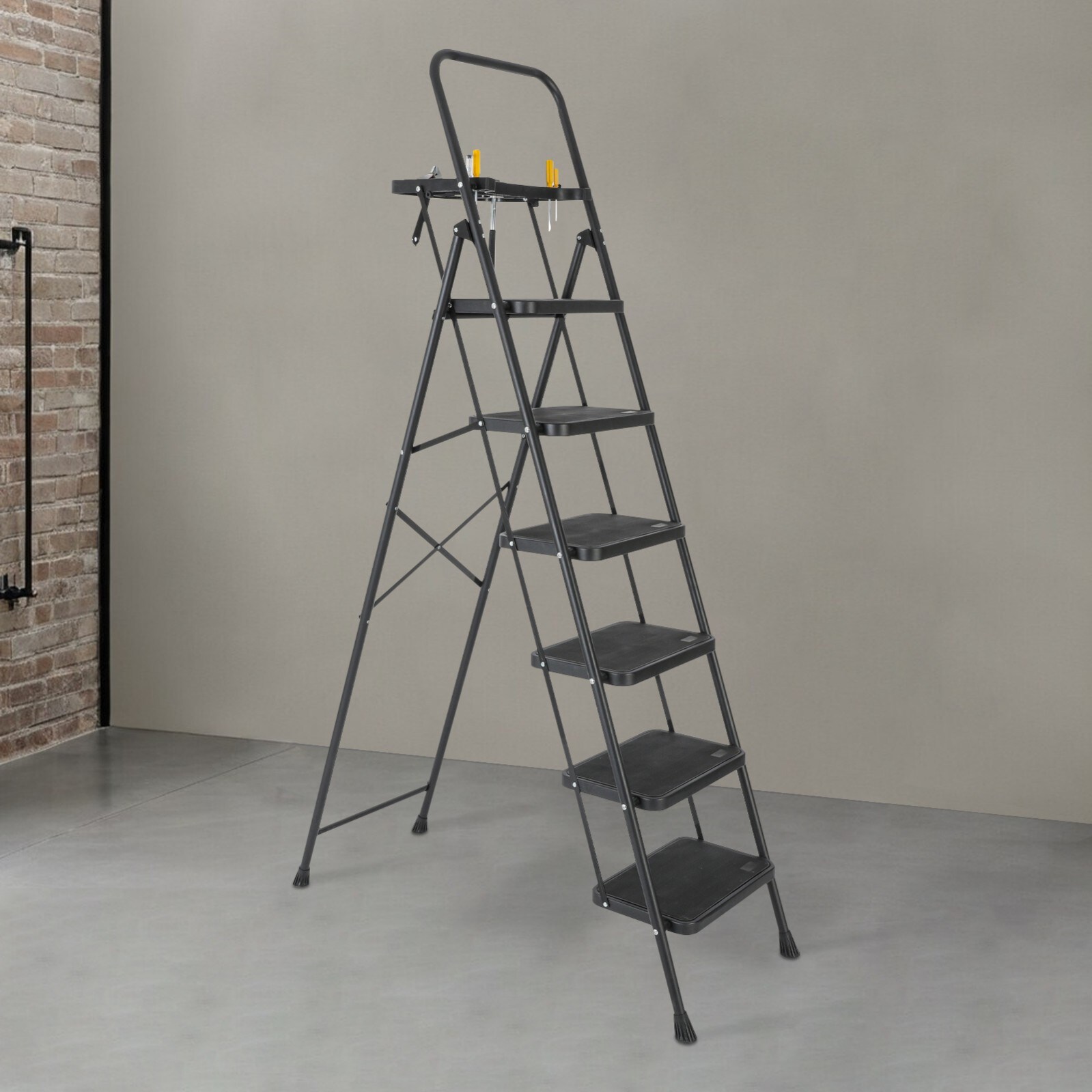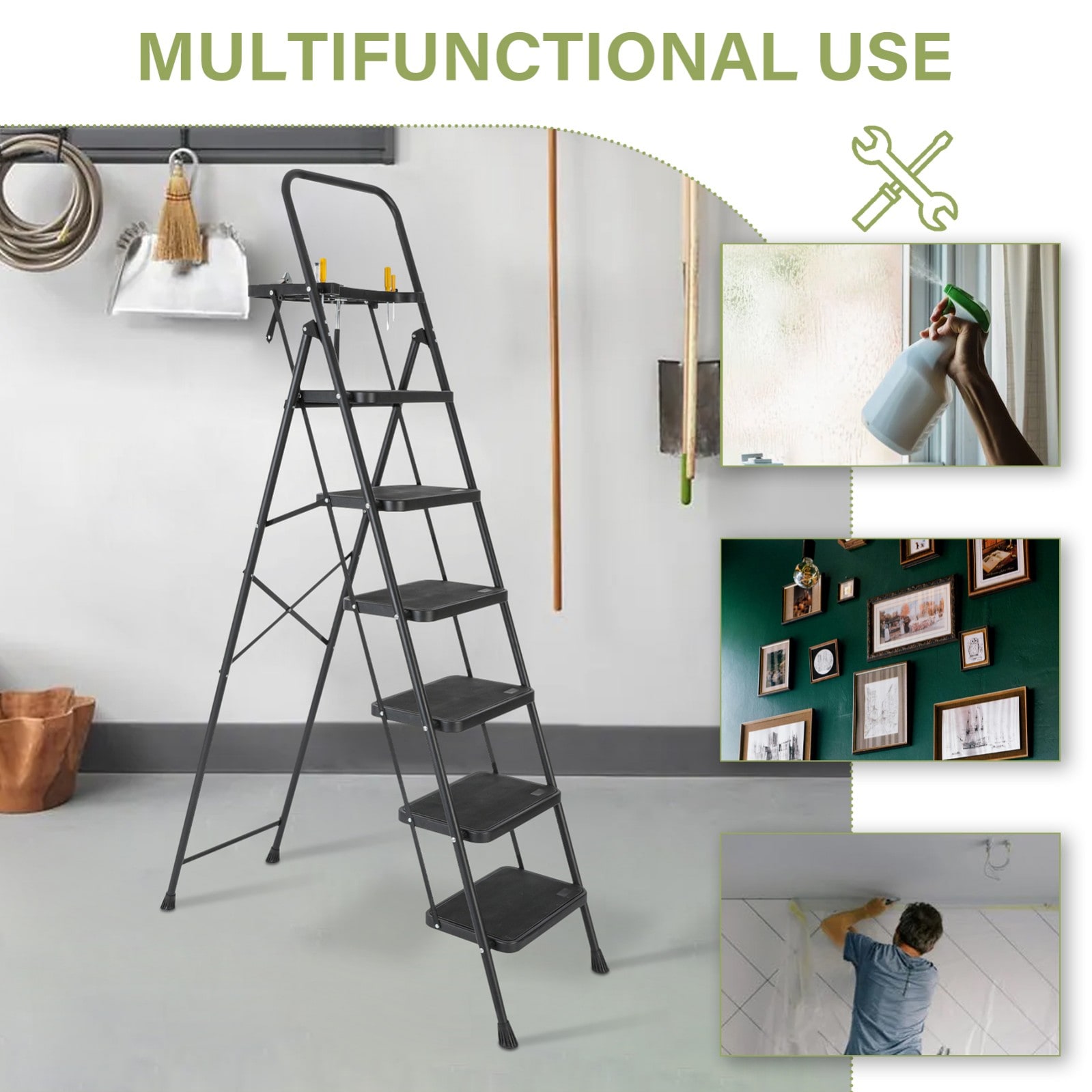 Looking for a ladder that combines convenience, safety, and versatility? Look no further than our 6-step folding ladder! With its built-in tool tray, you can work more efficiently, storing all your essentials at hand. The space-saving, foldable design makes it easy to store, whether at home, in the office, or the garage. The non-slip pedals and reinforced bracket ensure stability, while the safety lock mechanism provides peace of mind. Lightweight and portable, it can be easily moved around. Suitable for various tasks, it’s the perfect choice for both home and professional use. And with its quick lock system and sturdy steel frame that can hold up to 550 pounds, it’s a reliable investment. Get yours today!
