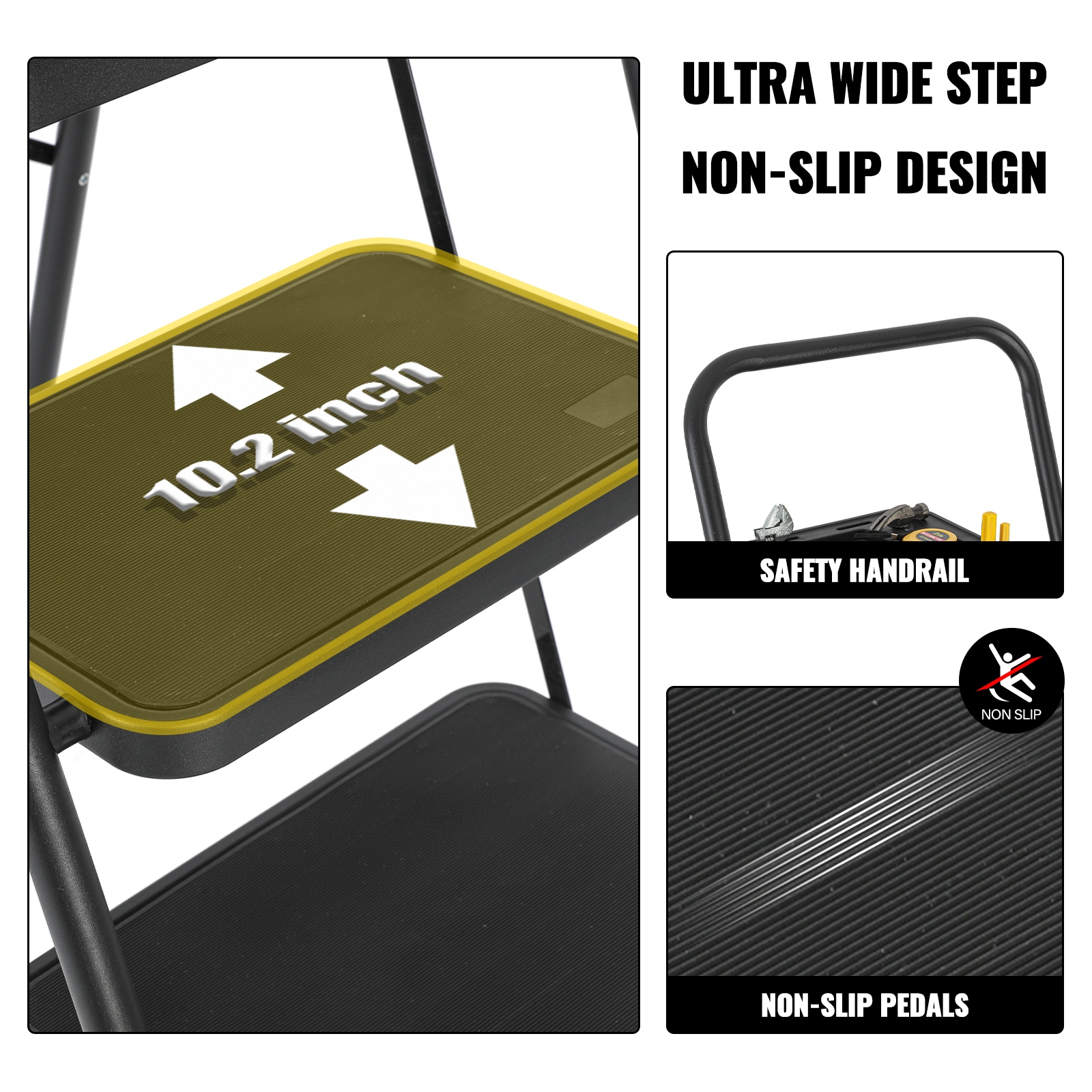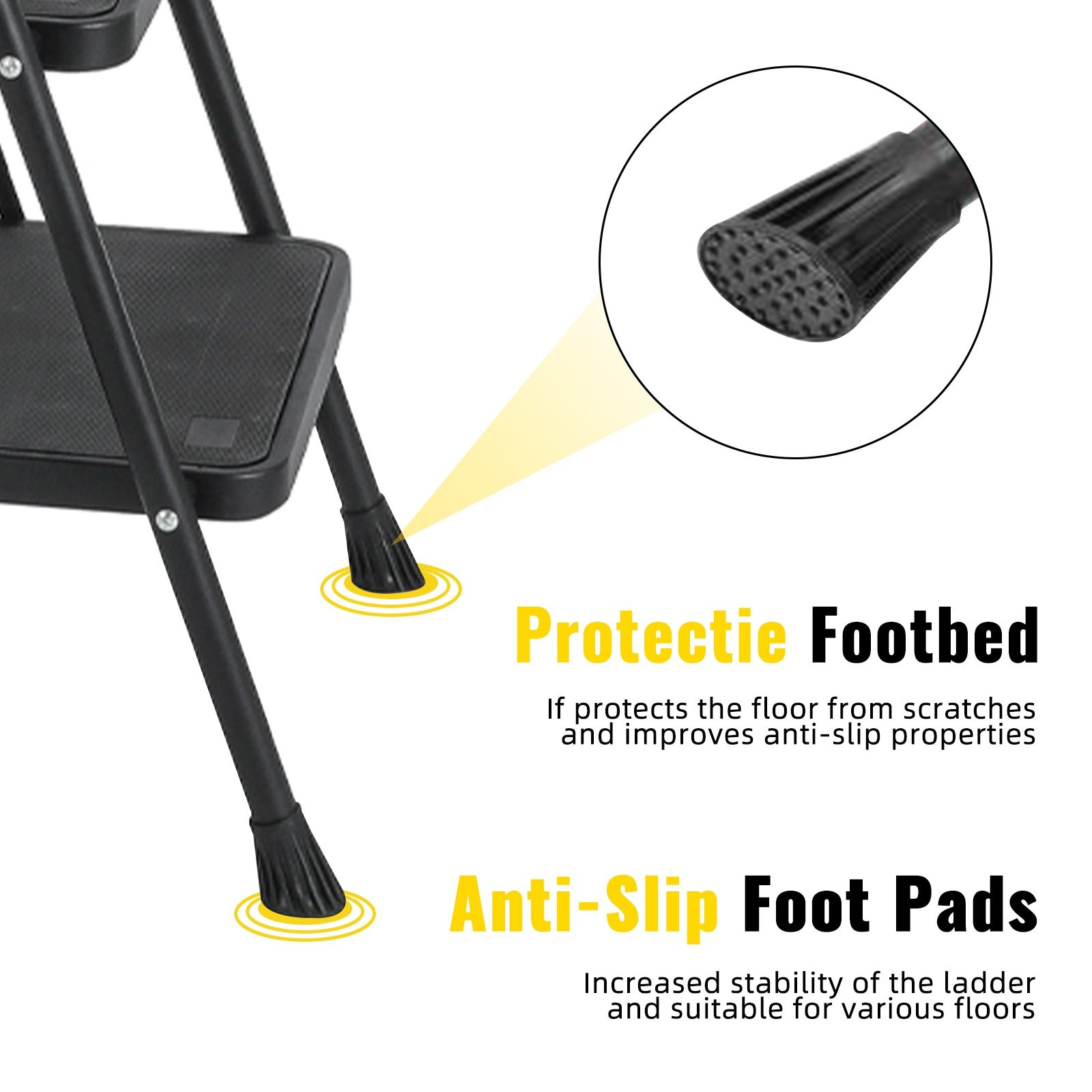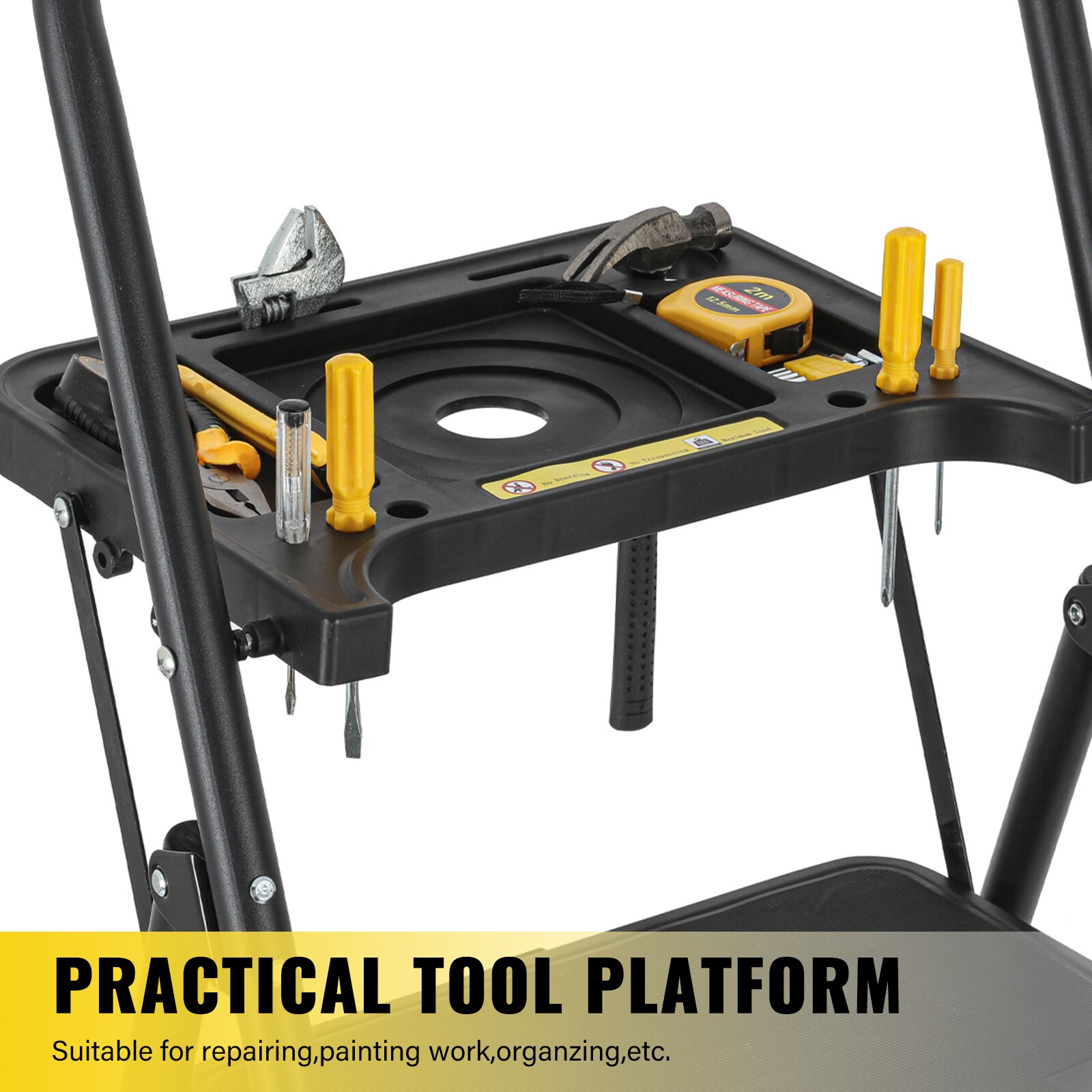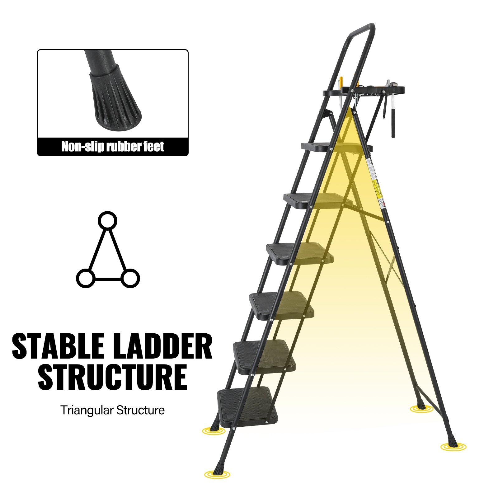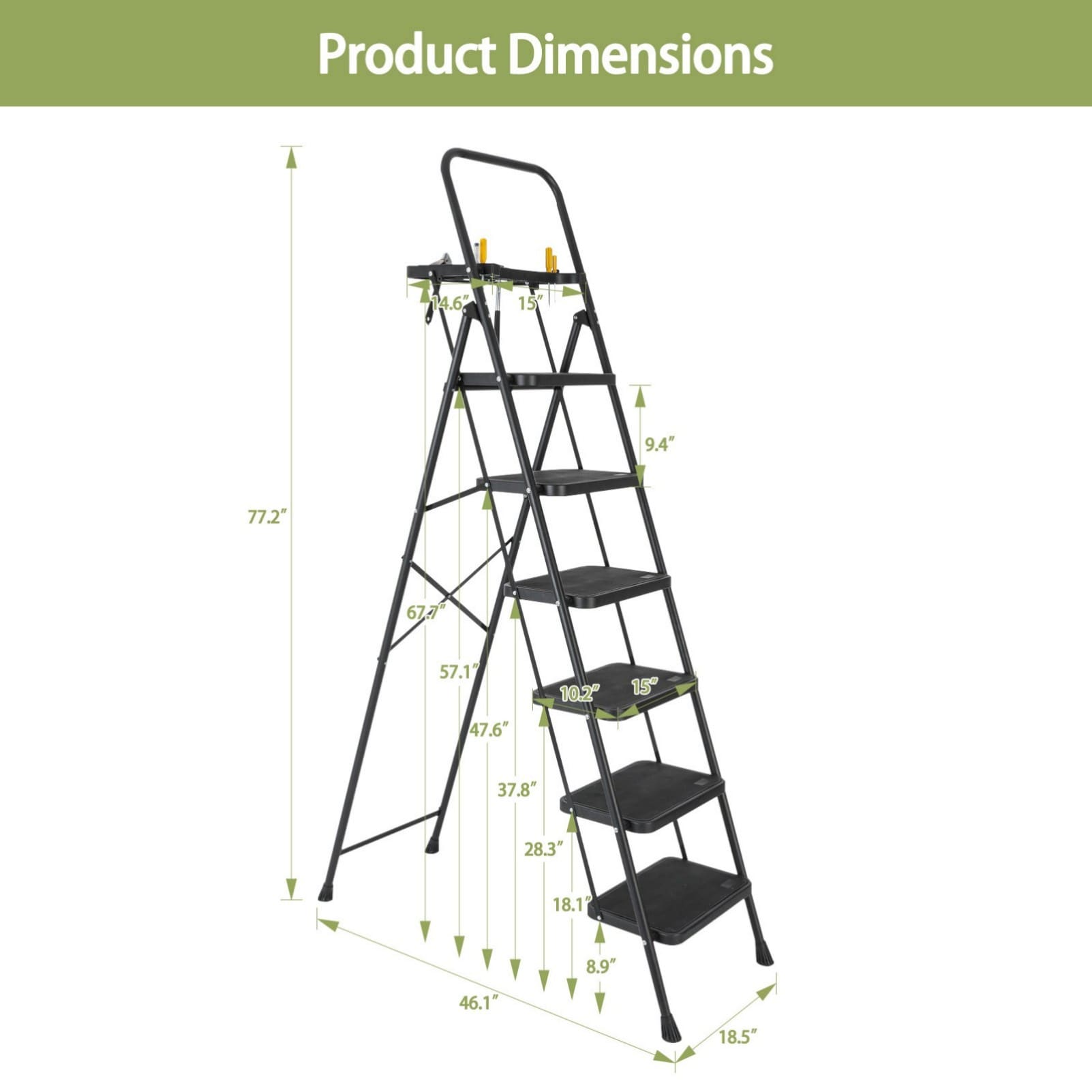 Looking for a ladder that combines convenience, safety, and versatility? Look no further than our 6-step folding ladder! With its built-in tool tray, you can work more efficiently, storing all your essentials at hand. The space-saving, foldable design makes it easy to store, whether at home, in the office, or the garage. The non-slip pedals and reinforced bracket ensure stability, while the safety lock mechanism provides peace of mind. Lightweight and portable, it can be easily moved around. Suitable for various tasks, it’s the perfect choice for both home and professional use. And with its quick lock system and sturdy steel frame that can hold up to 550 pounds, it’s a reliable investment. Get yours today!