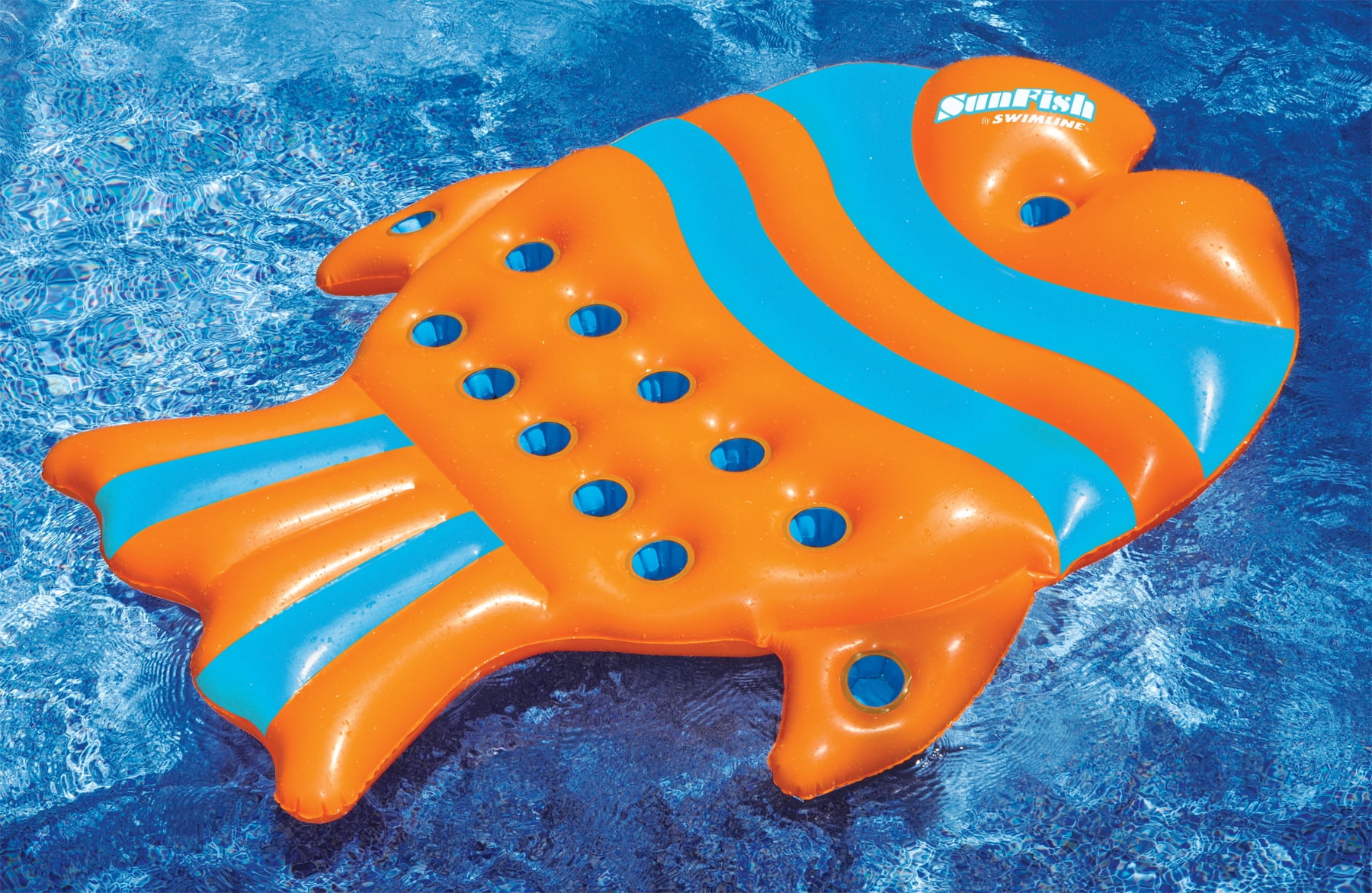 This floating raft will give a whole new meaning to swimming with the fishes. This float is an orange and blue sunfish with a striped design and a 10-French pocket hole pattern on by the tail the best part is that this raft if for more than one person. It looks great in the pool and is fun to ride on while you conversate with friends and family! This fun inflatable will bring joy to everyone from the young to the young at heart. Features: Orange and blue swimming pool inflatable raft The raft is a replica shaped like a sunfish with a striped design Features one eye smiling mouth two fins and one tail Inflatable has a 10-French pocket pattern on the end of the raft There are three beverage holders one each corner Reads “SunFish” & “Swimline” This raft is constructed of heavy duty vinyl Not intended for children under 4 years old Dimensions: 0.5″H x 50″W x 60.5″D (deflated) Material(s): vinyl Note: Ships flat and does not come inflated