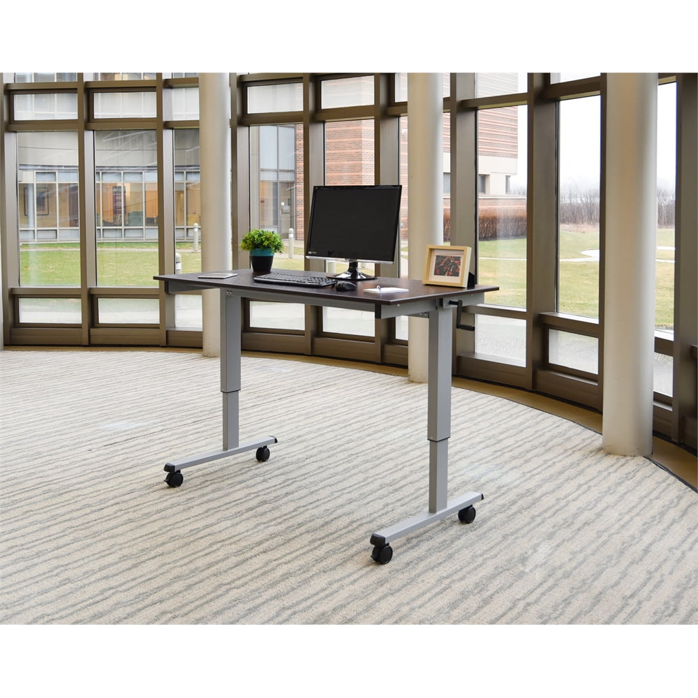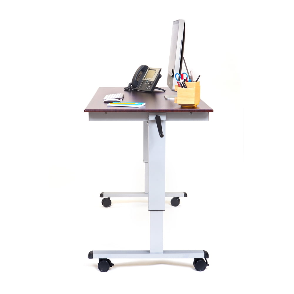 60″ High Speed Crank Adjustable Desk – Silver, Dark Walnut The Luxor high speed crank adjustable standing desk gives users the ability to find that ergonomic balance between sitting and standing throughout the workday. Now available with a high-speed crank operated lift mechanism, the turn-handle crank quickly moves the desk from the lowest to highest positions within seconds without requiring electric power. The generous 59″x 29.5″work surface easily fits dual monitors plus a full-sized keyboard and mouse while the height adjustment range accommodates taller and shorter users. Each desk includes a choice of leveling glides as well as 3″casters, two with locking brakes, allowing for easy maneuverability to suit ever-changing workspace needs. Enjoy the health benefits of standing while increasing focus and productivity with a high-speed crank adjustable desk from Luxor. High speed crank allows for rapid adjustment from sitting to standing. Crank handle quickly raises the desk height between 32.6″and 48.5″(with casters). Crank handle quickly raises the desk height between 29.6″and 45.5″(with glides). Spacious 59″x 29.5″desktop provides plenty of room for multiple monitors. Melamine top with dark walnut finish. Durable steel frame with silver powder coat painted finish. Includes choice of leveling glides and 3″ casters, two with locking brake. Includes all hardware and tools required for assembly. Lift Capacity: 154 lbs. Glides: Furniture Glides. Casters: 3″ Casters. Crank Type/Mechanism: High Speed Crank. Crank Speed: ~33 cranks from low to high. Speed: 1.2″per second. Actual Weight: 85 lbs. Desktop Color: Dark Walnut. Frame Color: Silver. Table Material: Melamine with PDF/PVC edge film. Frame: Powder-Coated Steel. Overall Dimensions with casters: 59″W x 29.5″D x 32.6″ to 48.5″H, Adjustable Height Range: Between 26″-51.6″H Anti-collision Technology: Yes. Stage of Each Leg: 3 Stage. Max. Weight Capacity: 154 lbs. Meets ANSI/BIFMA standards. Overall Dimensions with glides: 59″W x 29.5″D x 29.6″to 45.5″H, Table Dimensions 59″W x 29.5″D x 0.625″H