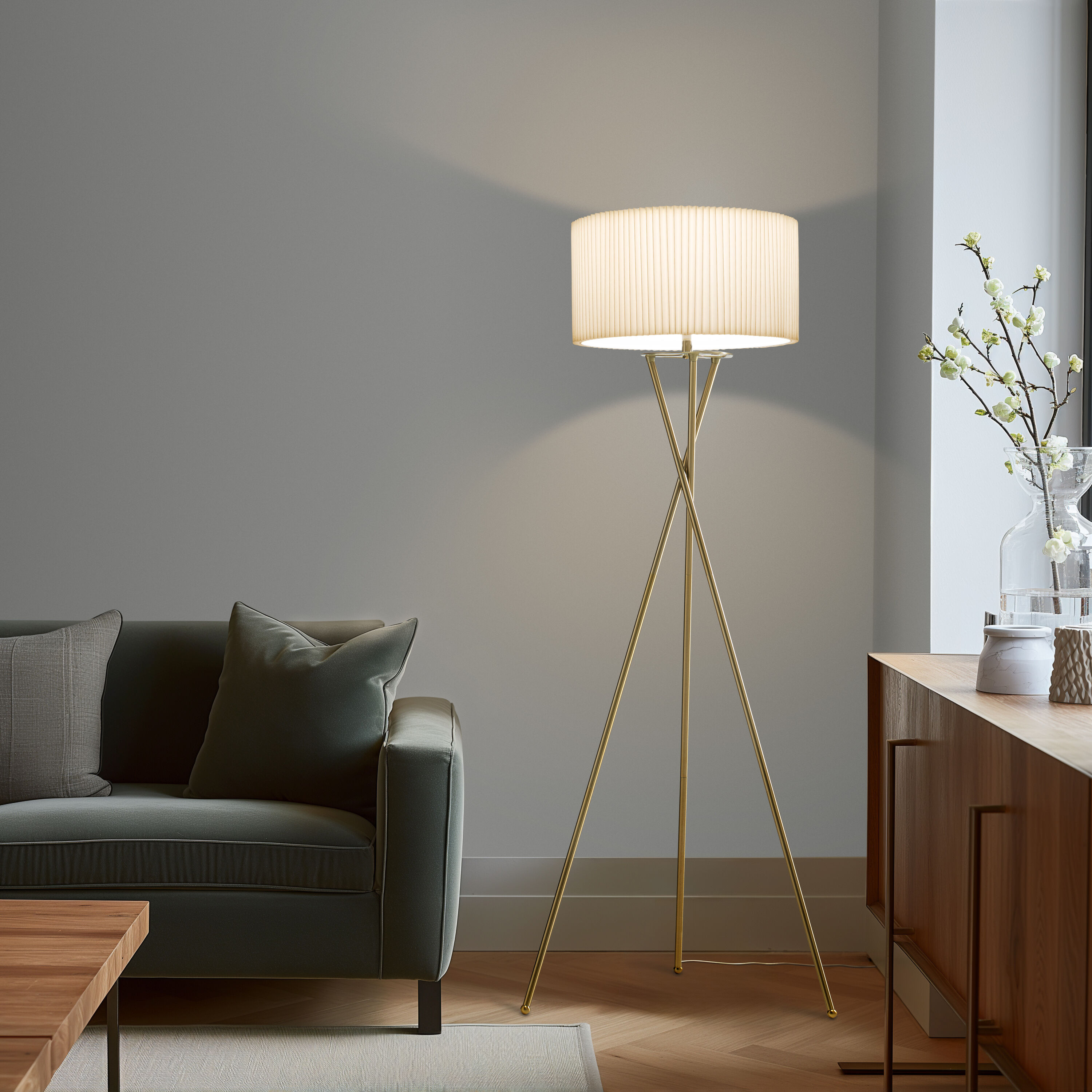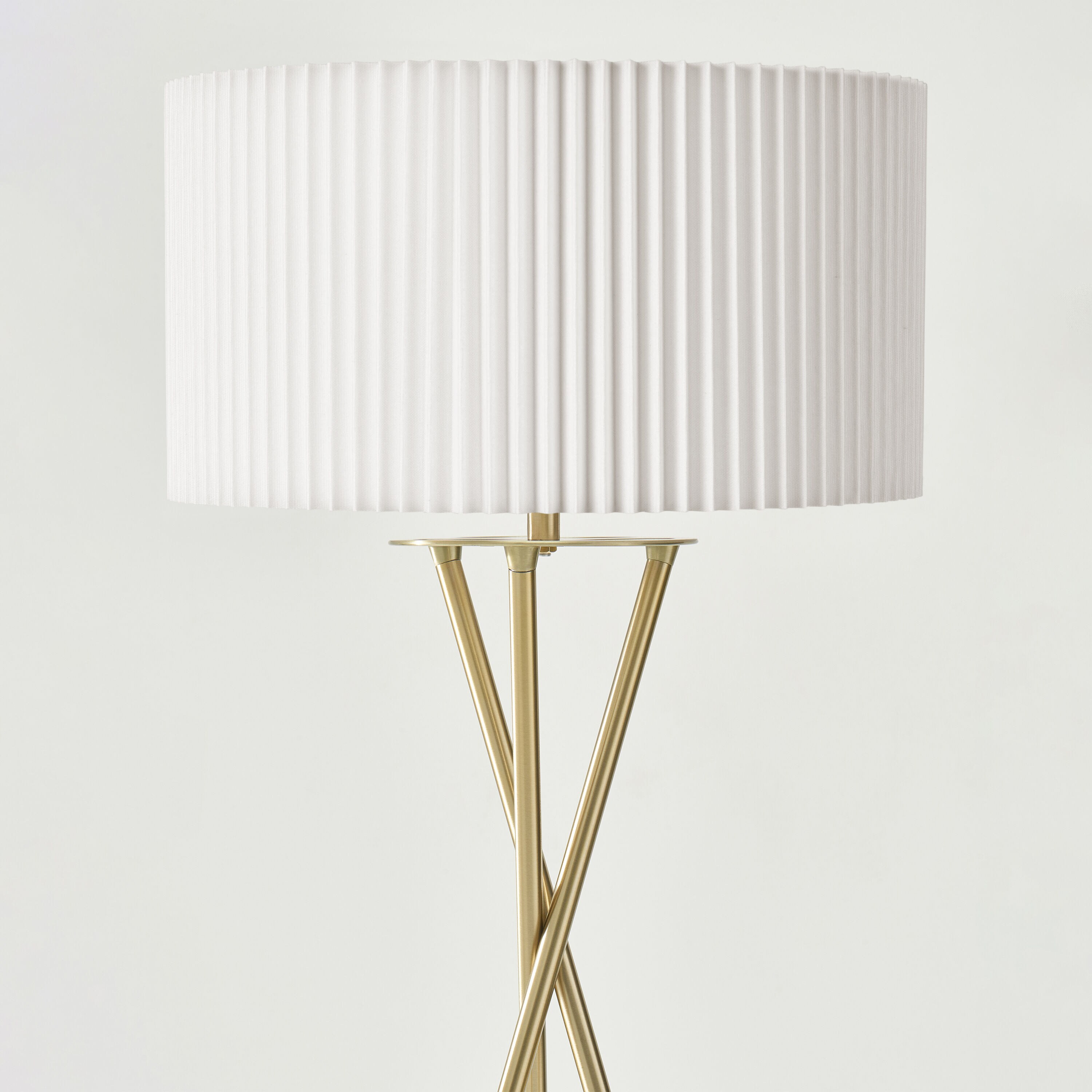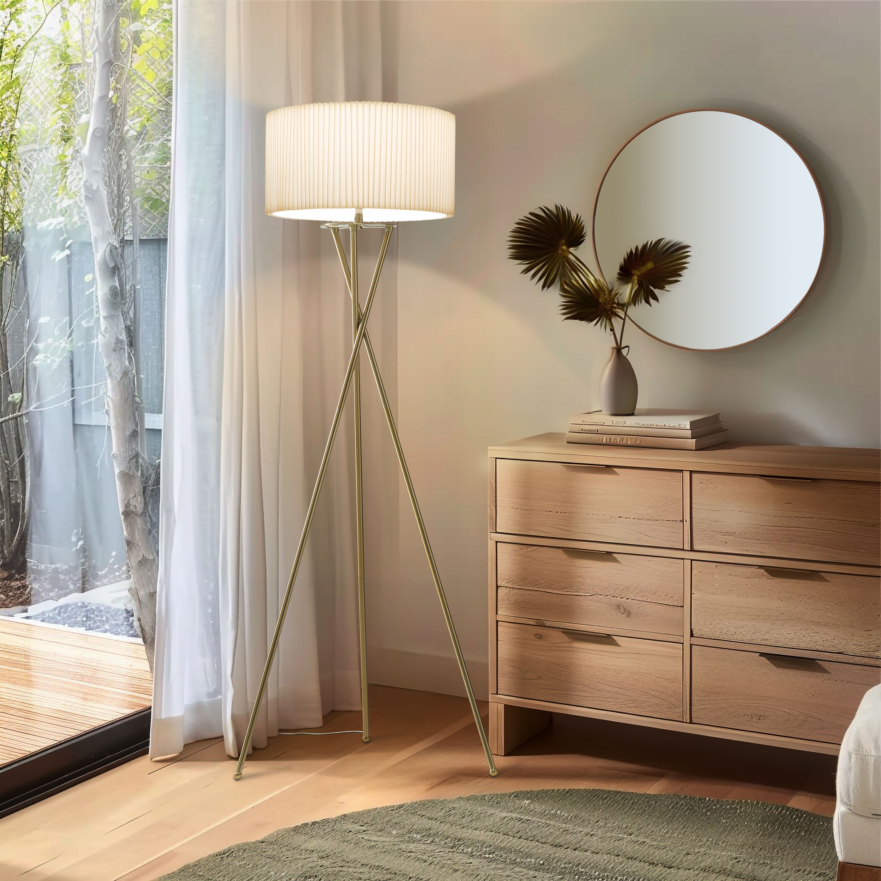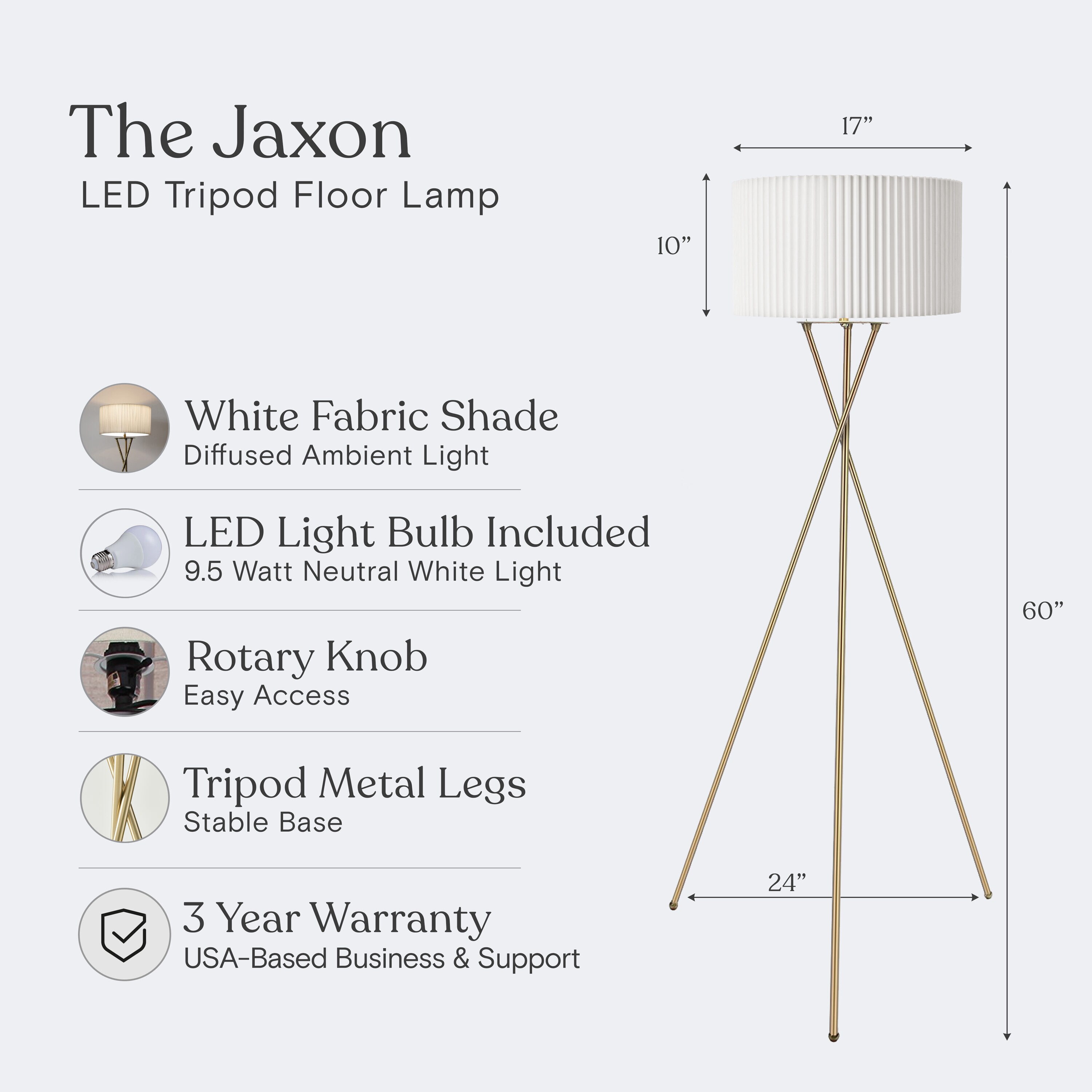 Step into a world where classic design meets contemporary efficiency with the Jaxon LED Tripod Floor Lamp from Brightech. This floor lamp’s minimalist aesthetic, featuring three slender, independent metal rods that intersect gracefully, is a nod to mid-century modern style. The rods rise from a tripod arrangement into a stunning white pleated fabric shade, which softens and diffuses the light to cast a warm, inviting glow in your living room, study, or bedroom. The included 9.5-Watt LightPro LED bulb provides an energy-saving glow of 800 Lumens at a cozy 3000 Kelvin color temperature, creating the perfect ambiance for any setting. Get the high-end designer atmosphere without the high-end cost with Brightech’s Jaxon LED Tripod Floor Lamp, backed by the promise of quality and longevity with our 3 year warranty.