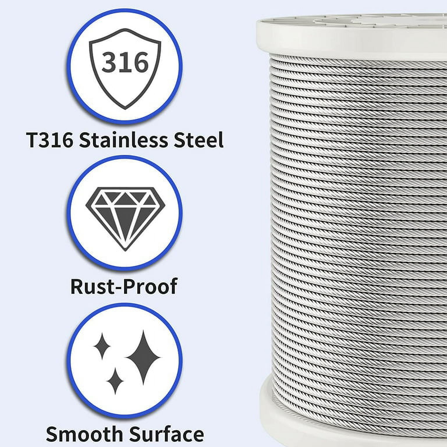 600ft 1/8 inch Stainless Steel Cable, T316 Deck Aircraft Cable Railing, Premium 7×7 Strands Wire Rope for Deck, Rail, Balusters, Stair, Handrail, Porch and Fence