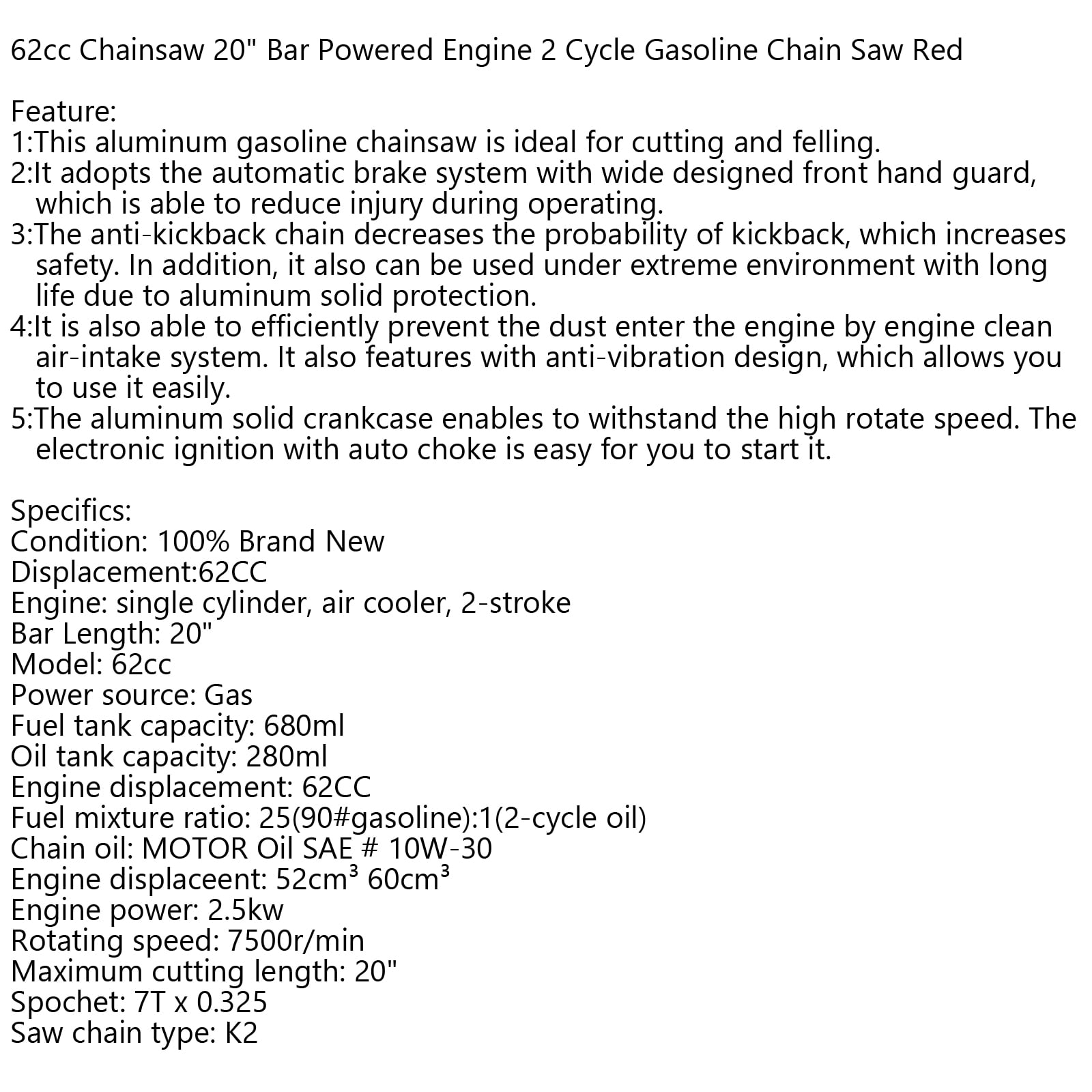 62cc Chainsaw 20″ Bar Powered Engine 2 Cycle Gasoline Chain Saw Red Feature: 1:This aluminum gasoline chainsaw is ideal for cutting and felling. 2:It adopts the automatic brake system with wide designed front hand guard, which is able to reduce injury during operating. 3:The anti-kickback chain decreases the probability of kickback, which increases safety. In addition, it also can be used under extreme environment with long life due to aluminum solid protection. 4:It is also able to efficiently prevent the dust enter the engine by engine clean air-intake system. It also features with anti-vibration design, which allows you to use it easily. 5:The aluminum solid crankcase enables to withstand the high rotate speed. The electronic ignition with auto choke is easy for you to start it. Specifics: Condition: 100% Brand New Displacement:62CC Engine: single cylinder, air cooler, 2-stroke Bar Length: 20″ Model: 62cc Power source: Gas Fuel tank capacity: 680ml Oil tank capacity: 280ml Engine displacement: 62CC Fuel mixture ratio: 25(90#gasoline):1(2-cycle oil) Chain oil: MOTOR Oil SAE # 10W-30 Engine displaceent: 52cm³ 60cm³ Engine power: 2.5kw Rotating speed: 7500r/min Maximum cutting length: 20″ Spochet: 7T x 0.325 Saw chain type: K2 Package Included: 1x Chainsaw set Note: Long time use is easy to get hot and burn the side board of the chain saw. It is suitable for general garden pruning. Please Do not use for professional logging. 1