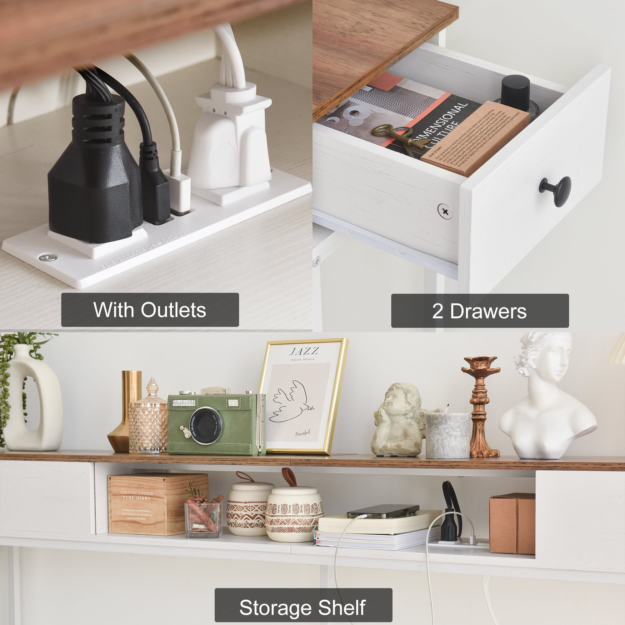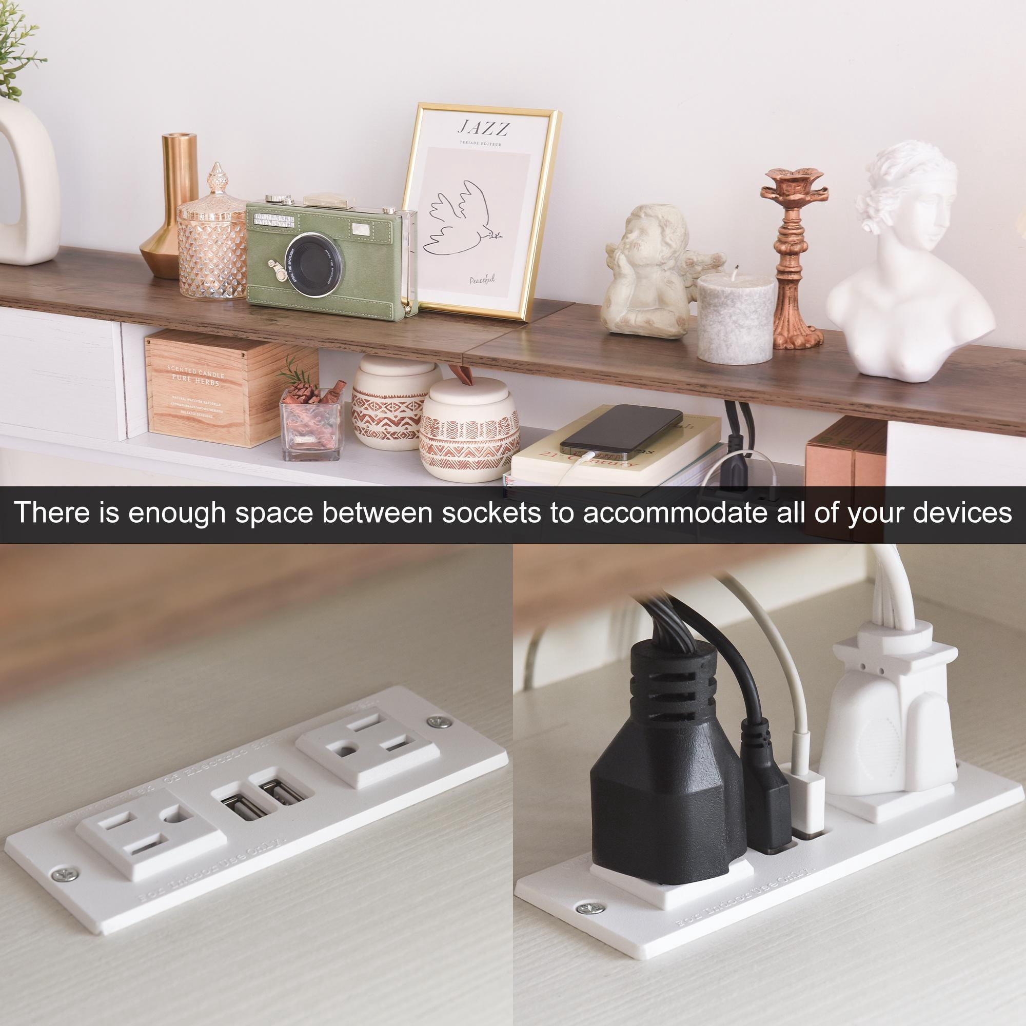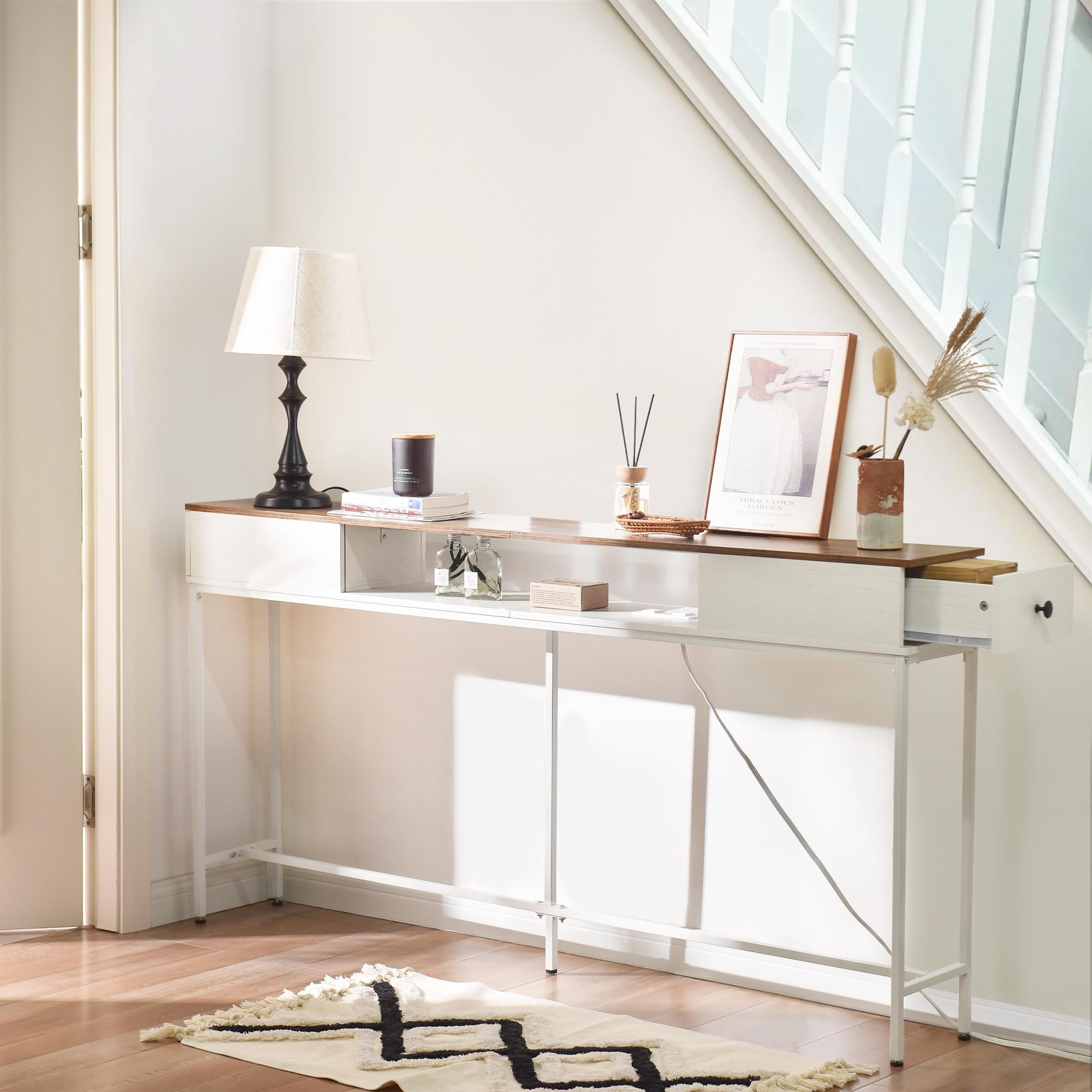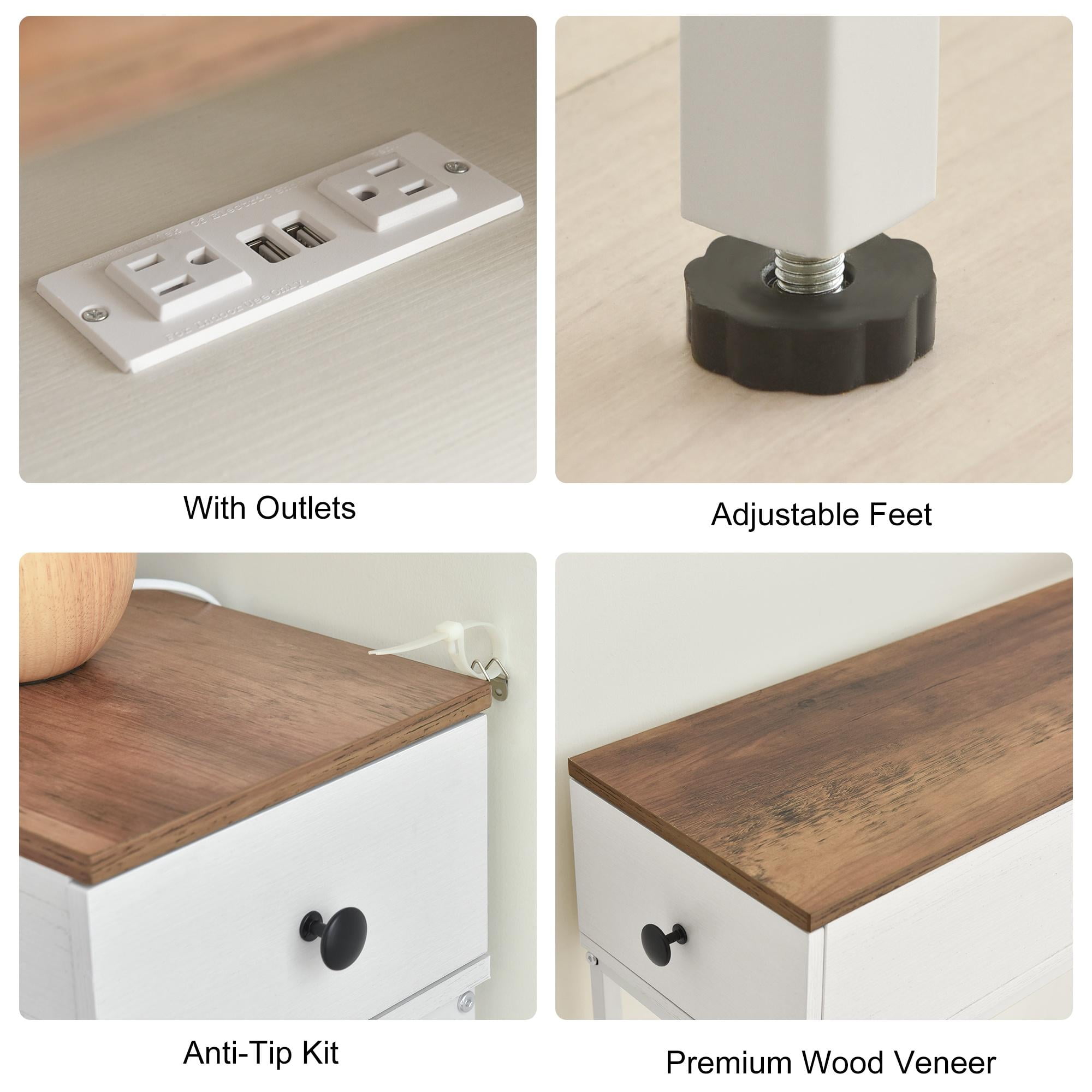 Elongated and narrow construction Adjustable feet and anti-tip kit to keep the table balanced Two drawers for storing things like keys, notepads, and jewelry The outlet fits 2 bulky plugs and 2 USB plugs without blocking each other