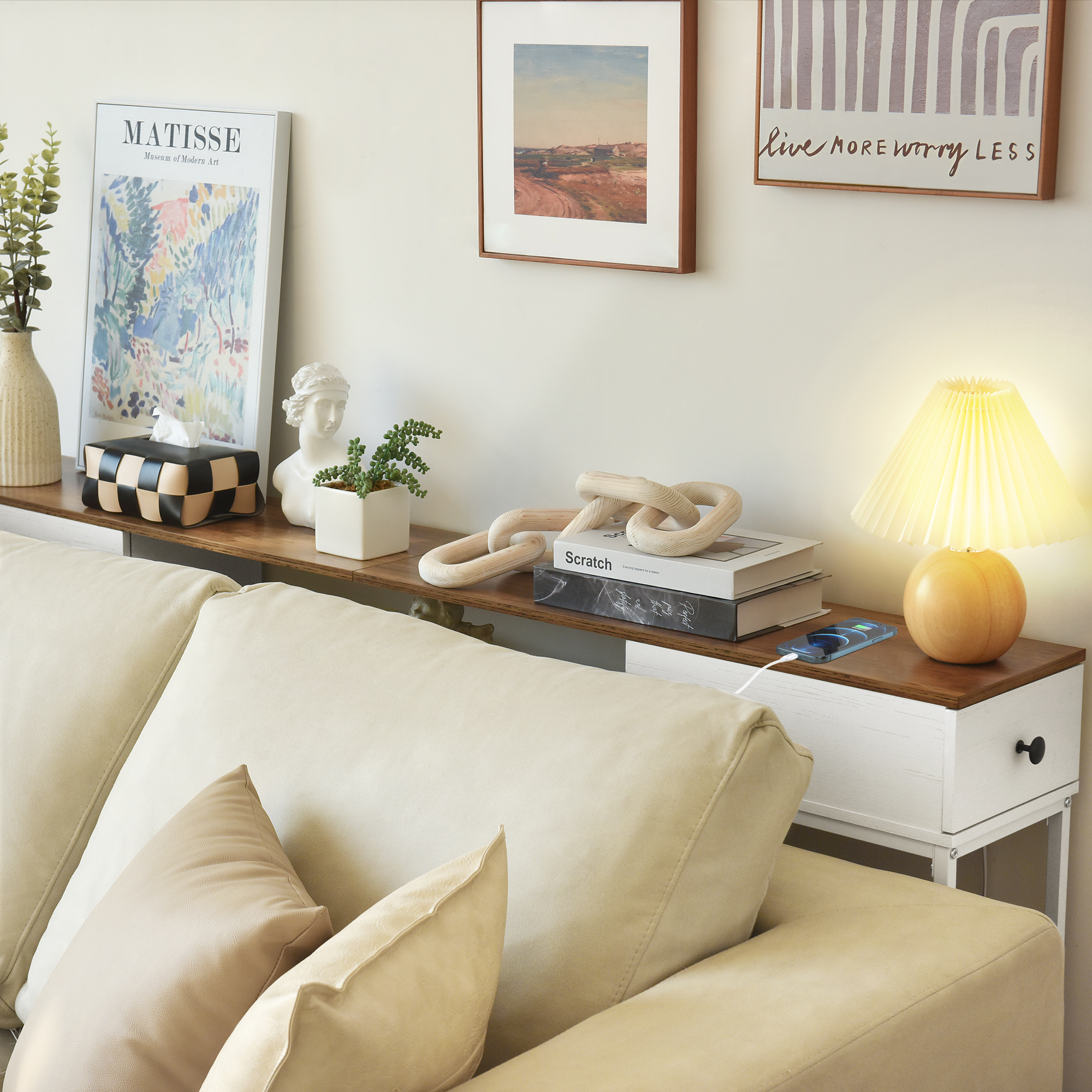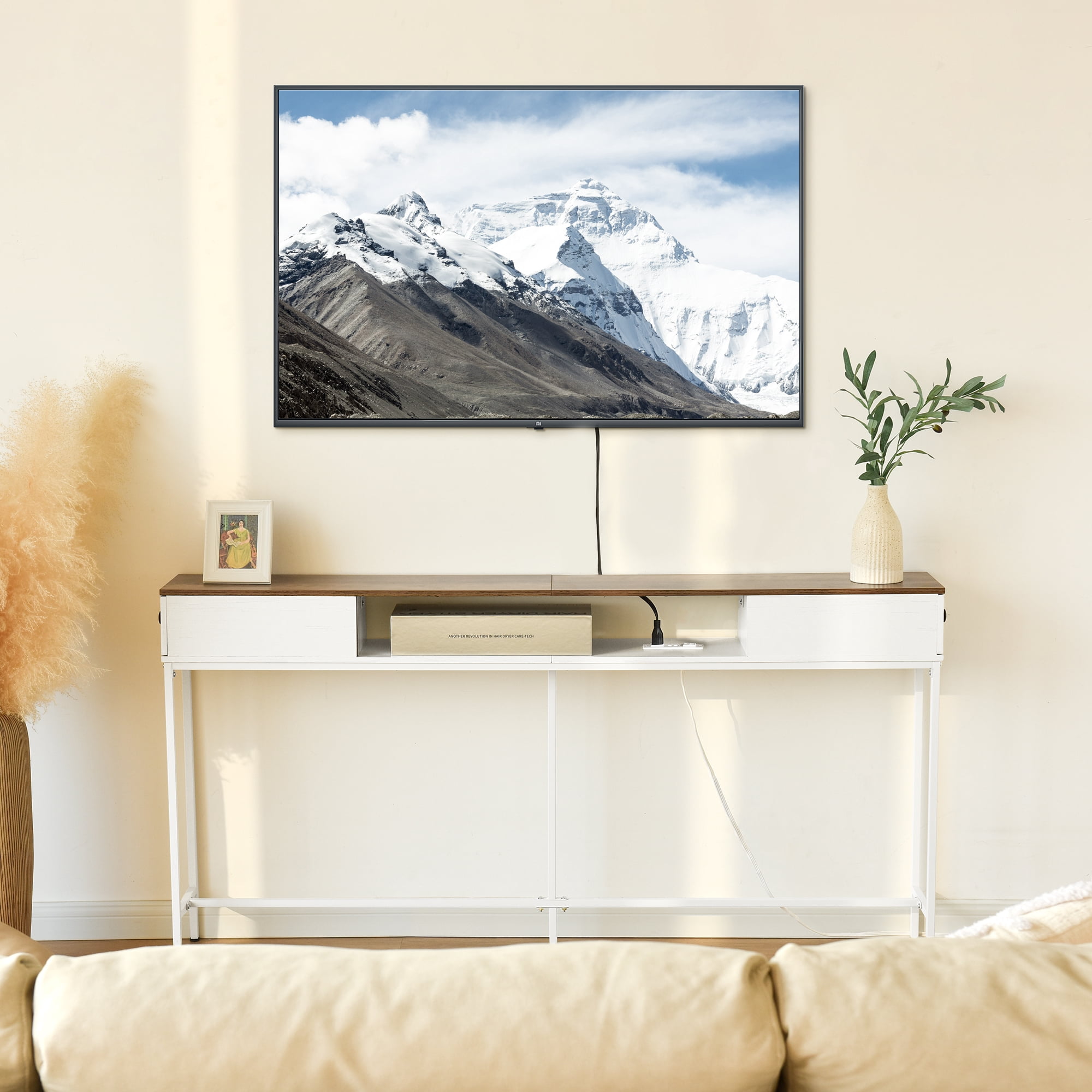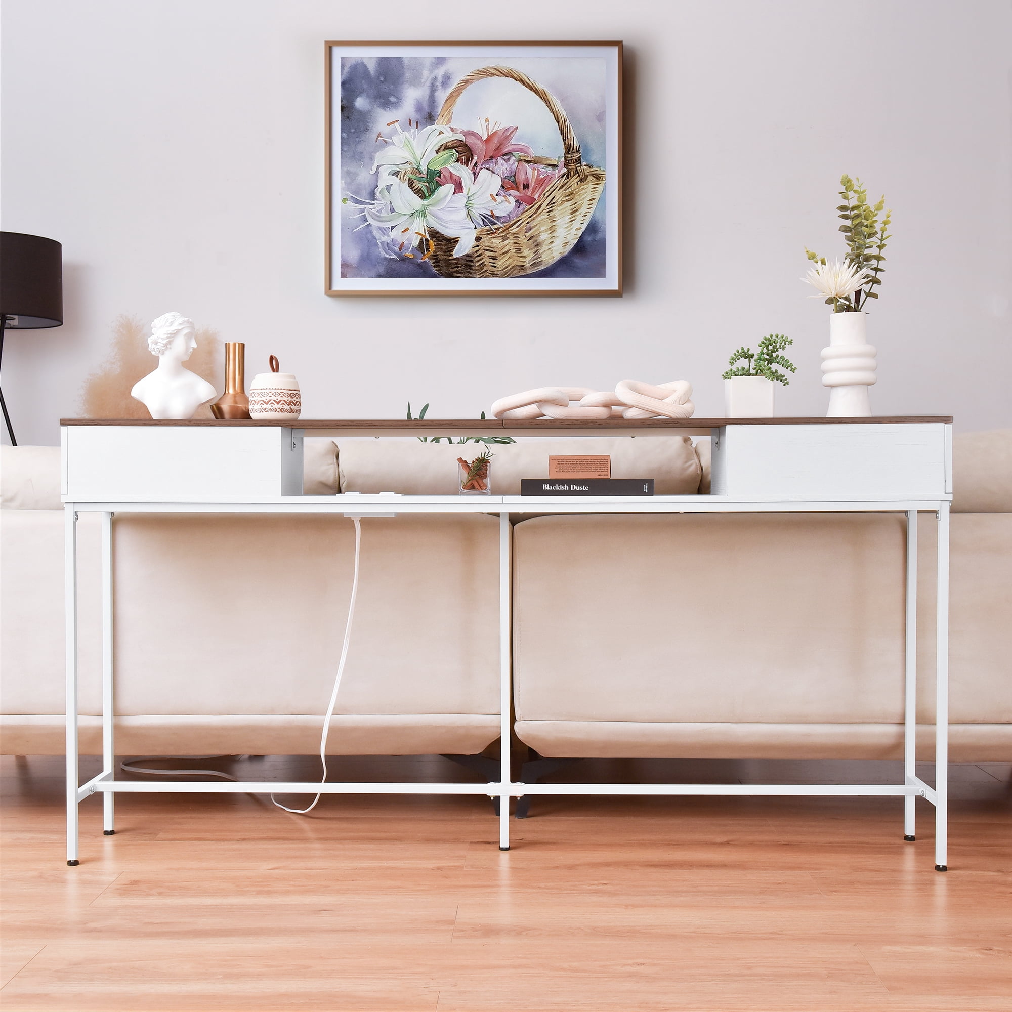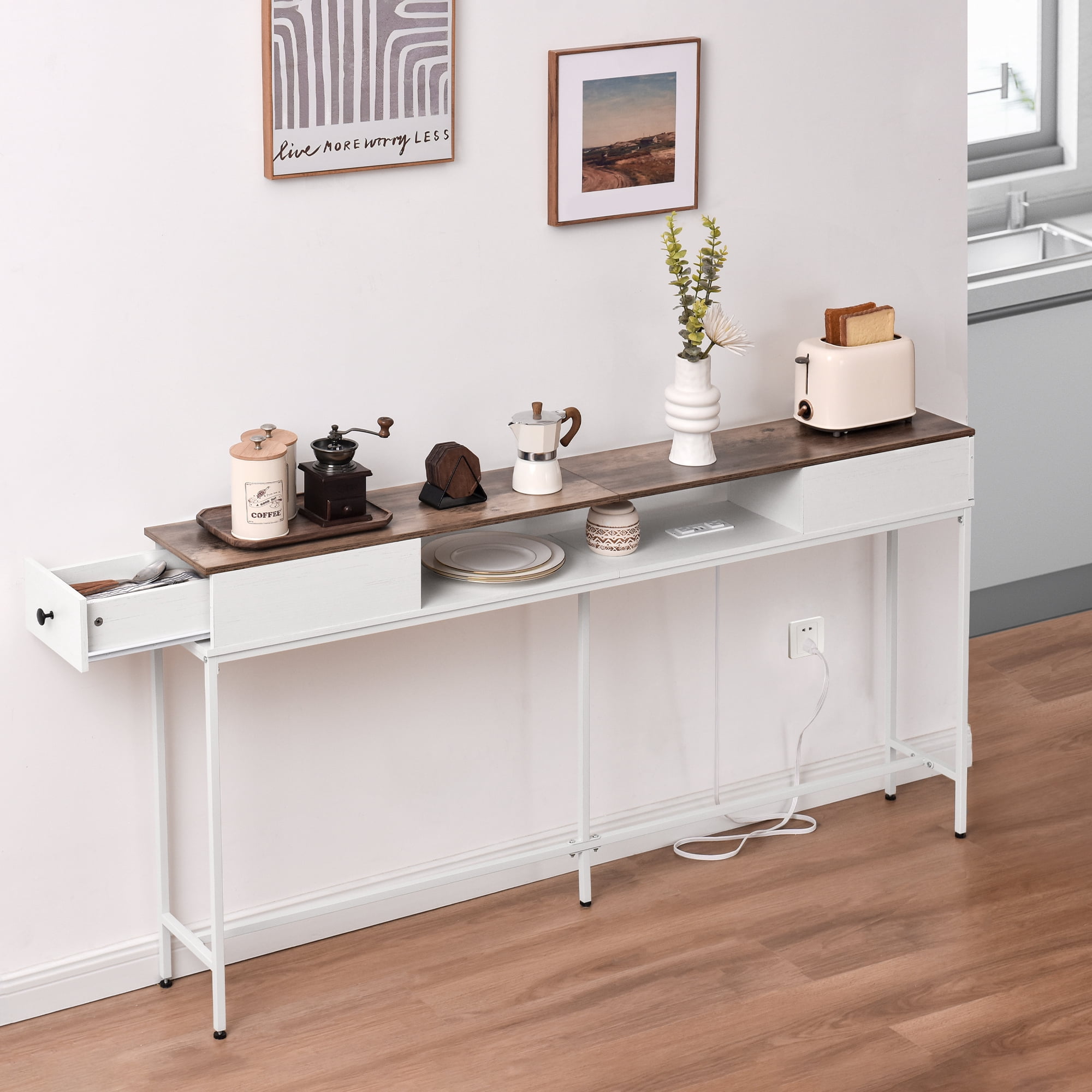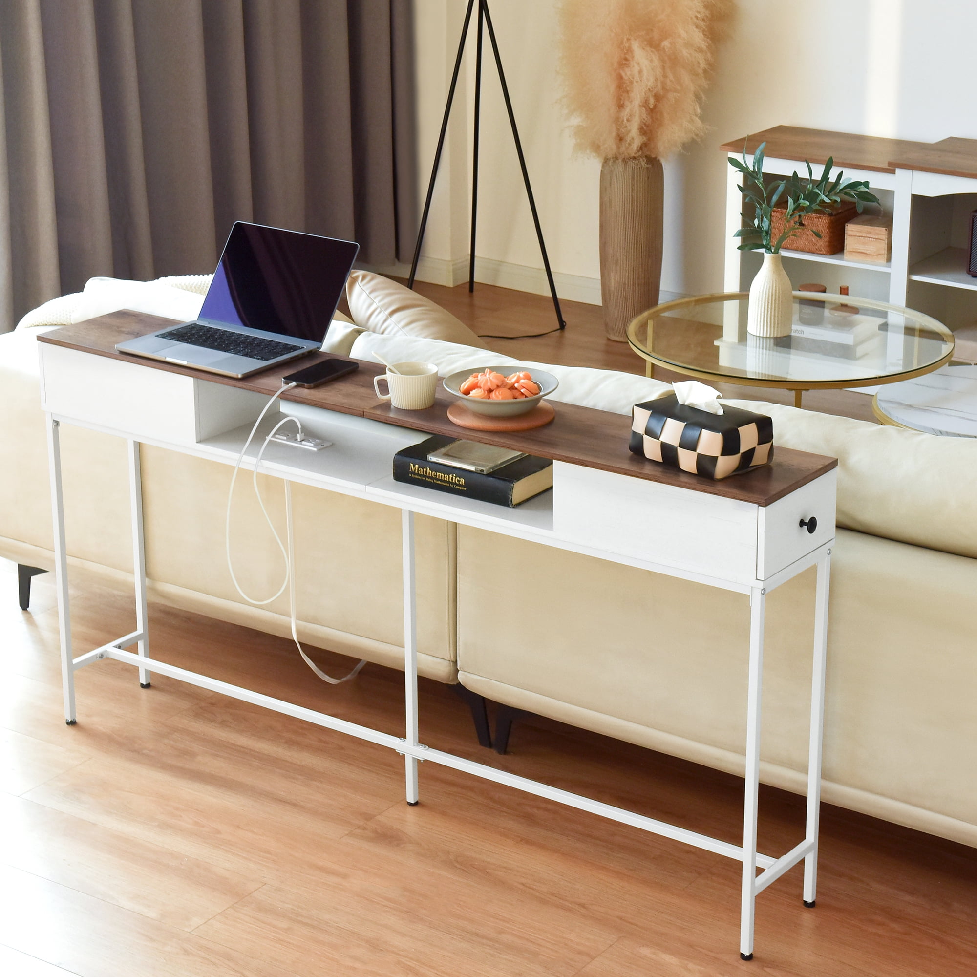 Elongated and narrow construction Adjustable feet and anti-tip kit to keep the table balanced Two drawers for storing things like keys, notepads, and jewelry The outlet fits 2 bulky plugs and 2 USB plugs without blocking each other
