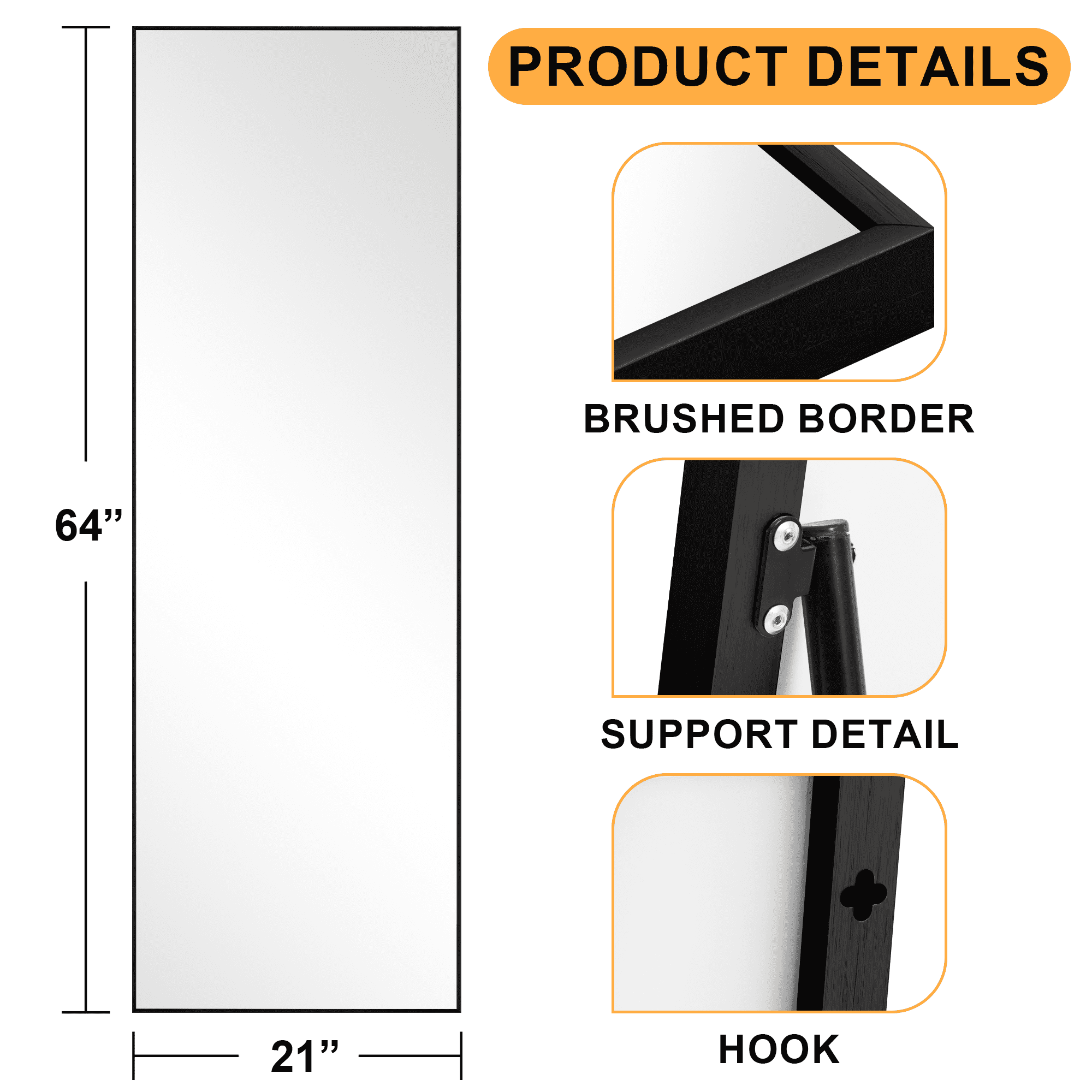 Unique Design:The top of the floor mirror is designed with a classic smooth rectangle top frame,which especially attracts people’s attention and highlights the beauty of the mirror. Full Length Mirror:This is a 64″x21″ full scize mirror.It can be leaned to the wall or free-standing with the stand anywhere in your room.It also can be hanged vertically to create an illusion of wider space. High-quality Glass:The full body mirror is made of high-quality float glass which can provide super HD imaging and undistorted reflection. Easy Installation:Our full-length mirrors can be safely stood anywhere in your room or leaned on the wall.It can also be mounted on the wall by simply taking off the bracket.