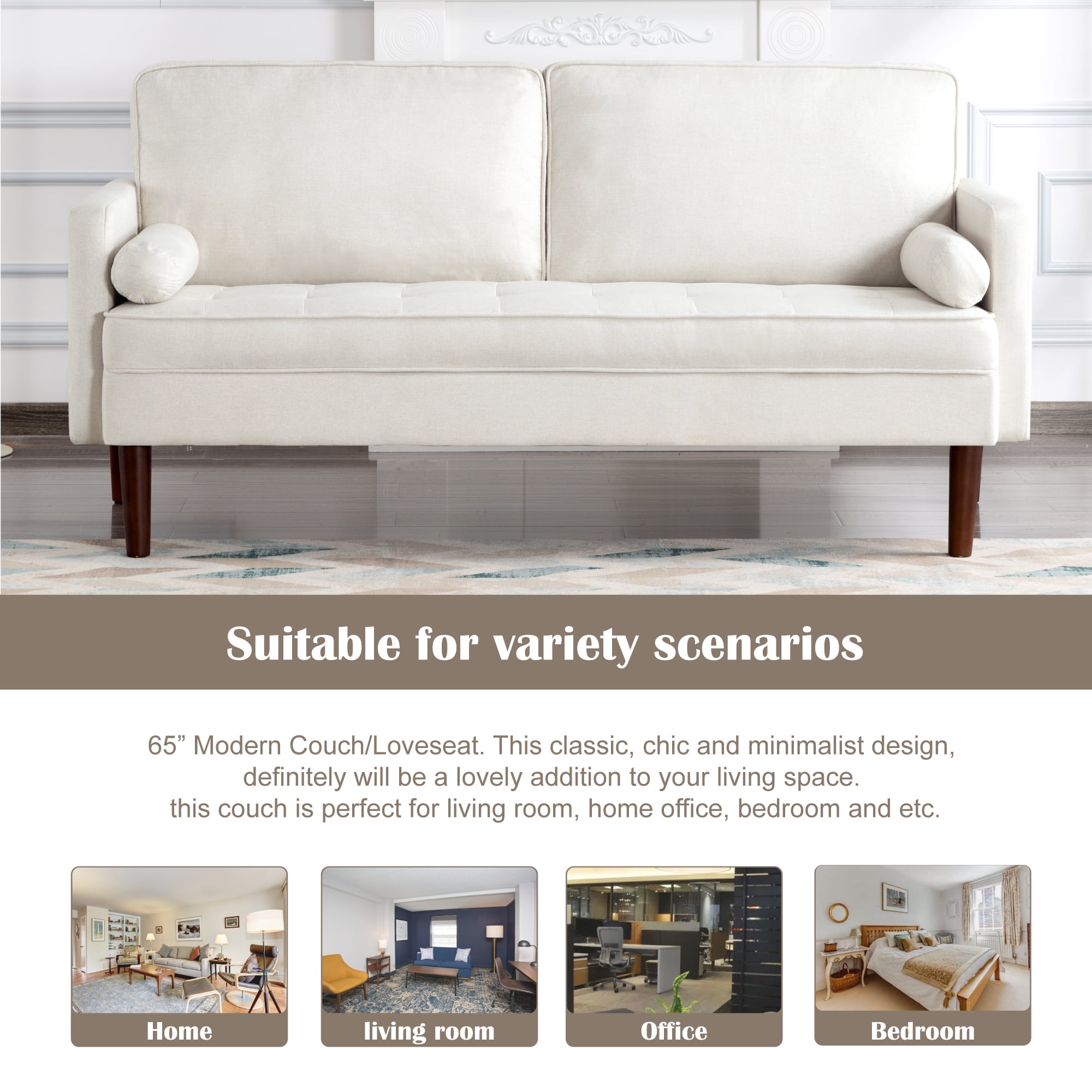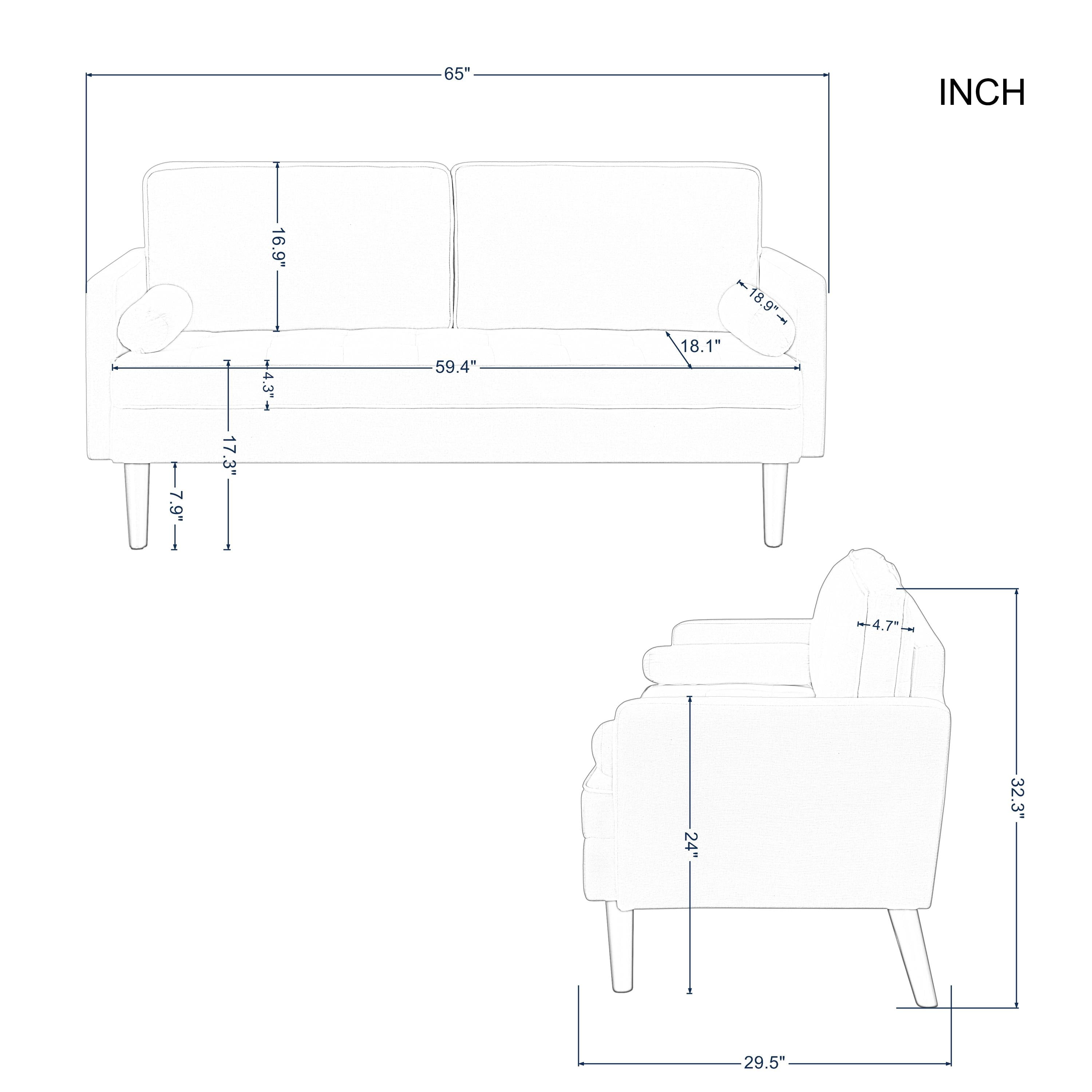 65” Modern Couch/Loveseat. This classic,chic and minimalist design,definitely will be a lovely addition to your living space. this couch is perfect for living room,home office,bedroom and etc. Weights & Dimensions Overall size:65”x29.5”x32.3”H Seat Height:17.3” Back Height:16.9” Arm Height:24” Minimum door width:11” Product Weight:71.5 LBS Package Weight:78.26 LBS Carton size:60.63×21.26×11.02” Specifications Product Type:Couch/Loveseat Number of Pieces:1 Seating Capacity:2 Upholstery Material:Polyester Seat Fill Material:Foam Back Fill Material:SyntheticFiber Frame Material:Solid + Manufactured Wood Seat Construction:Solid Wood + Sinuous Spring Leg Material:Rubber wood Leg Color:Brown Back Type:Cushion back Arm Type:Square arm Back & Seat:Back cushion is removable Toss Pillows:Yes,2pcs Wood Species:Eucalyptus Joinery:Corner-block-reinforced Main Wood Joinery Method:Basic Butt Kiln-Dried Wood:Yes Weight Capacity:300LBS Product Care:Wipe clean with dry cloth,do not use strong liquid cleaners Intended Use:Residential Use 2 same color bolster pillows included.Hidden package: the parts and hardware are put underneath of the sofa. Please check it before assemble. This sofa is packed in one box and all tools included,please contact us to get installation video if there are any questions.