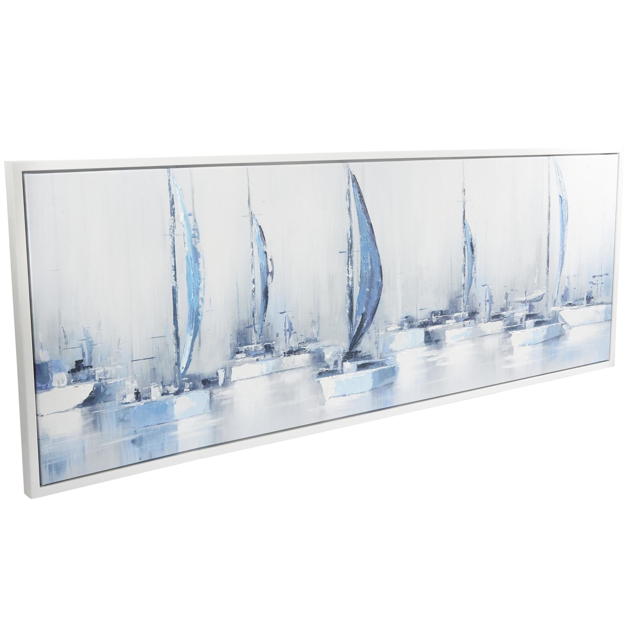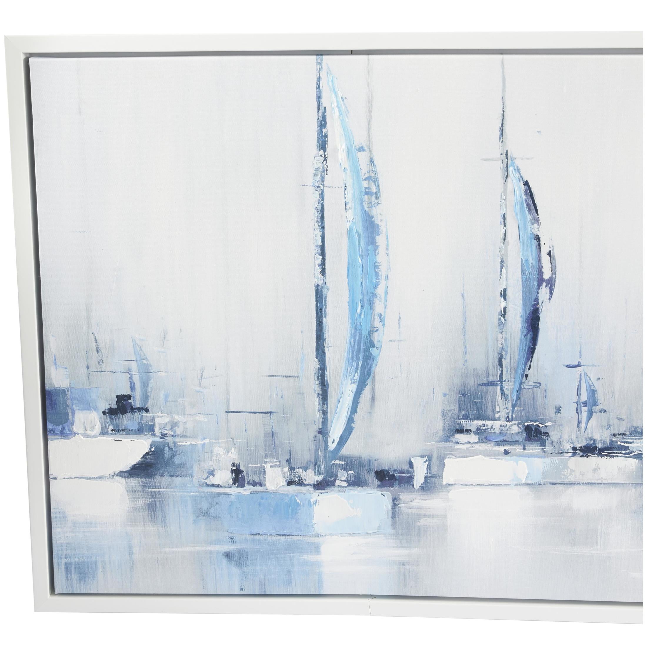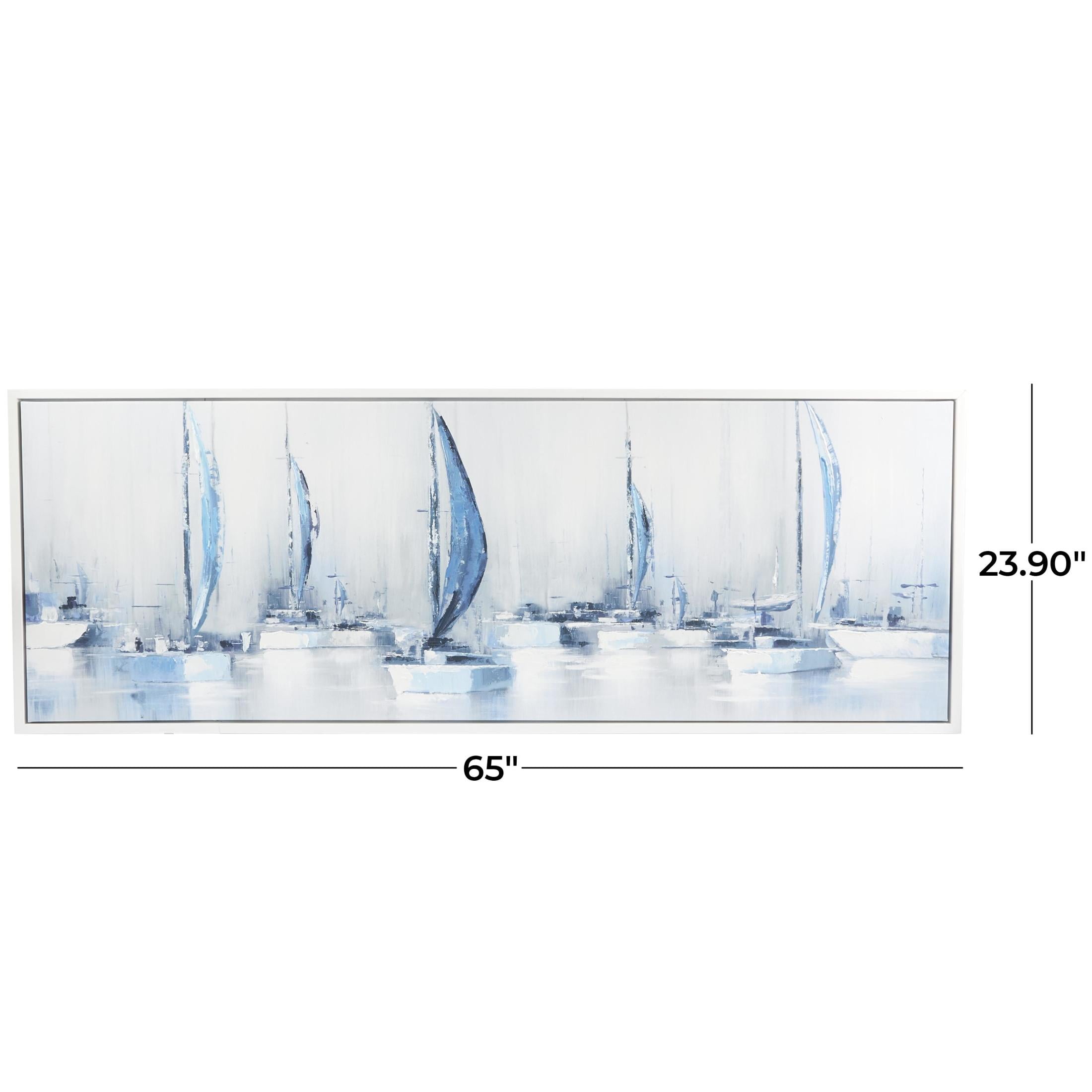 65″ x 24″ Sail Boat Framed Wall Art with White Frame, by DecMode is a unique addition to your stylish home. This sailboat canvas wall art enhances the dimensional aesthetic of your blank walls and is best displayed above the sofa or a wooden console table in your living room. This item ships in 1 carton. Can be hung vertically using the sawtooths; nails and screws not included. Suitable for indoor use only. This item ships fully assembled in one piece. This is a single blue colored canvas wall art. Coastal style.