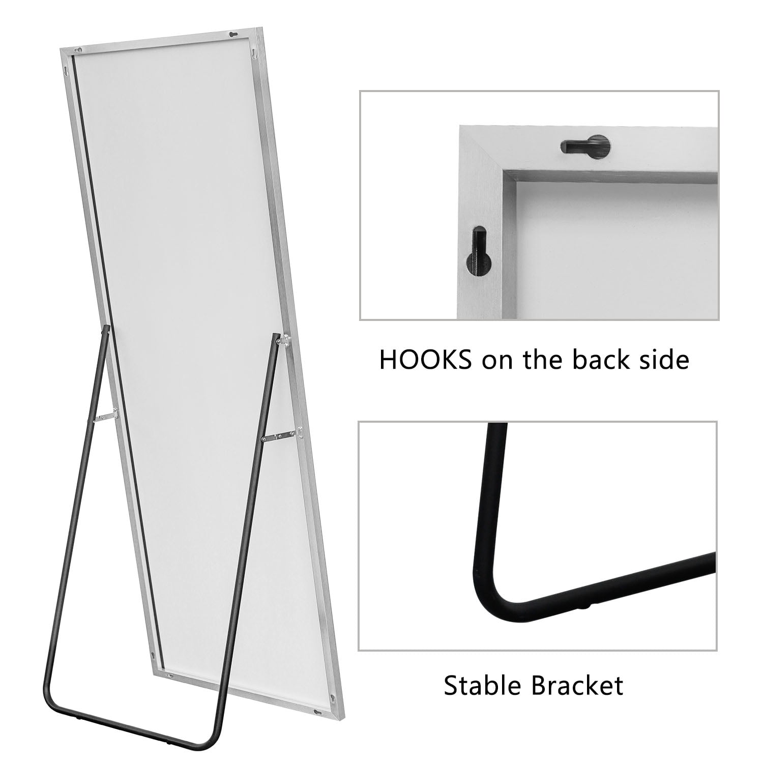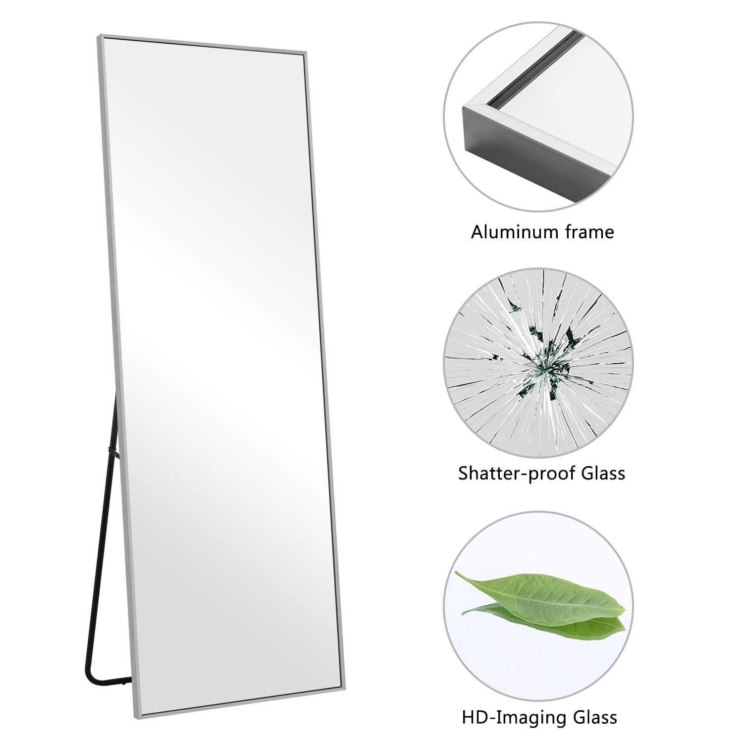 Aluminum Alloy Frame for durability and style. Shatter-proof Glass ensures safety and peace of mind. HD-Imaging Glass captures every detail with exceptional clarity. Hooks and Stable Bracket provide versatile placement options. Floor Mirror or Wall-Mounted, choose the configuration that suits your space.