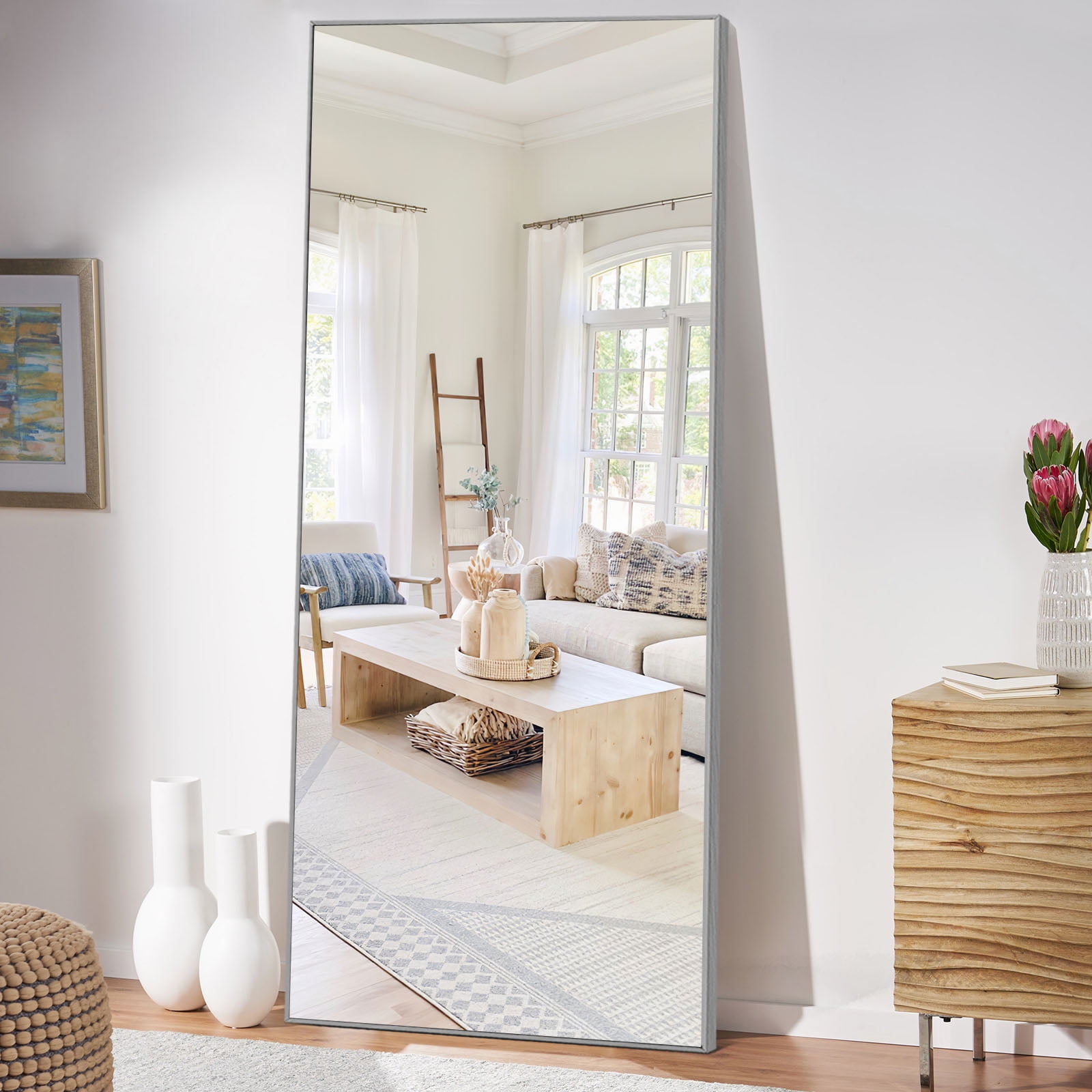 Finding the perfect mirror for your space is no easy task,but this Neutype full length floor mirror fits the bill with its exquisite workmanship and easy installation. The high-quality aluminum frame ensures durability while maintaining a sleek,shiny appearance,and an explosion-proof membrane protects the glass from harm. Multiple packing materials keep it safe for travel. Simply pull out the included bracket to use it free-standing,or install it on the wall following the easy-to-follow manual. Beyond functionality,its high-definition glass and silver coating provide distortion-free reflections to truly see yourself. With options for placement on the floor or wall,horizontally or vertically,this versatile full mirror brings beauty to any vintage or modern environment.