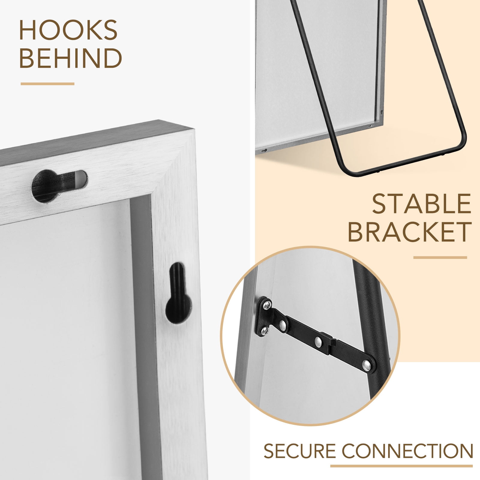 EXQUISITE WORKMANSHIP:The full body mirror is made of high-quality aluminum alloy frame,which is durable and has a shiny appearance.The sides of the floor mirror are smooth.We have added an explosion-proof membrane to prevent the mirror from being broken and hurting people.We use multiple packing materials to pack the floor mirror to protect the mirror. EASY TO INSTALL:The full mirror has a bracket and just easily pull out the stand in seconds to use it.If you want to hang it on the wall,we have attached an installation manual in the box,and you can install it easily according to the installation instructions. HD Imaging:The floor mirror glass is high-definition and is clear with great reflective value with no distortion.The full length mirror uses high definition imaging to truly restore and reflect the real world.High transparency glass and quality silver coating will also give you a good image on top.Designed with simplicity and precision,rectangle frame,clean and sleek surface,aesthetic styling,with tight black alloy frame,perfect for both vintage and modern style environments. MULTIPLE PLACEMENT METHODS:The full length mirror is with a stand and can stand everywhere.The floor mirror can be leaned against the wall anywhere.The mirror can be hung on the wall horizontally or vertically as a wall mounted mirror.