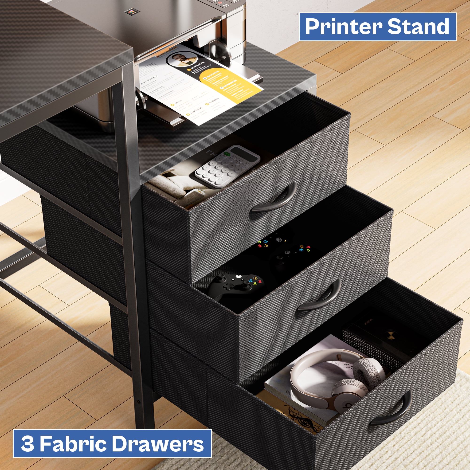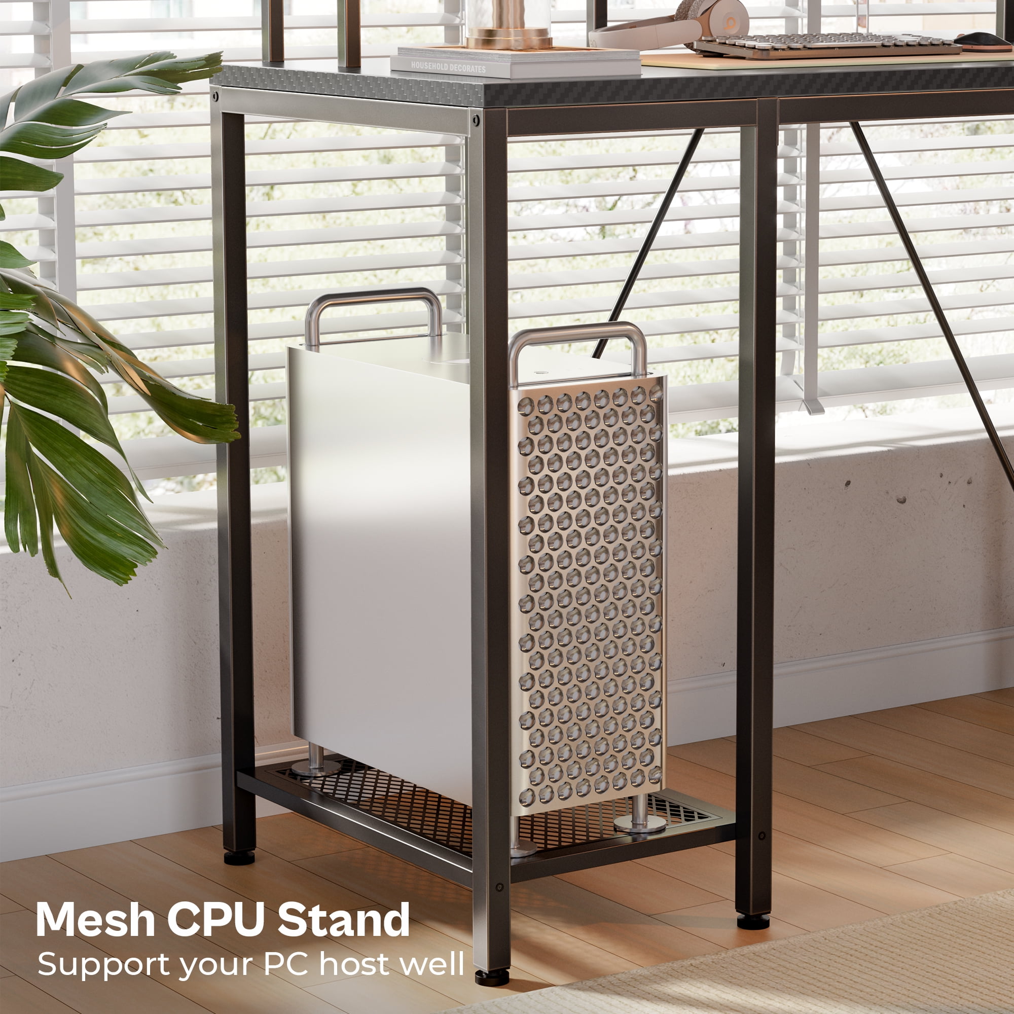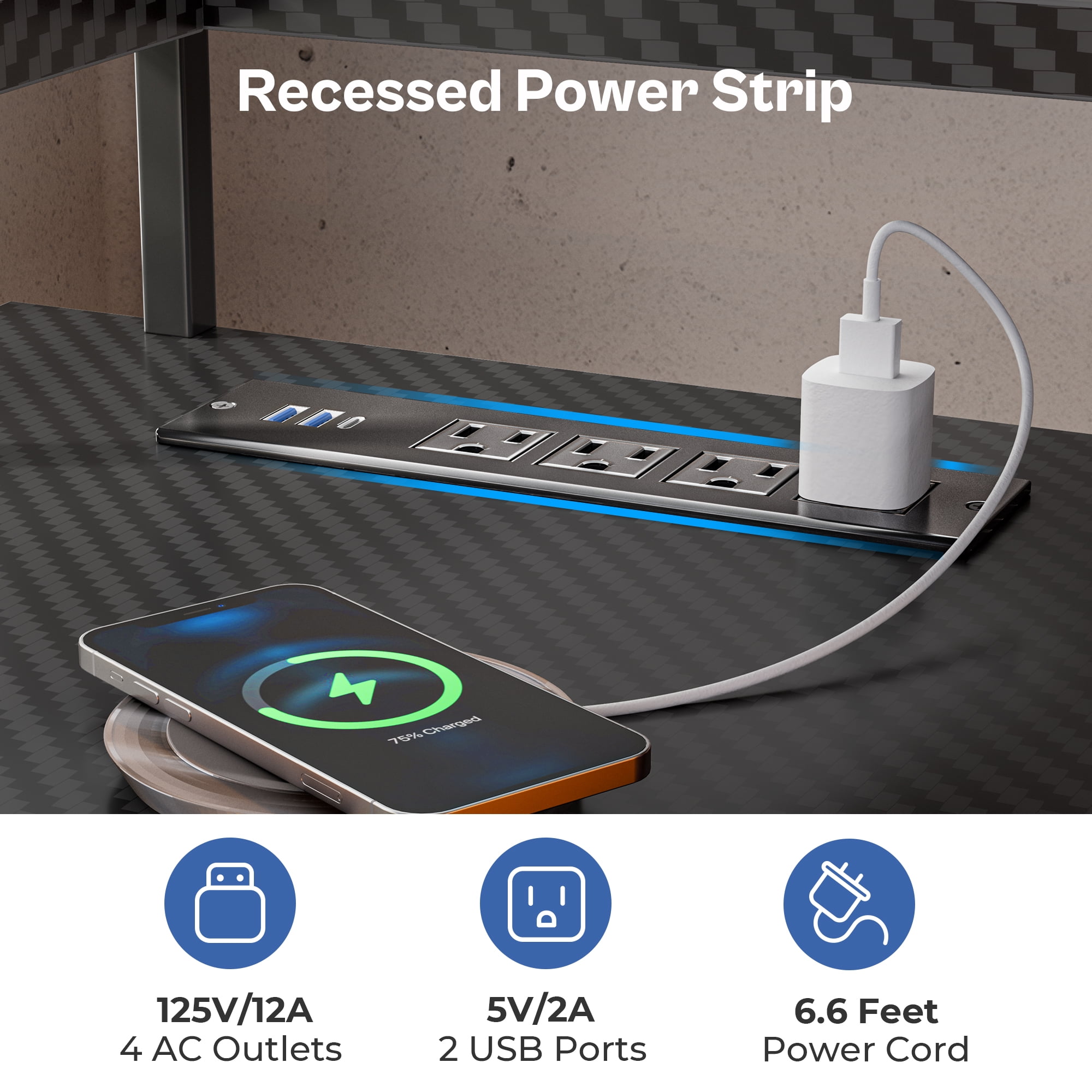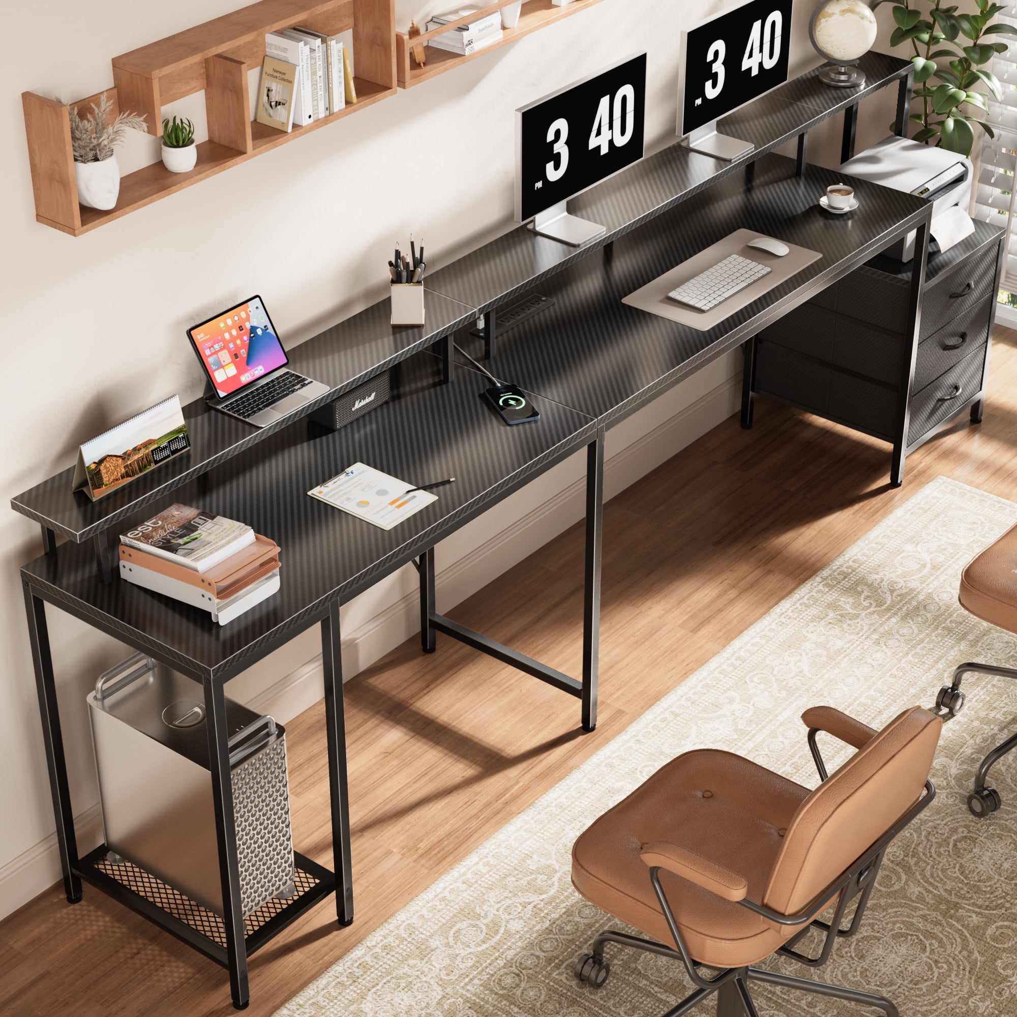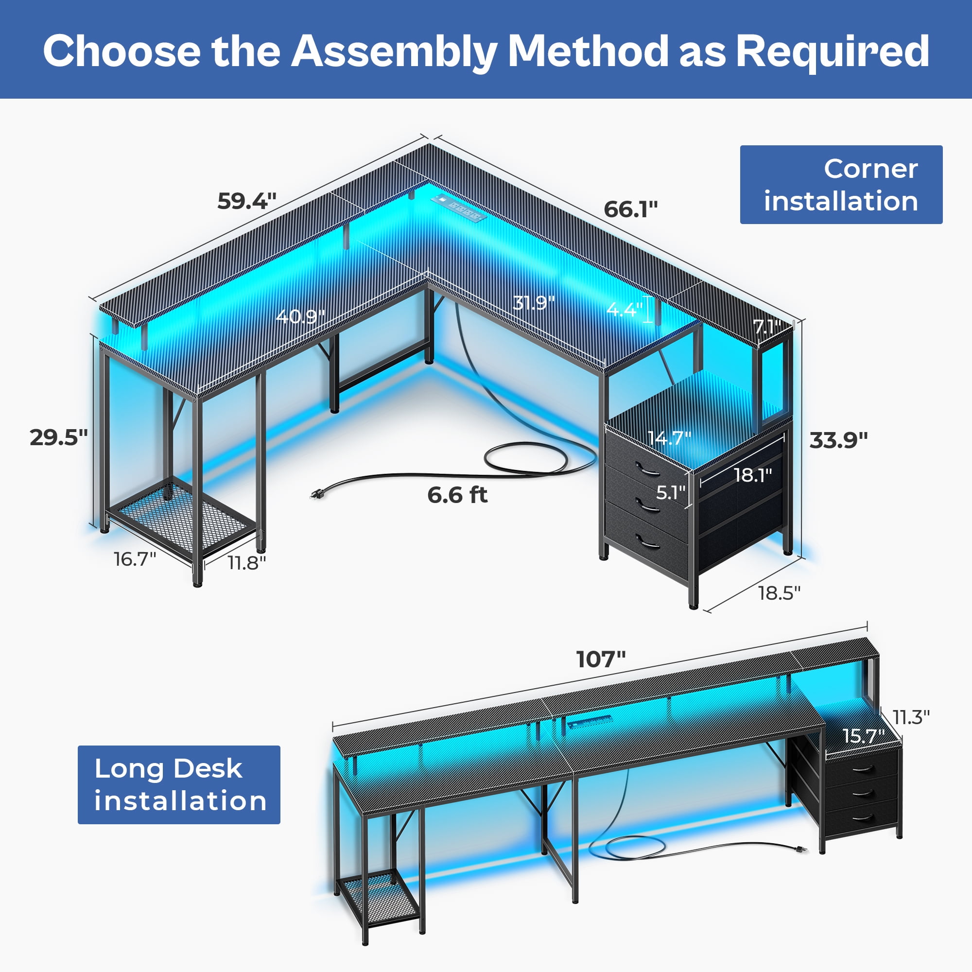 LED Computer Desk: This l shaped gaming desk is equipped with RGB LED lights, offering 22 dynamic modes, 20 colors, and 5 brightness levels, which creates a vibrant gaming or home office space. Includes a patent-pending drawer slide. AC Outlets and USB Ports: This gaming desk features 4 AC outlets and 2 USB ports for convenient charging, reducing wire clutter. Versatile for writing, home office, study, or as an L desk for corners. Spacious Storage: This office desk can accommodate 2 people with ample storage. L-shaped installation maximizes corner workspace, and elevated monitor stands enhance comfort. More Refined Details: L shaped desk with 3 fabric drawers and a printer stand for organized storage. Mesh tower supports the CPU, and adjustable feet ensure stability and protect desktop items. Solid Frame, Easy Assembly: With sturdy steel frame and P2 Particle Board, this desk with drawers will serve a long time. Clear labeling, attached tools, and instructions simplify assembly. Specifications: Dimension:66.09″D*18.47″W*29.47″H Style: Industrial & Modern Material: Carbon Fiber & Steel & Particle Board Gaming Configuration: RGB LED lighting & Power Outlets Office Configuration: 3 Fabric Drawers & Monitor Stand & CPU Stand & Printer Stand