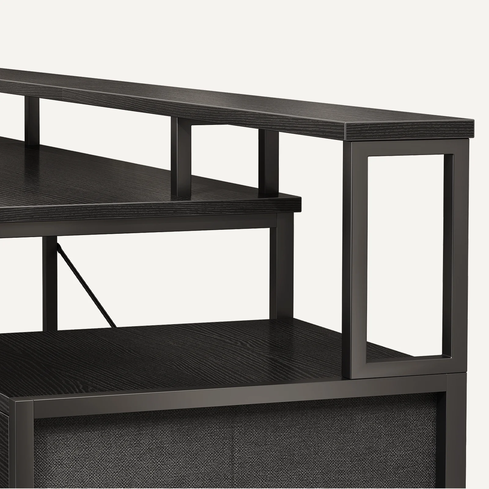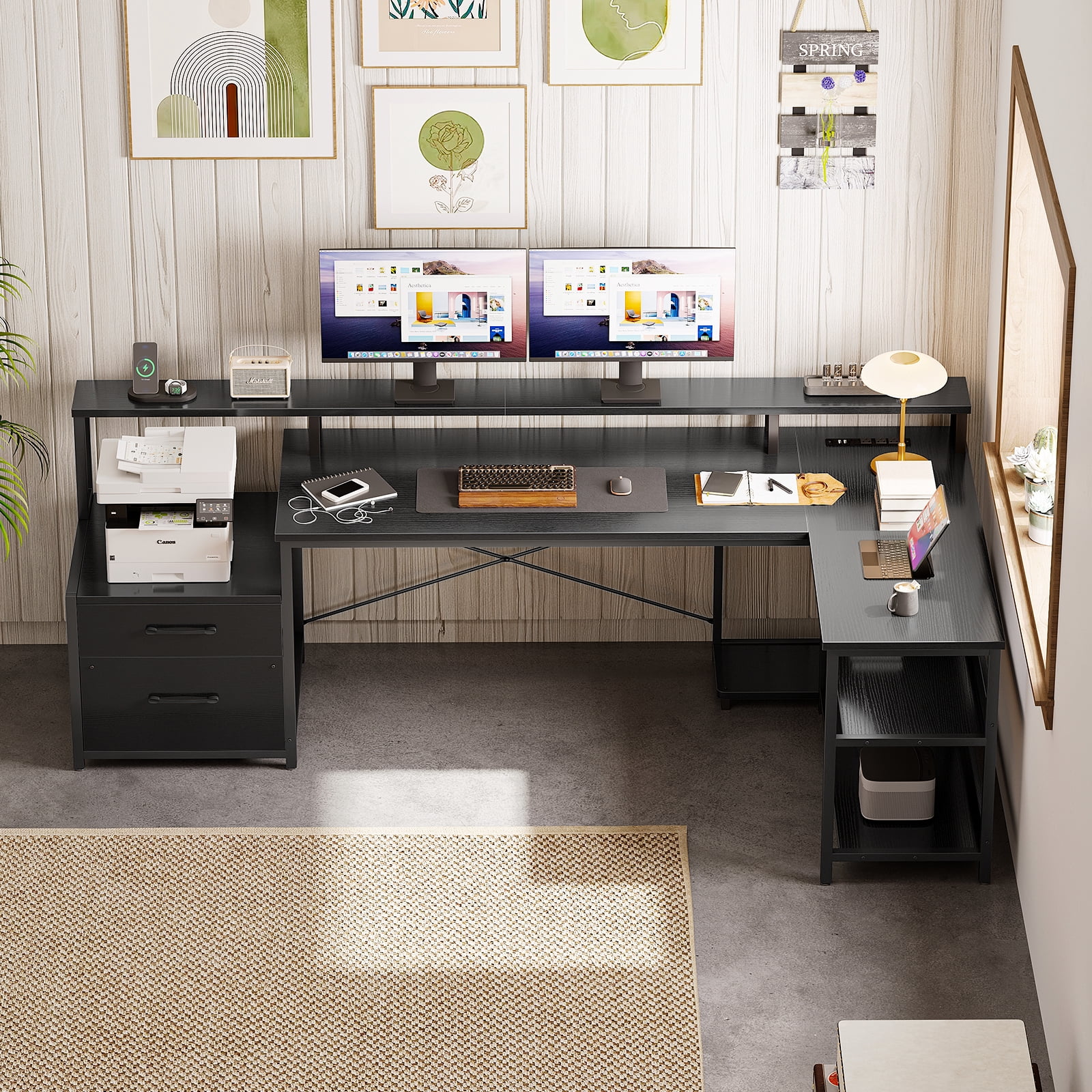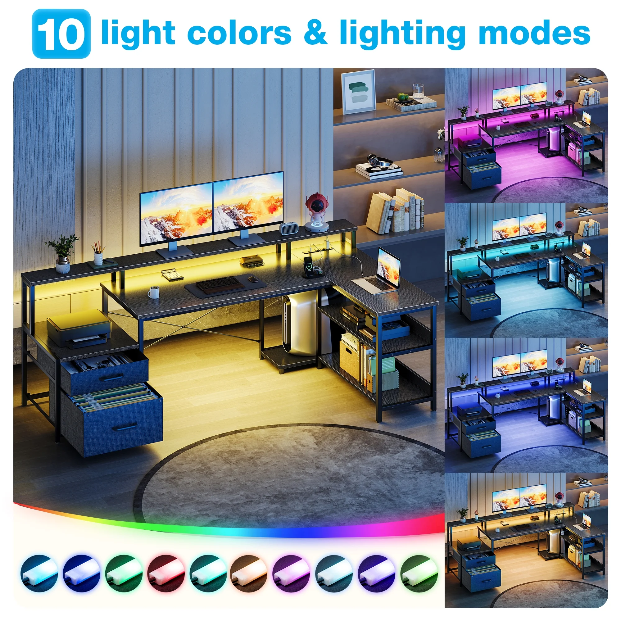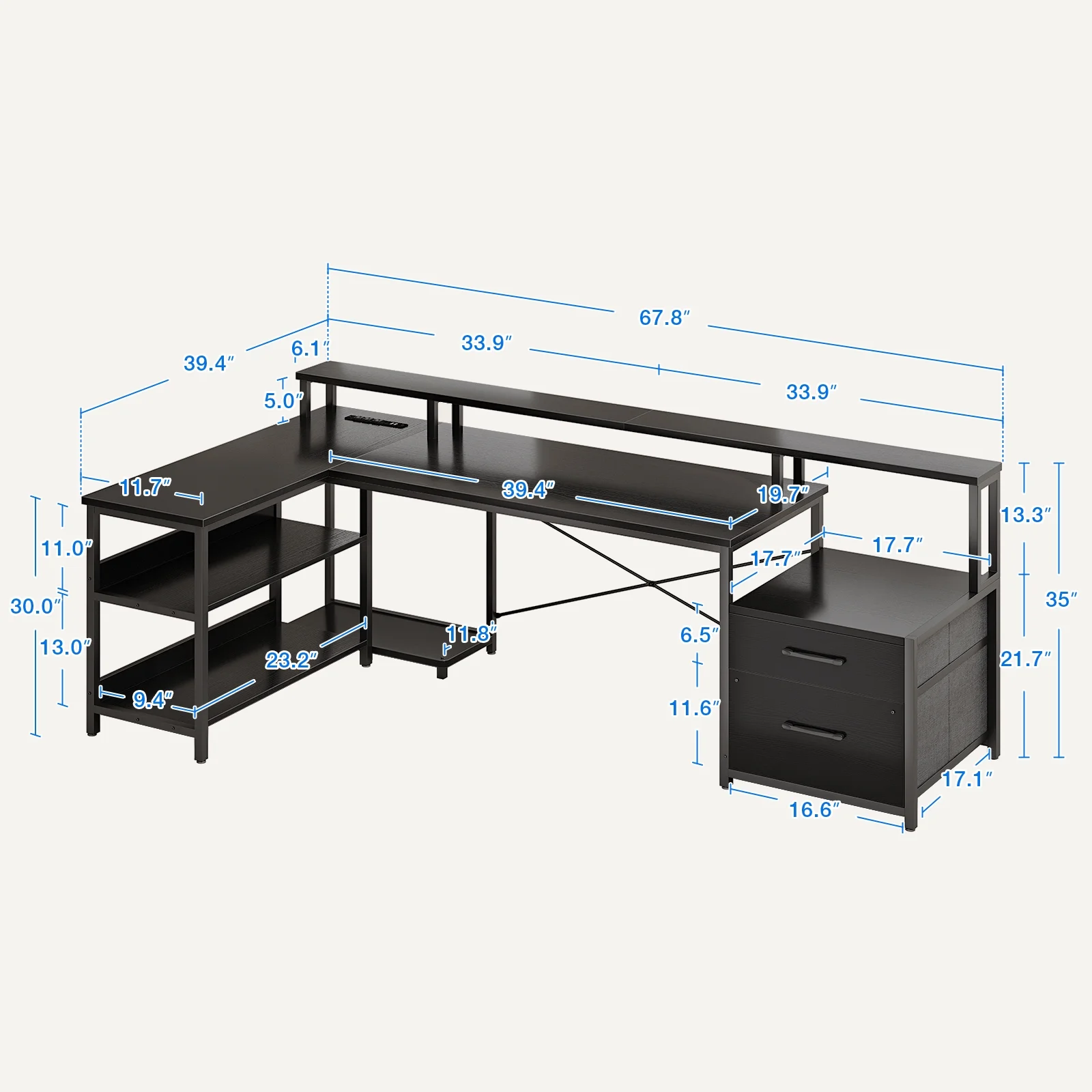 Convertible Desk: 68 inch home office desk: The L shaped computer desk could hold three desktop computers and one printer. The desktop size is 39.3″L*19.7″W and 39.3″L*11.7″W. The simple design and multi-function storage to meet all needs. An ideal desk for small rooms or limited spaces to create excellent home office space. Ample Storage Space: Coming with a file drawer, printer cabinet and 3 tier storage shelves, with powerful storage space. File cabinet can hold letter /A4/ legal size files. This solid constructed L shaped computer desk could hold printers, scanners, fax machines and any other office machines, keeps printer or scanner within easy reach of your desk to free up work space. CPU stand protects the host from moisture and dust. This L shaped computer desk is economic, meets different storage need. Colorful Led Light Strip: This gaming desk comes with RGB LED light strip, offering 10 colors and modes for your to choose. And with timer function, just enjoy it in a smart way, create gaming and working atmosphere. Monitor Shelf: The monitor shelf conforms to the ergonomic structure, which effectively reduces the pressure on the back and neck, so that you don’t need to worry too much about health problems when you were working. Also,the charging station includes 3 Outlets and 2 USB Ports to provide power for up to 5 devices simultaneously.