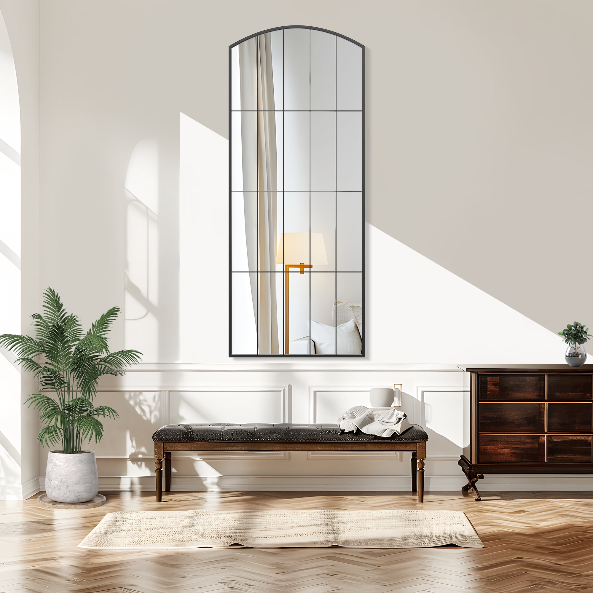 Elegant Design: The mirror features a sophisticated wrought iron grid pattern that adds a touch of vintage charm and elegance to any room. The slightly arched top provides a subtle, stylish accent that sets this mirror apart from standard rectangular designs. Durable Construction: Crafted from high-quality wrought iron, this mirror is built to last. The sturdy frame ensures long-term durability and stability, making it a reliable addition to your home decor. Versatile Placement: Its sleek black finish and timeless design make it a versatile piece that complements a variety of interior styles, from modern to classic. Whether placed in a bedroom, hallway, or living room, it enhances the space with its chic presence. Full-Length Viewing: The generously sized mirror offers a comprehensive view, perfect for outfit checks and adding depth to any room. Its full-length design makes it an essential piece for anyone looking to add both functionality and style to their home.