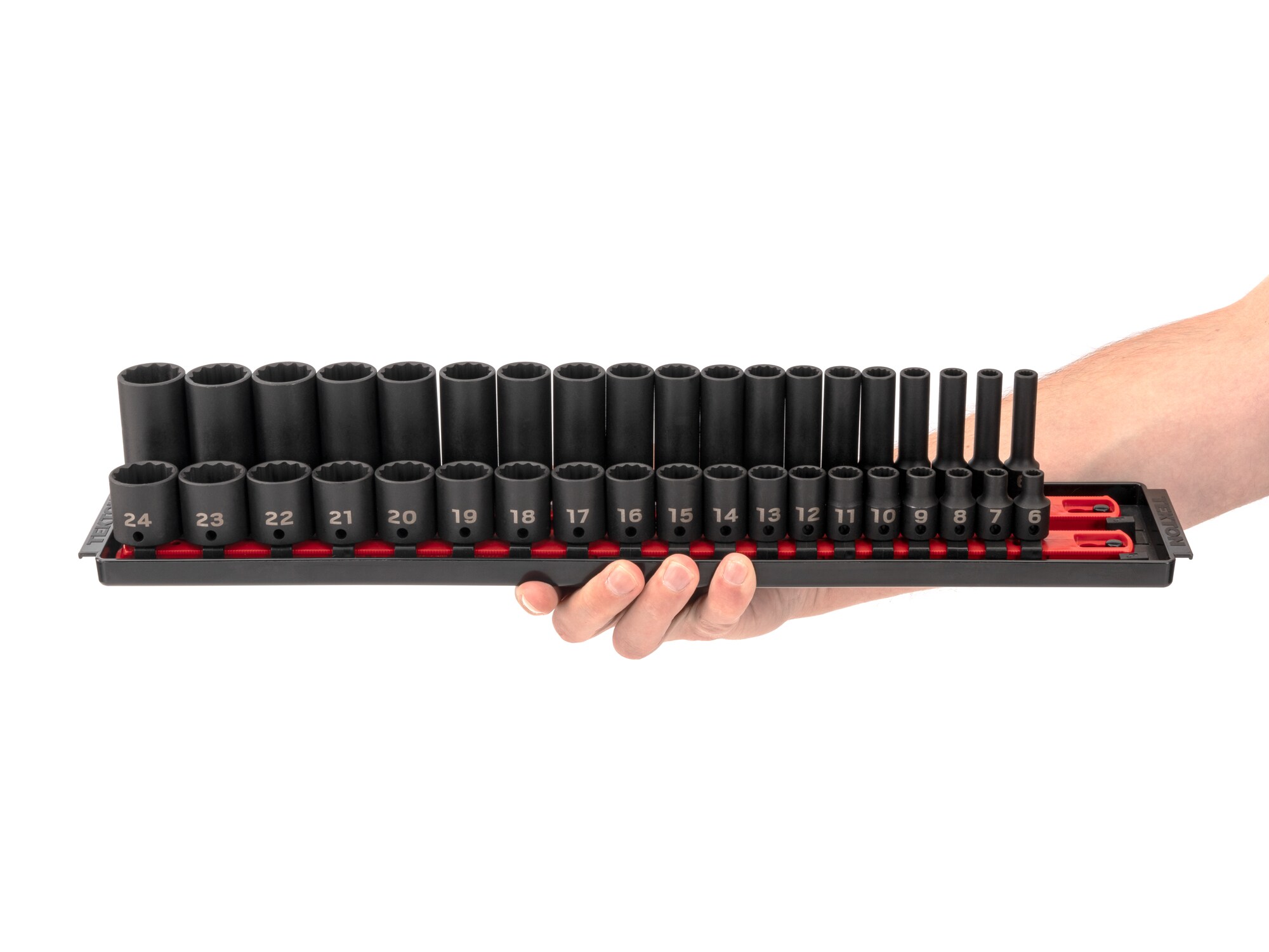 TEKTON impact sockets have both a high-visibility laser marking and a permanent stamped marking that won’t wear off. They’re designed for use with both friction ring anvils and detent pin anvils. Precise 12-point opening fits double hex (12-sided), hex, and square-shaped fasteners. Each socket size meets a minimum of 1.3 times the ANSI/ASME standard for proof torque.