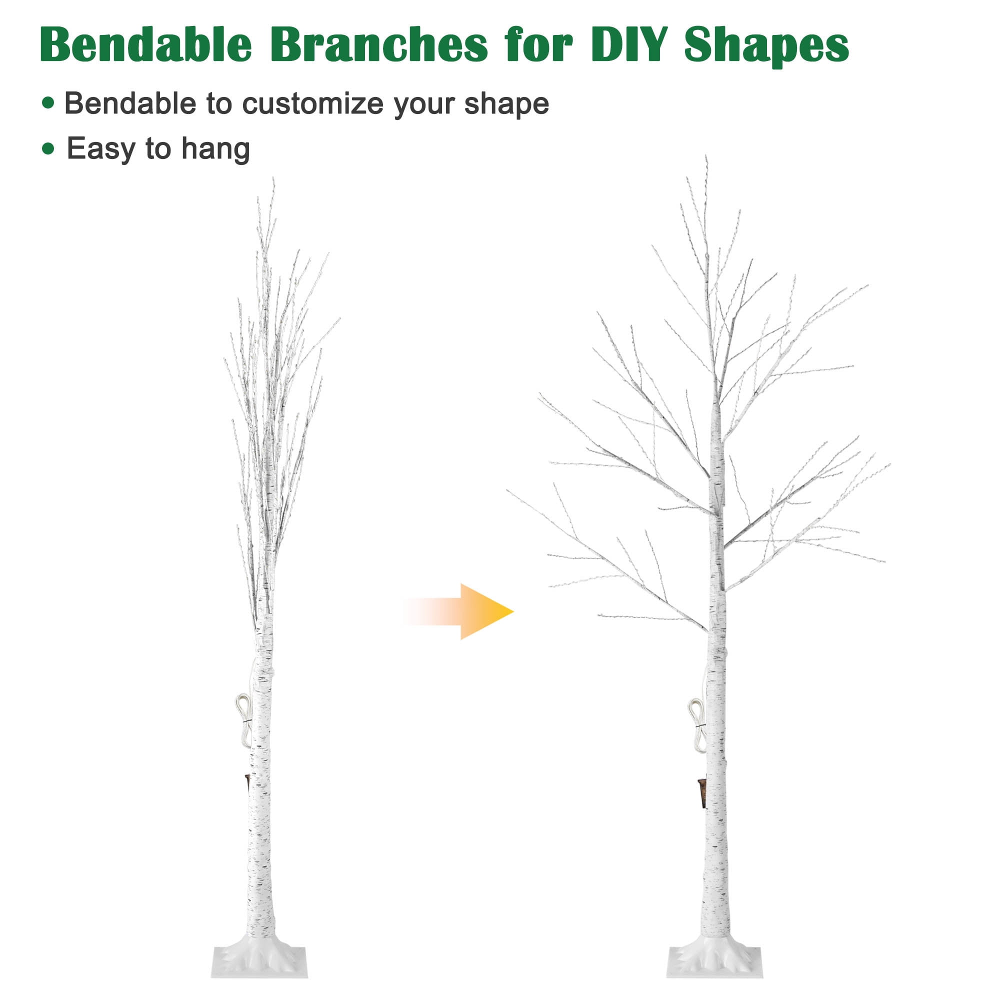 [Birch Tree with Lights] – 6-foot white artificial birch tree decoration with 305 warm white LED lights sprinkled through the branches for an elegant holiday look, also gives a gentle feeling in your decorative area. [Durable Material] – Birch tree made of plastic and iron, stable base of the square stand with sturdy trunks and bendable branch can be customized in any shape. [Unique Design] – The branch is flexible enough to be bent into any shape as you wish, as well as lightweight to move around easily and bring convenience to storage. [Perfect Decoration] – Light up or not, they are simple but elegant for home, wedding, garden, bedroom, festival, party centerpiece. Indoor and outdoor use. [Premium After-Sales Service] – If there is any question, please feel free to contact us. Our experienced customer service team will respond in 24 hours ASAP, providing every customer with the most satisfactory products and services.