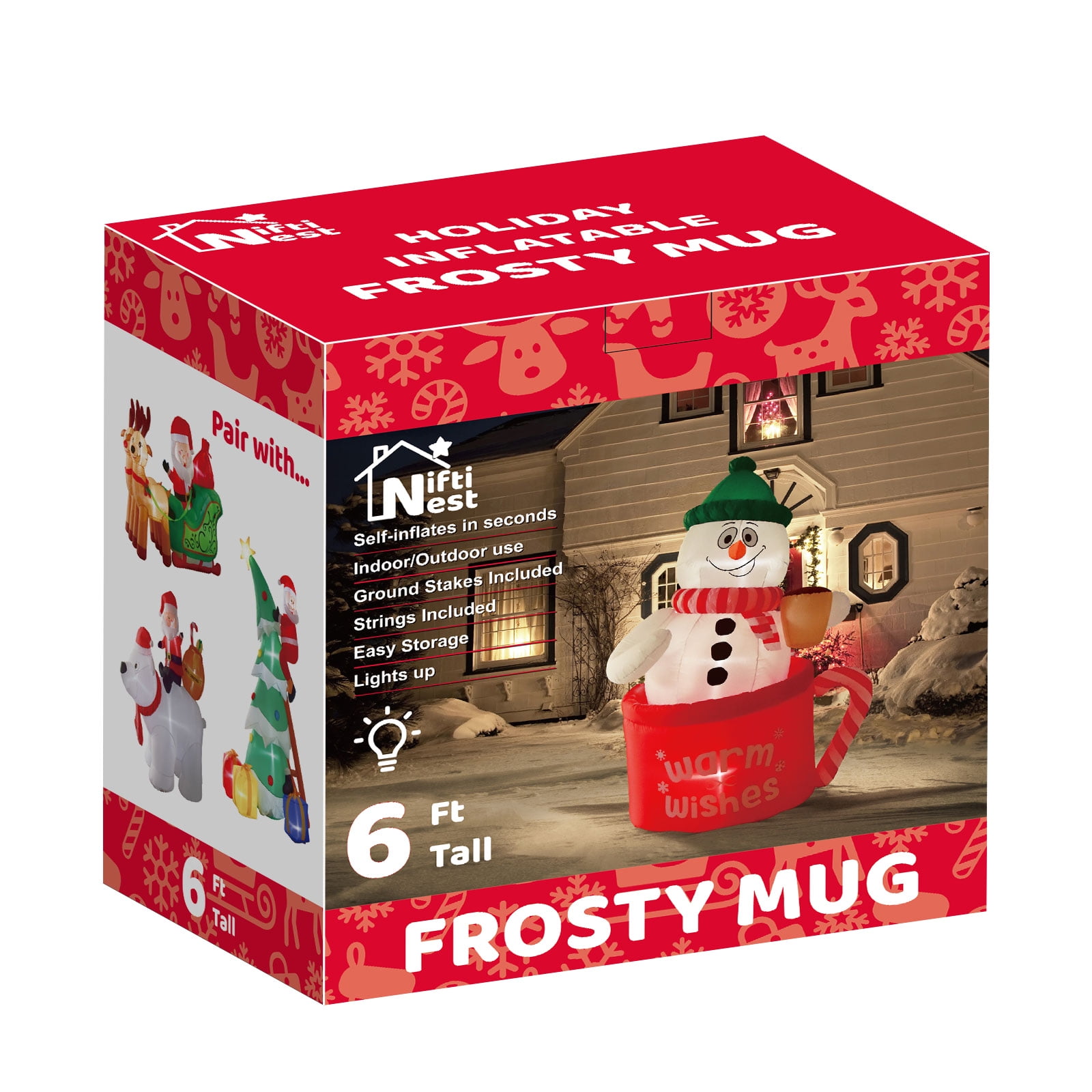 The Frosty Mug from Nifti Nest features 1 Snowman, 2 Cozy Christmas Mugs – one of which includes a classic Christmas Candy Cane Handle! All of these classic holiday designs stand at a looming 6’ Feet in Height, making for an unforgettable lawn to be enjoyed by all around. These outdoor Christmas decorations arrive colored in beautiful and bright reds, greens, and whites!